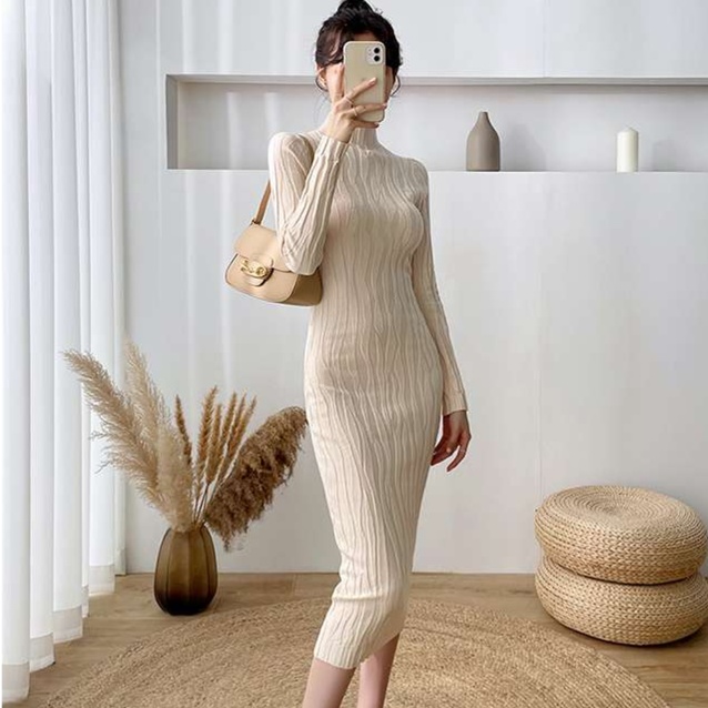 骨格ウェーブロングワンピース リブ編み縦効果上品スタイル
