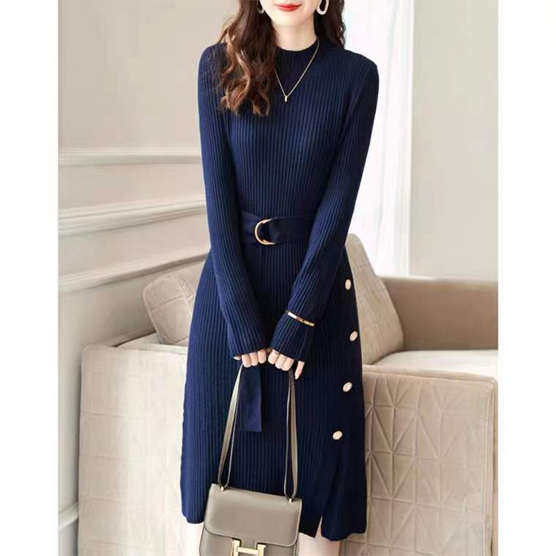 骨格ウェーブ向け冬服リブ編みベルト付きタートルネックワンピース