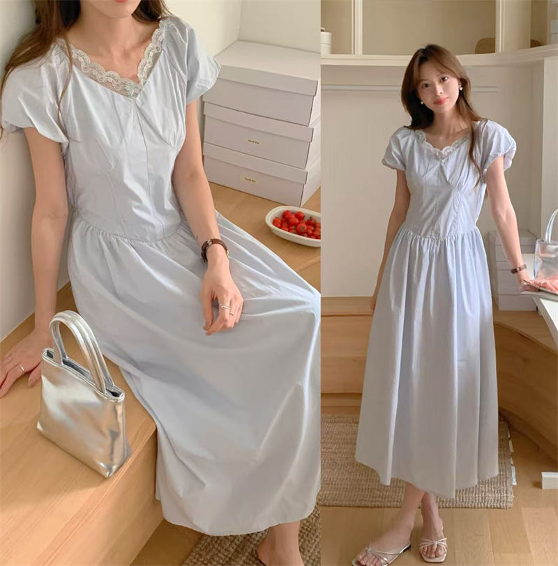 骨格ストレートが美しく見える夏服レース襟パフスリーブワンピース