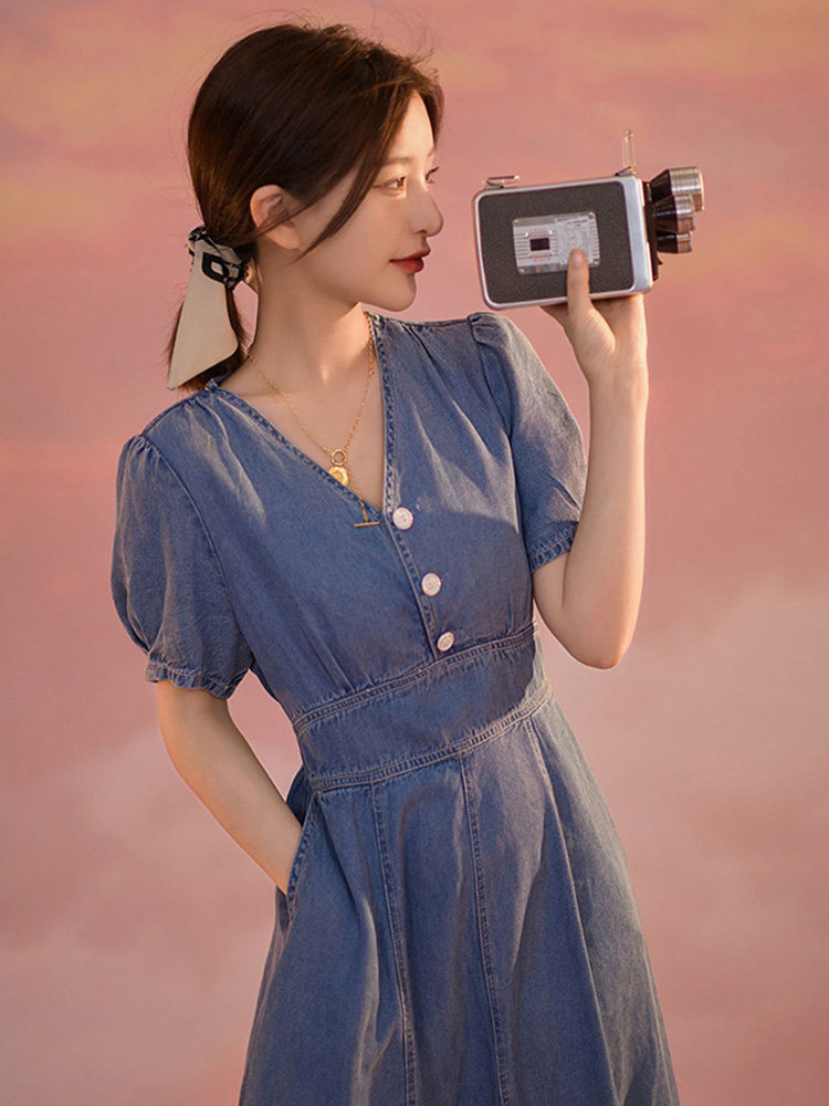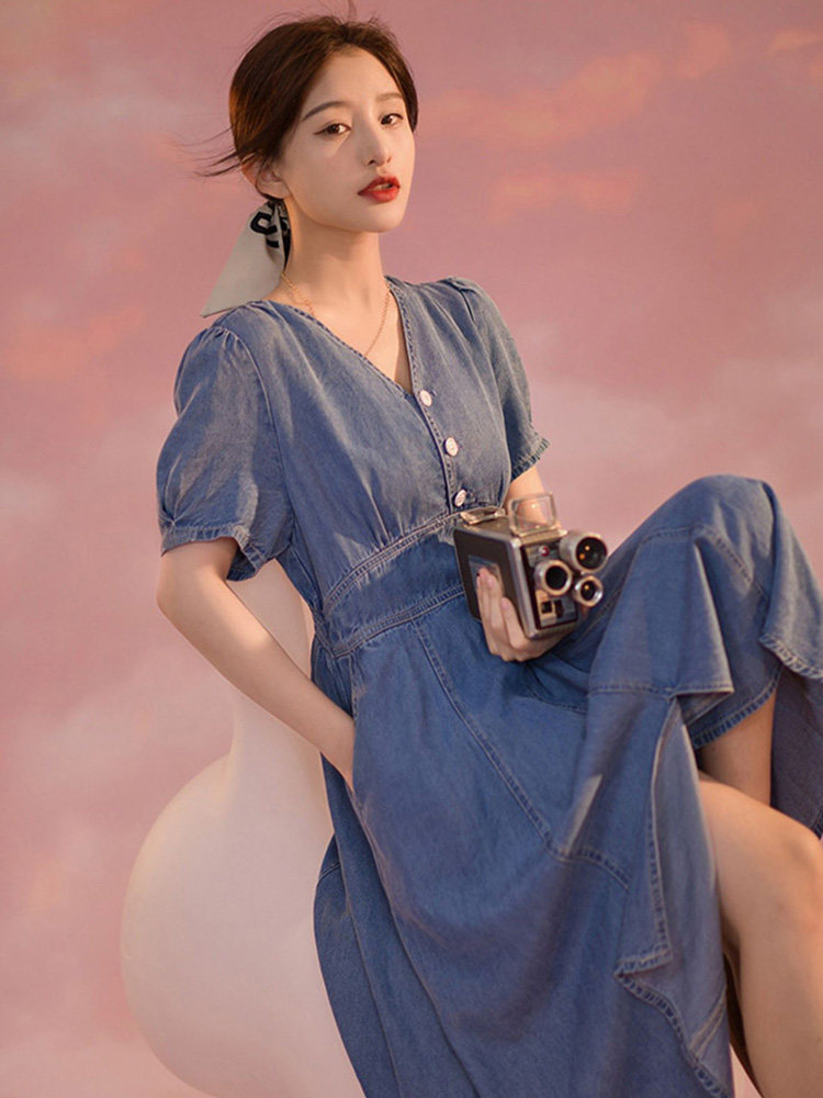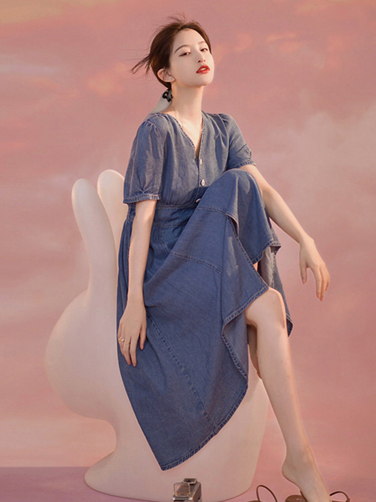 -10%デニム素材で仕立てた爽やかなシャツワンピースです。 深めのVネックと可愛らしいパフスリーブが女性らしさを演出し、ウエストマークのデザインがすっきりとしたシルエットを作ります。 フロントのボタンと裾のスリットがアクセントになったロングワンピースは、カジュアルにもきれいめにも着こなせる万能アイテムです。 一枚でコーディネートが完成する、デイリーユースに最適なシャツタイプのワンピースです。