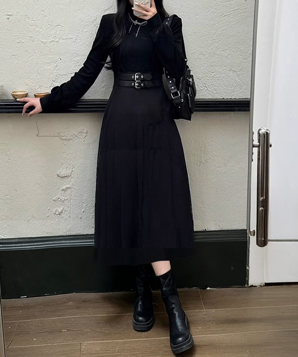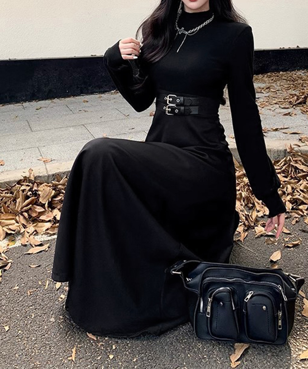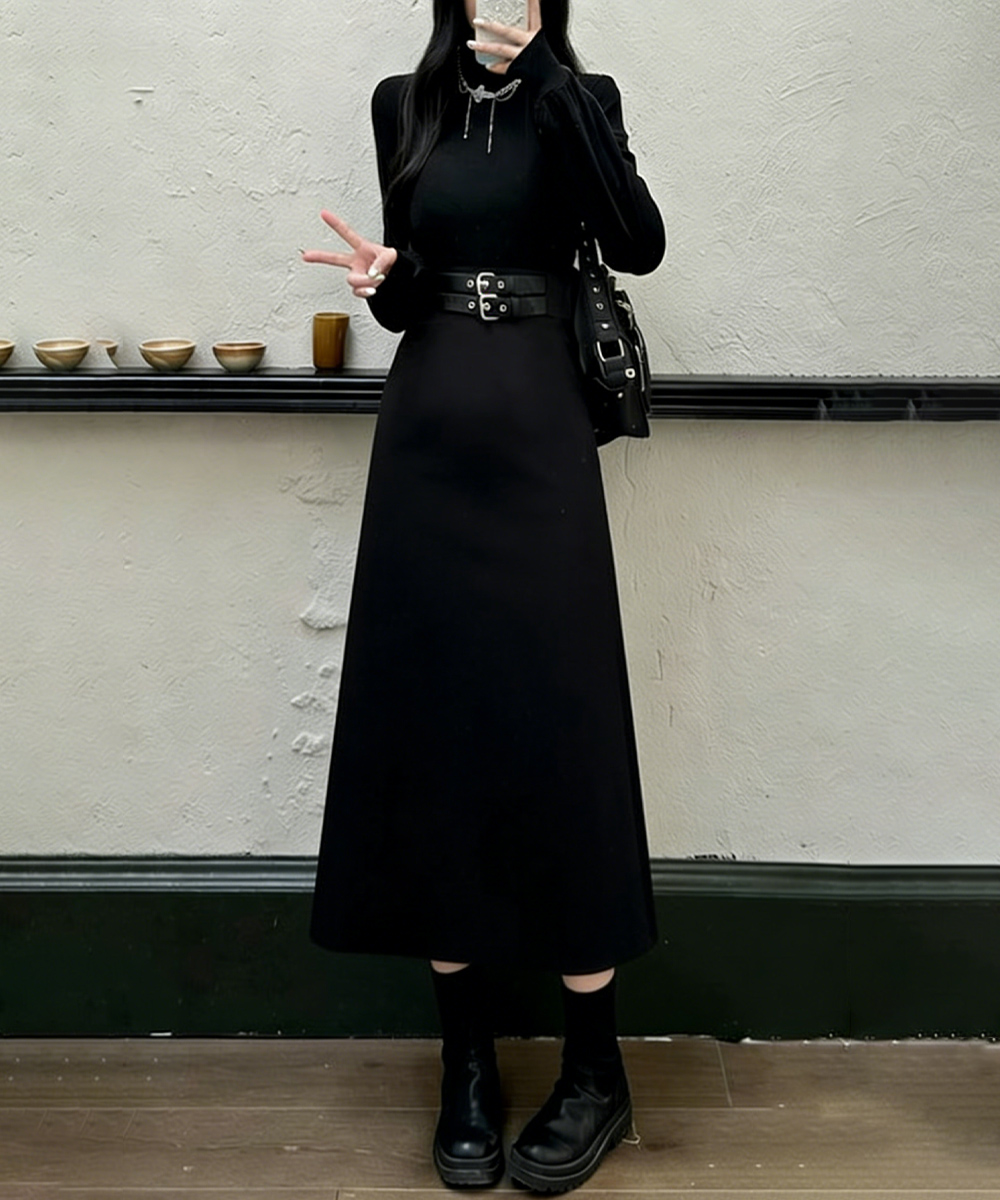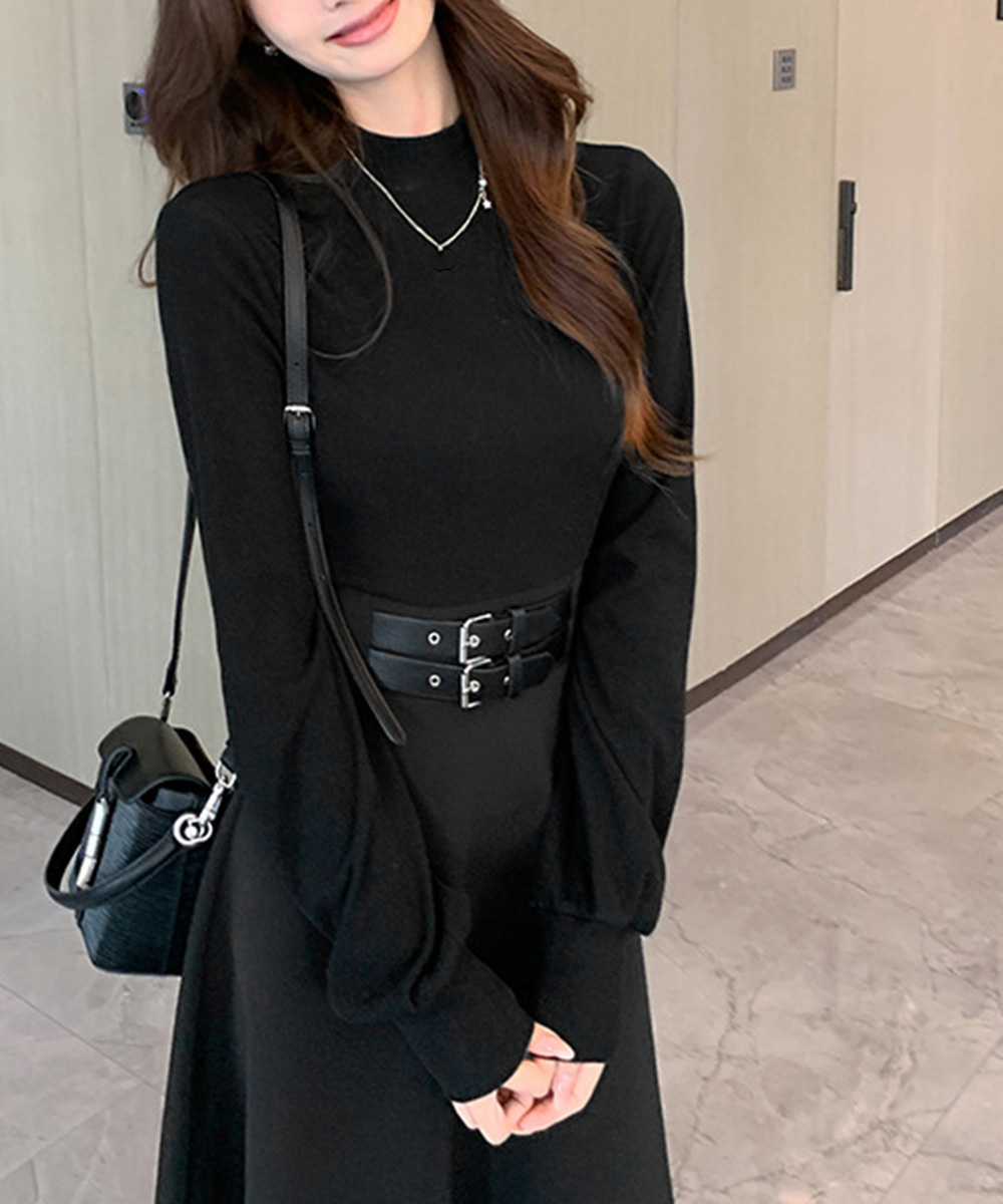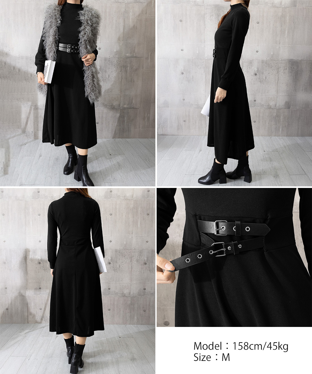 プチハイネック Aラインワンピース 大人可愛い ハイウエストフレアワンピース長袖 体型カバー 着やせワンピース黒 韓国風 お洒落ワンピ細見え きれいめワンピ春秋 インナーワンピ無地 異素材切り替えとウエストベルト飾りがアクセントのロング丈ワンピース。 ウエストマークデザインでスタイルアップ見えを狙える。 ロング丈ならではの上品なラインが、女性らしいムードを引き立てる。 スカート部分はフレアデザインで動きのあるシルエットにこだわる。 一枚でさらりと着こなすのはもちろん、ジャケットやコートのインナーとしても活躍。 上身頃素材:ポリエステル80%+綿20% 下身頃素材:ポリエステル100% カラー:ブラック サイズ:M/L [M]総丈:約115cm 肩幅:約33cm 袖丈:約53cm ゆき:約69.5cm 身幅:約38cm 胸囲:約76-94cm ウエスト:約70cm ヒップ:約110cm [L]総丈:約120cm 肩幅:約34cm 袖丈:約54cm ゆき:約71cm 身幅:約39cm 胸囲:約78-100cm ウエスト:約74cm ヒップ:約116cm 裏地:なし 伸縮性:上身頃のみあり 透け感:なし