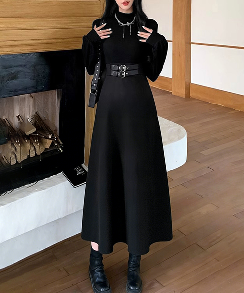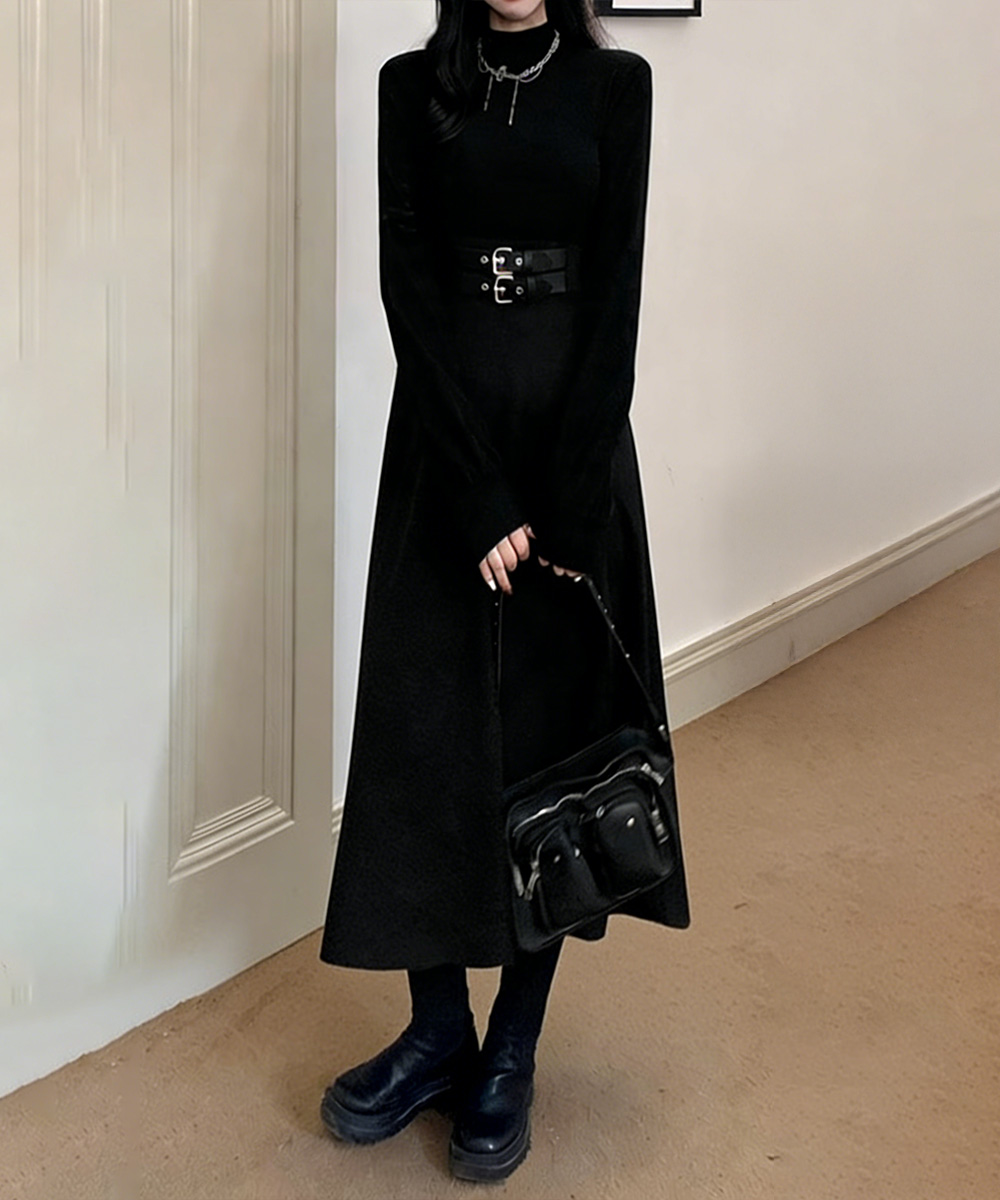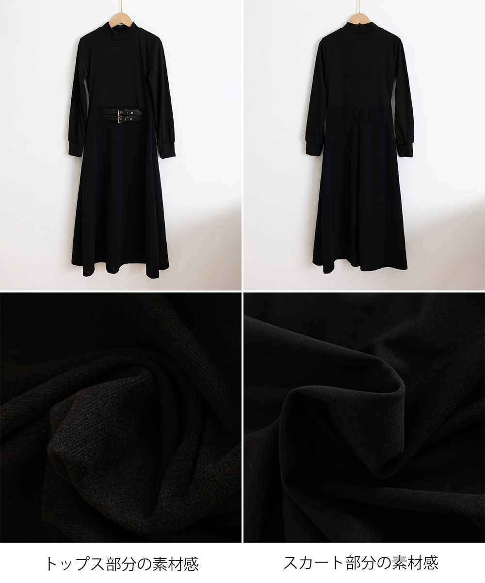 異素材切り替えとウエストベルト飾りが印象的なニット素材のロングワンピース。