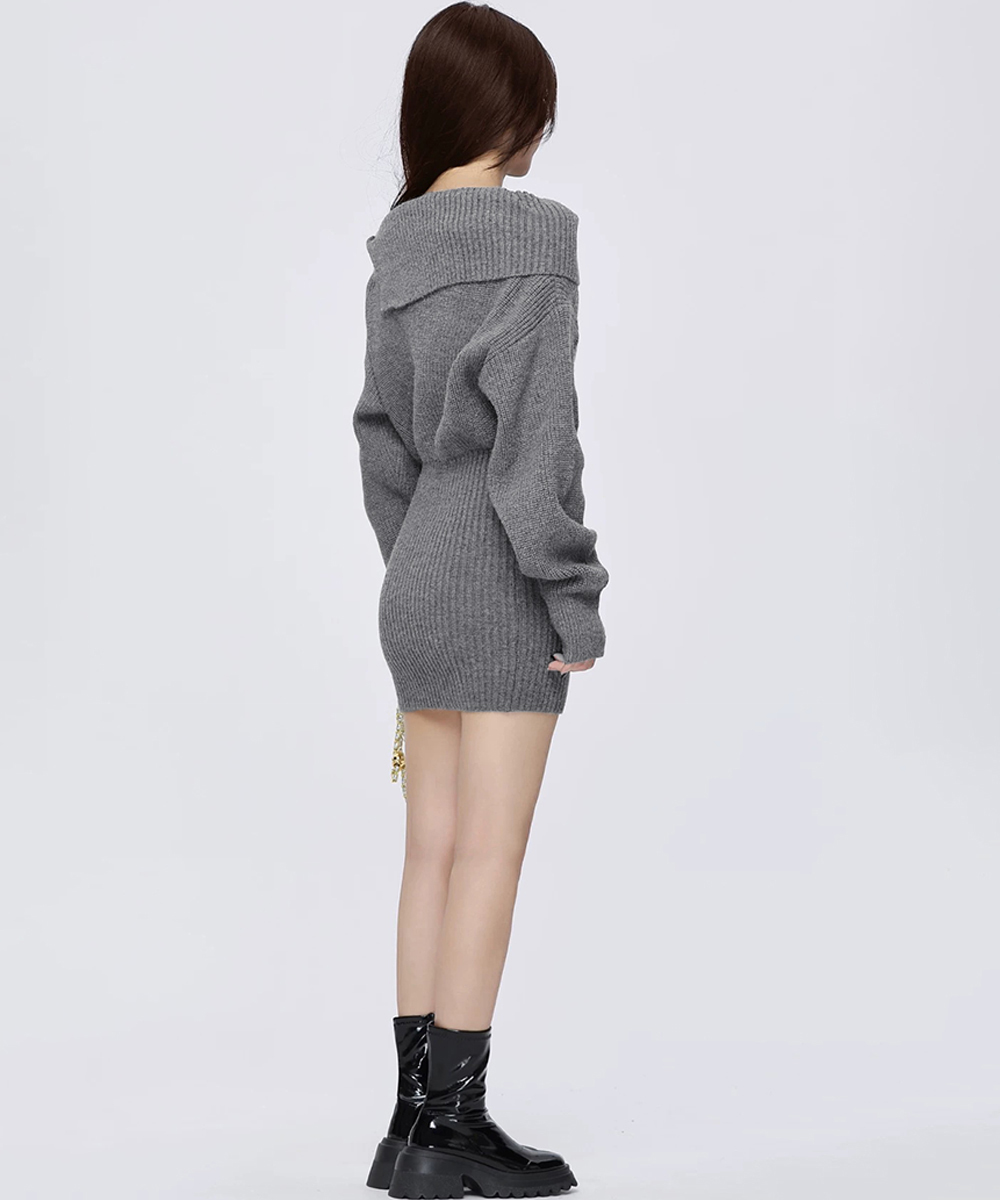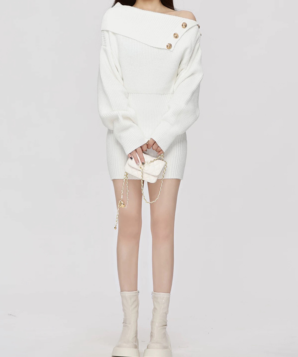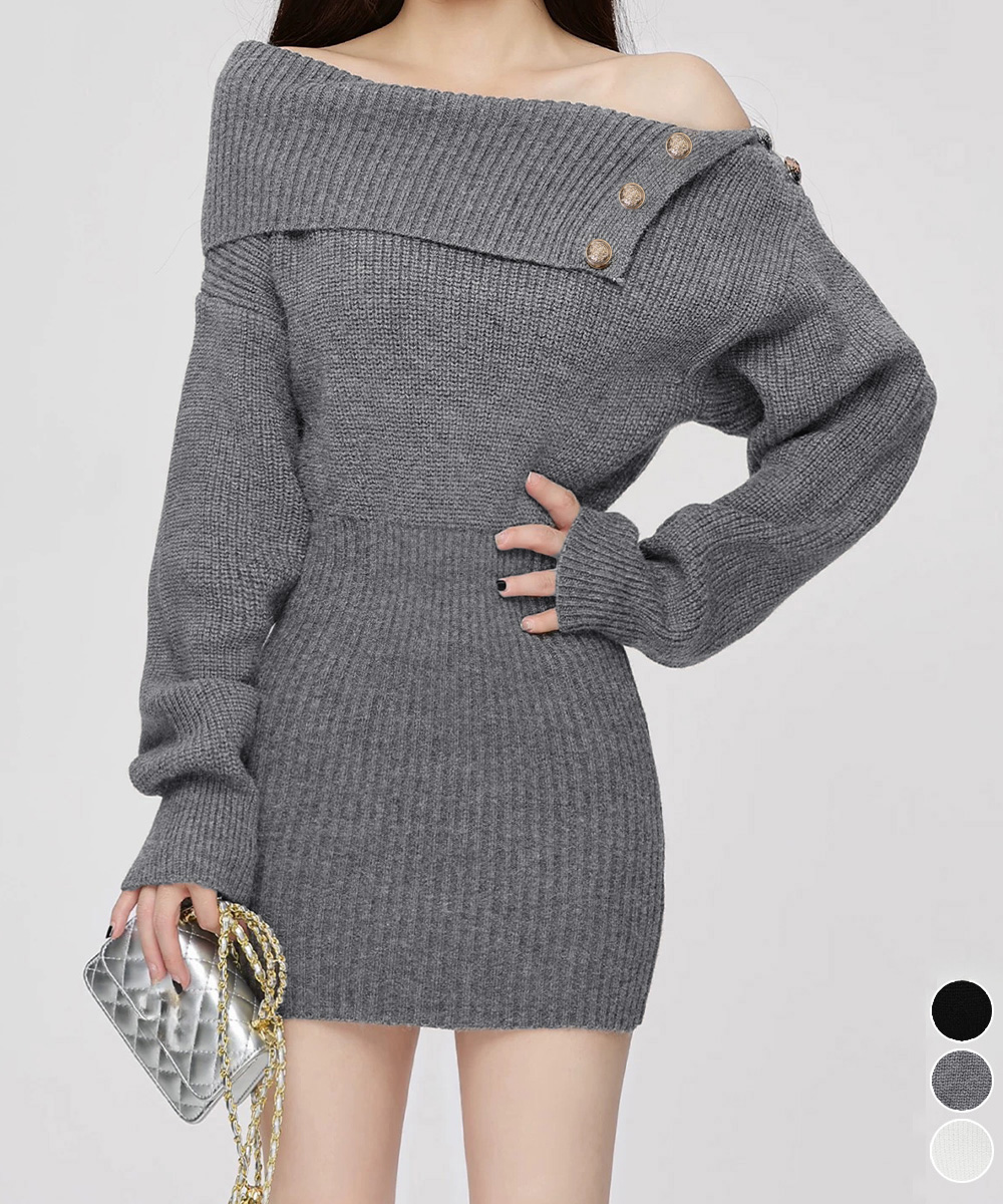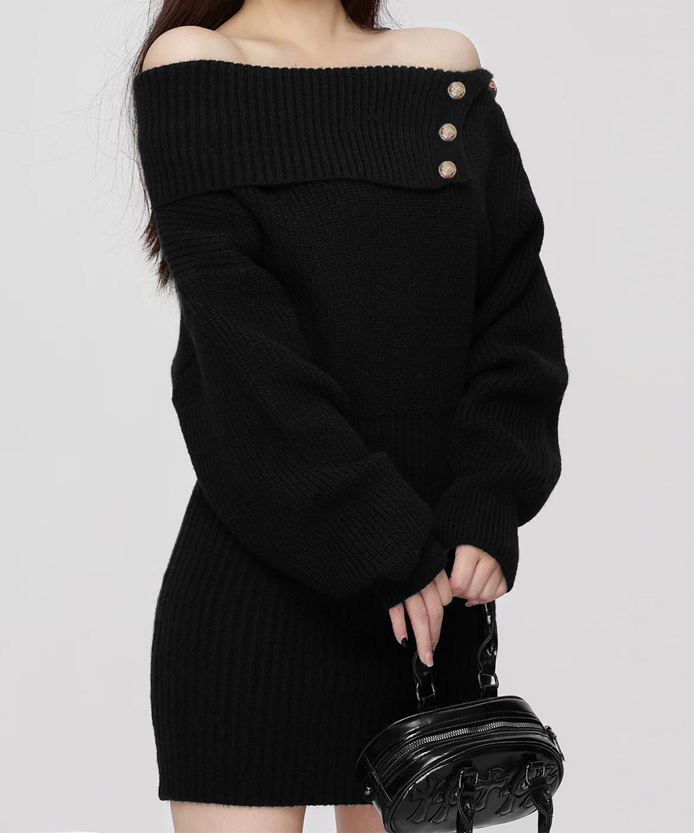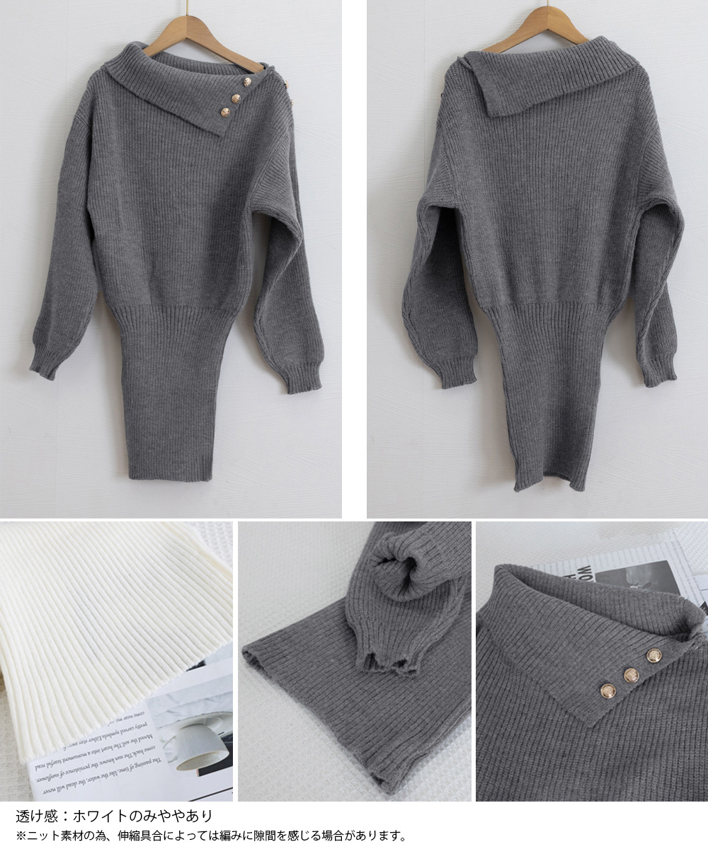 金色ボタンが上品なアクセントのニットワンピース。