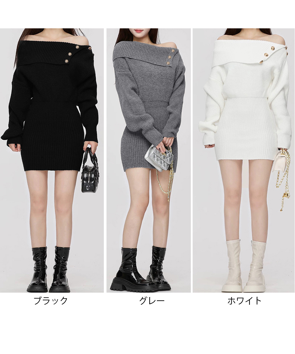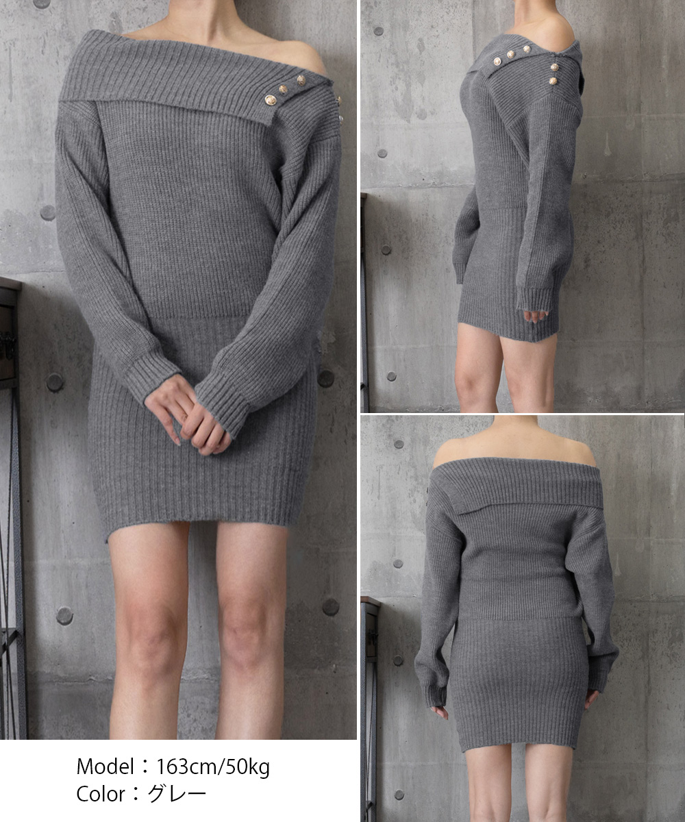 レディース ボタンデザイン リブワンピース 大人可愛い ショート丈ワンピース セクシーワンピース 着やせ セータードレス 無地膝上ワンピース ミニワンピース秋冬 着回しニットワンピ トレンドのオフショルダーに金ボタンデザインを施した、上品な雰囲気漂うニットワンピース。 ゴールドボタンがアクセントになり、シンプルながらも高見えするデザイン。 折り返しのオフショル部分が二の腕を程よくカバーしてくれる。 ブーツやショート丈アウターと合わせて、秋冬のデートコーデにぴったり。 素材:ポリエステル75%+アクリル25% カラー:ブラック/グレー/ホワイト サイズ:ワンサイズ 総丈:約77cm ゆき:約72cm 身幅:約40cm 胸囲:約80-132cm ウエスト:約56-108cm ヒップ:約42-94cm 裏地:なし 伸縮性:あり 透け感:ホワイトのみややあり ※ニット素材の為、伸縮具合によっては編みに隙間を感じる場合があります。 生産国:中国 ※すべて平置きサイズです(採寸方法違いより、多少の誤差がございますので、ご了承ください)。 ※海外輸入品のため、商品の細部仕様は多少異なる場合がございます。予めご了承の上、ご注文お願い致します。