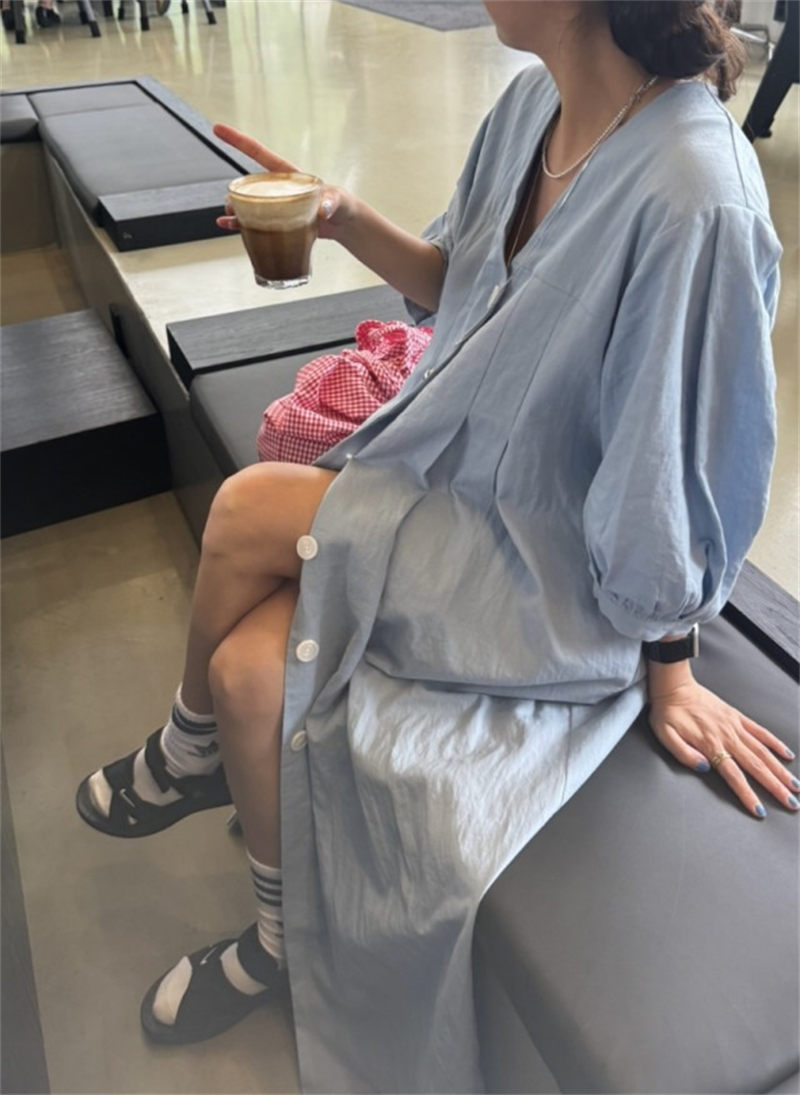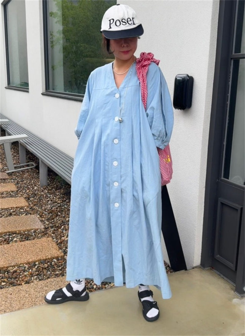 ボタンデザインがアクセントの大人カジュアルスタイル。