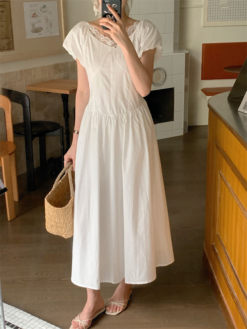 パフスリーブとウエストのギャザーがフェミニンな印象を与え、
