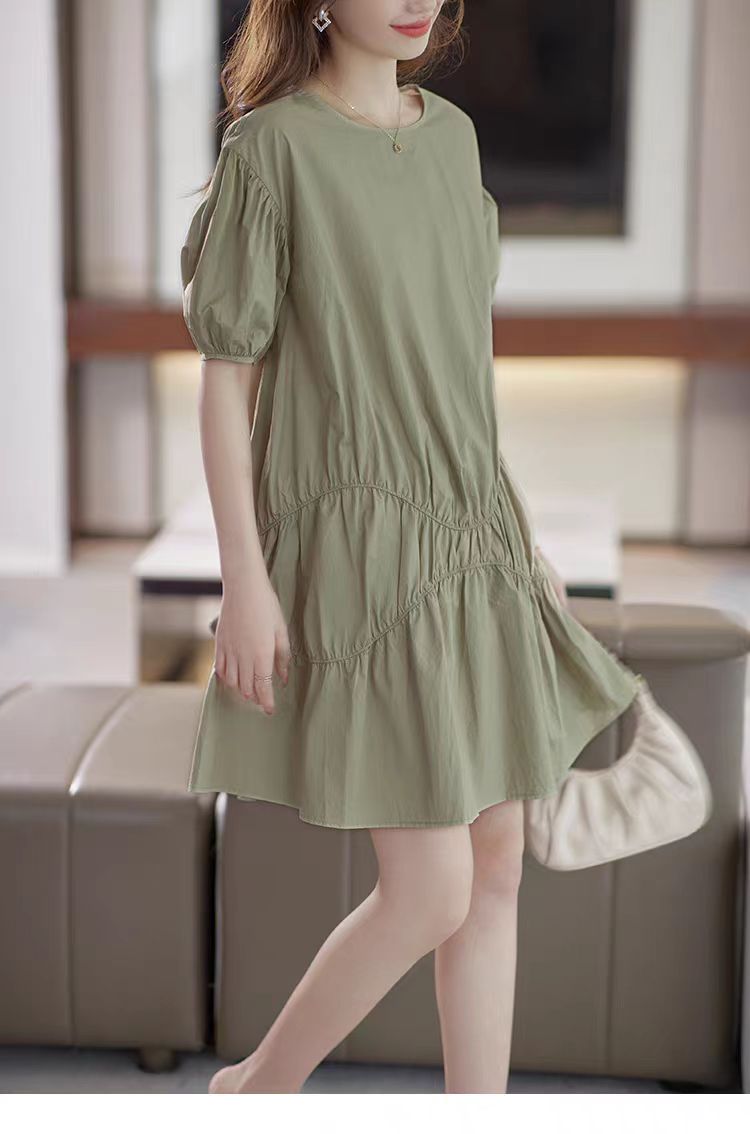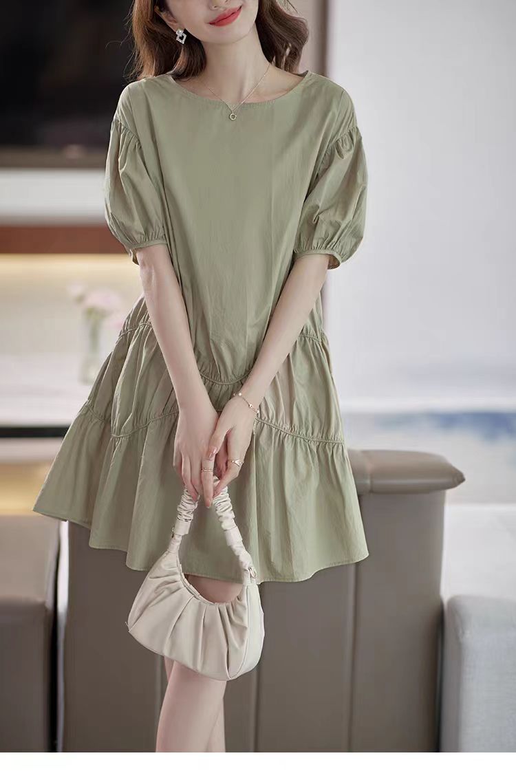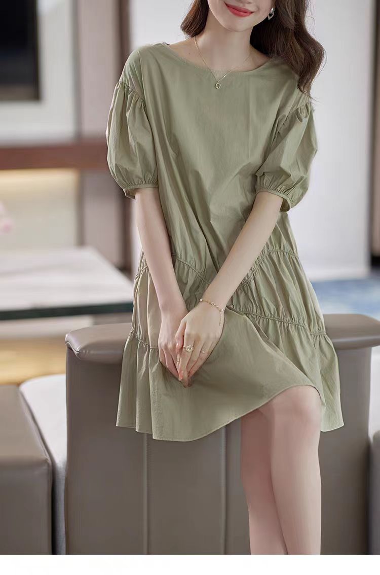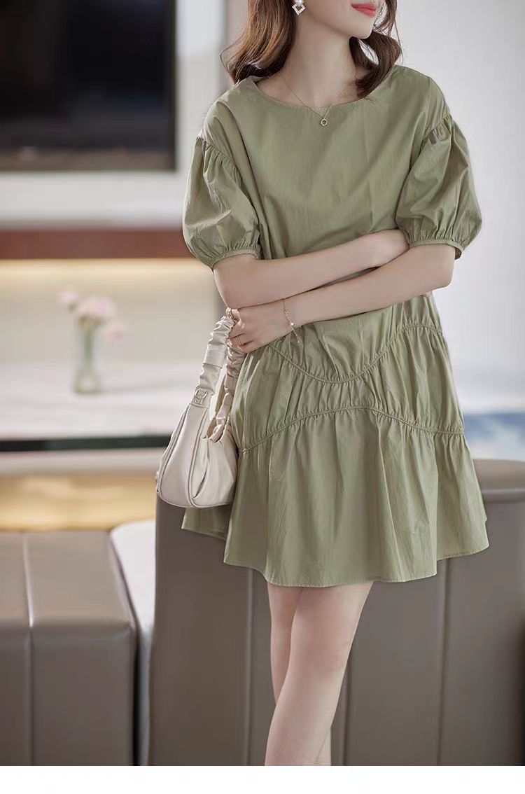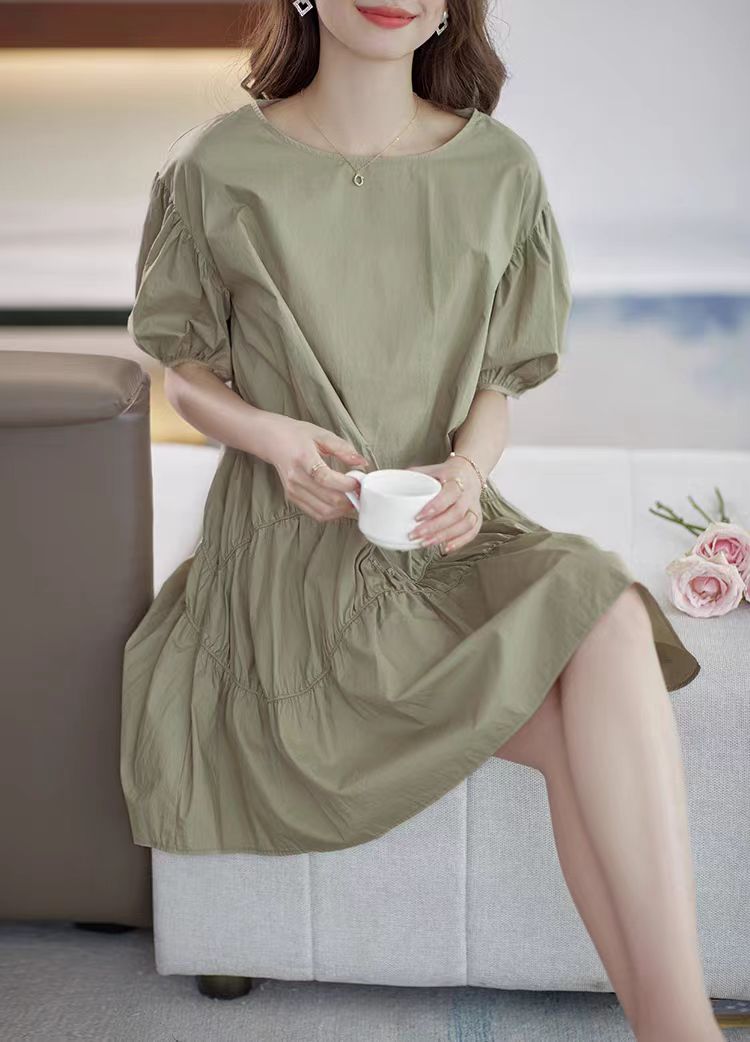 落ち着いたカーキ色とパフスリーブが上品な印象を演出します。
