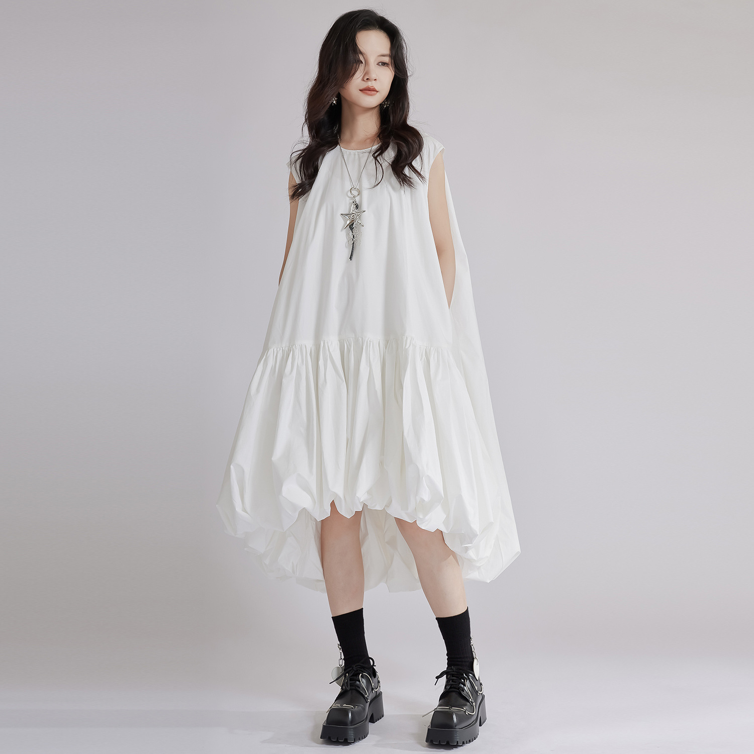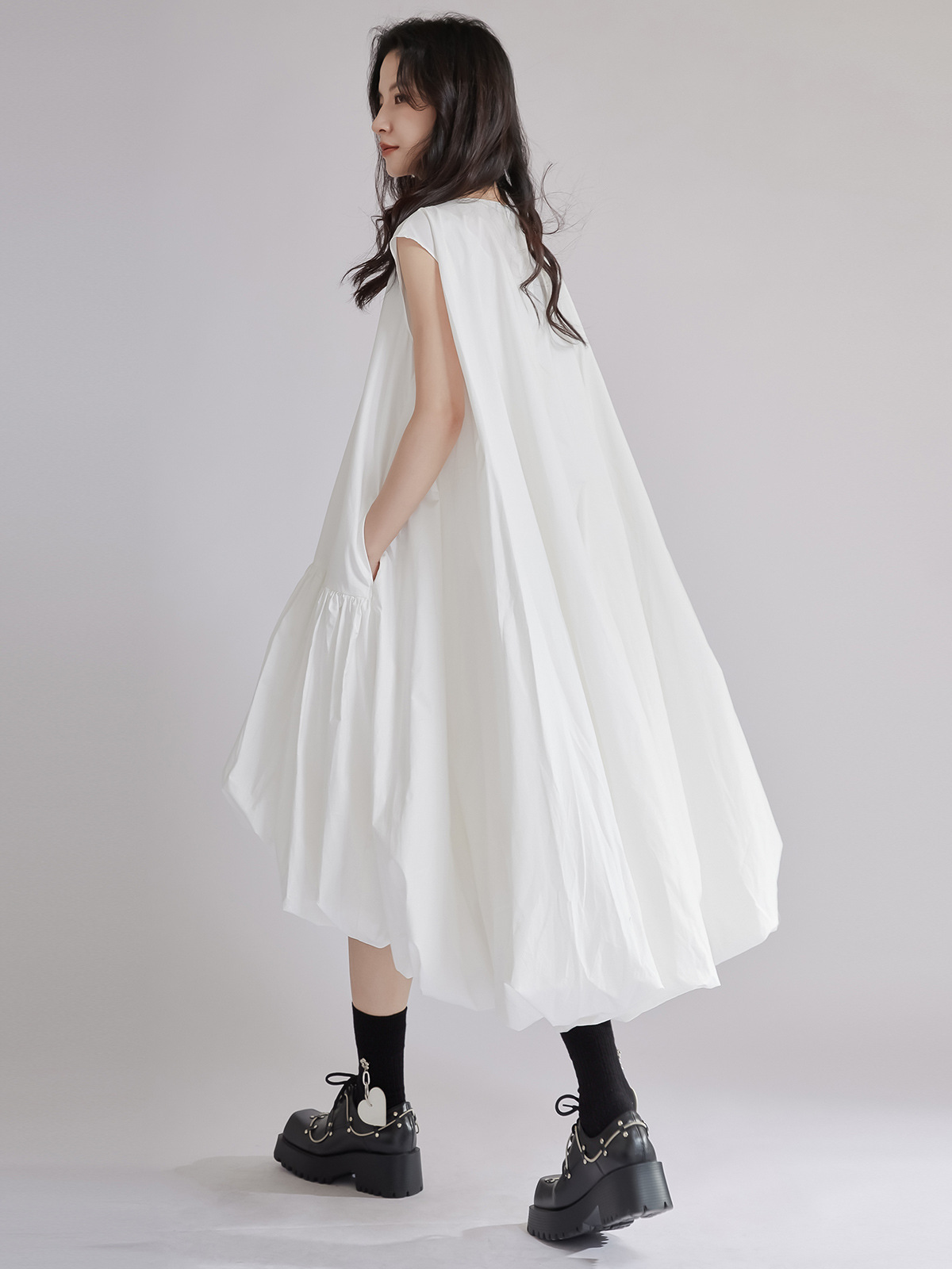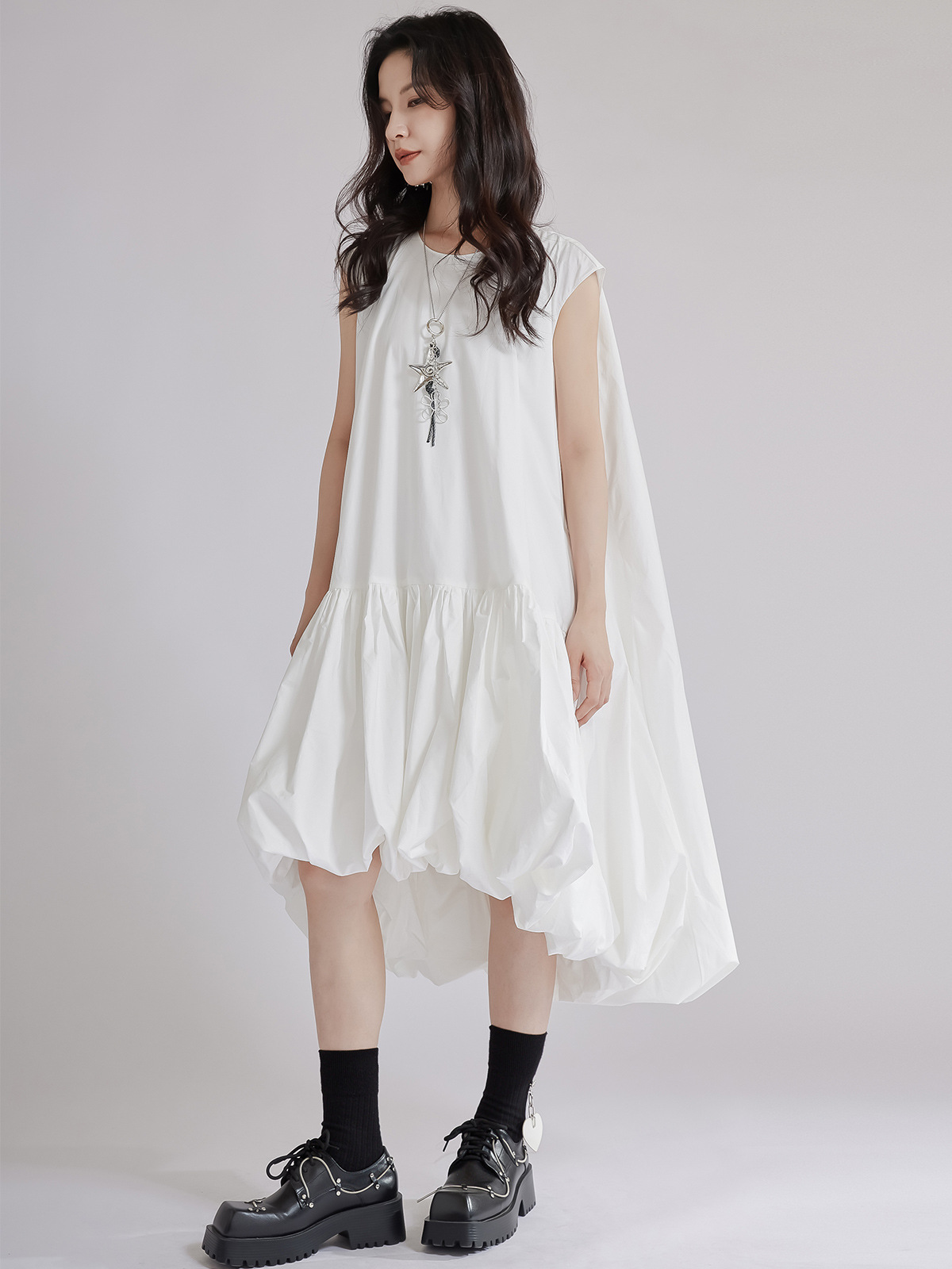 涼しげな白色のゆったりシャツワンピースです。