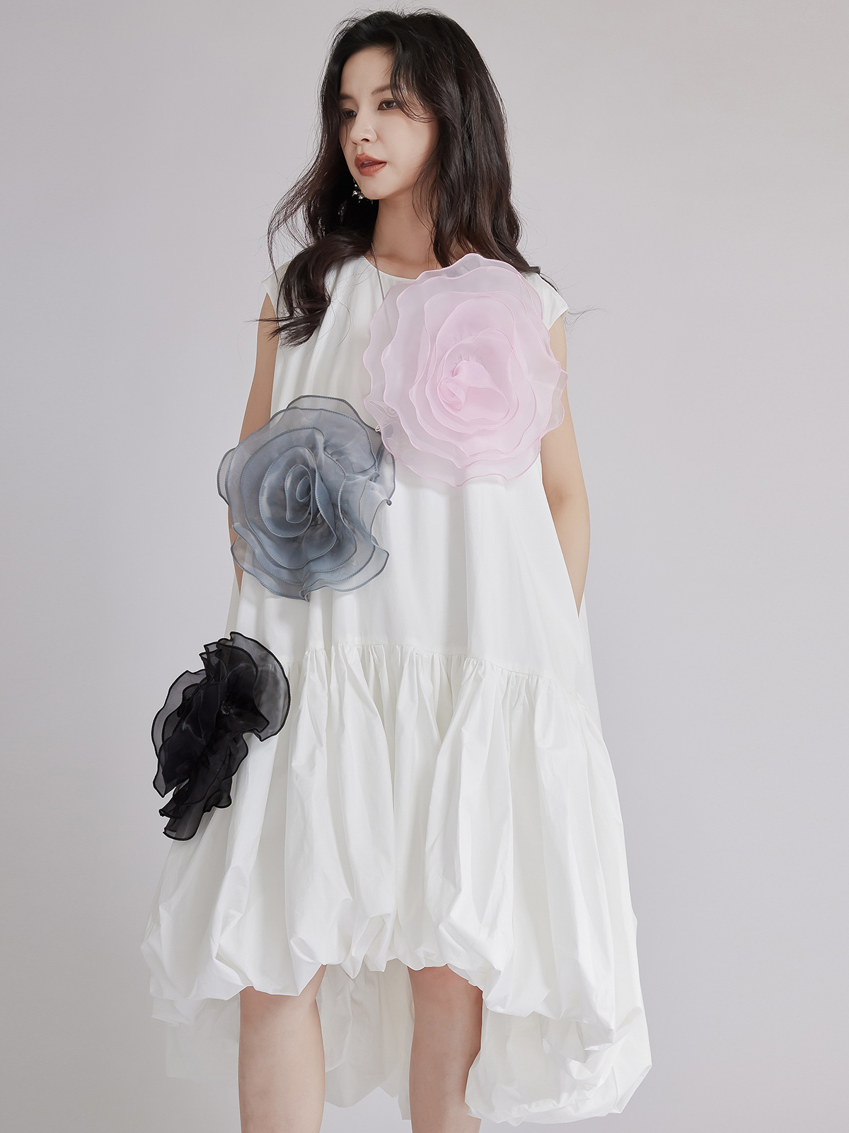 裾のフリルデザインが上品で、ロングワンピースならではの