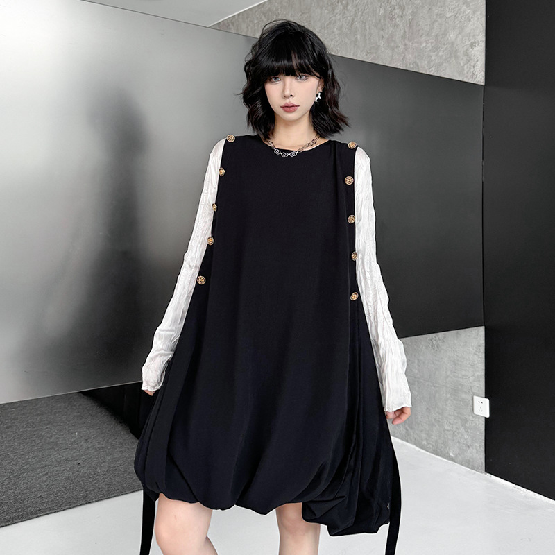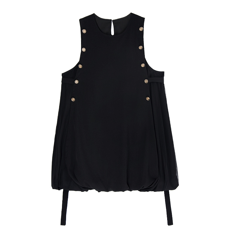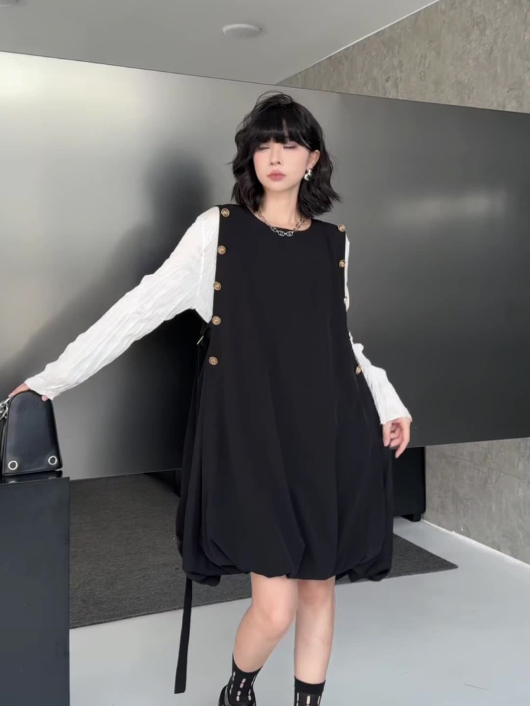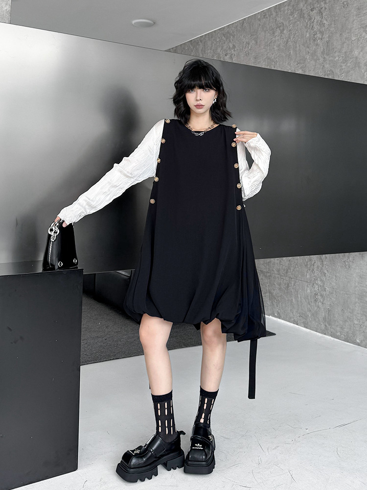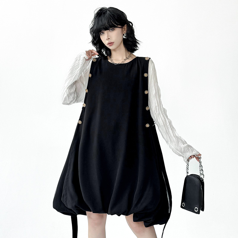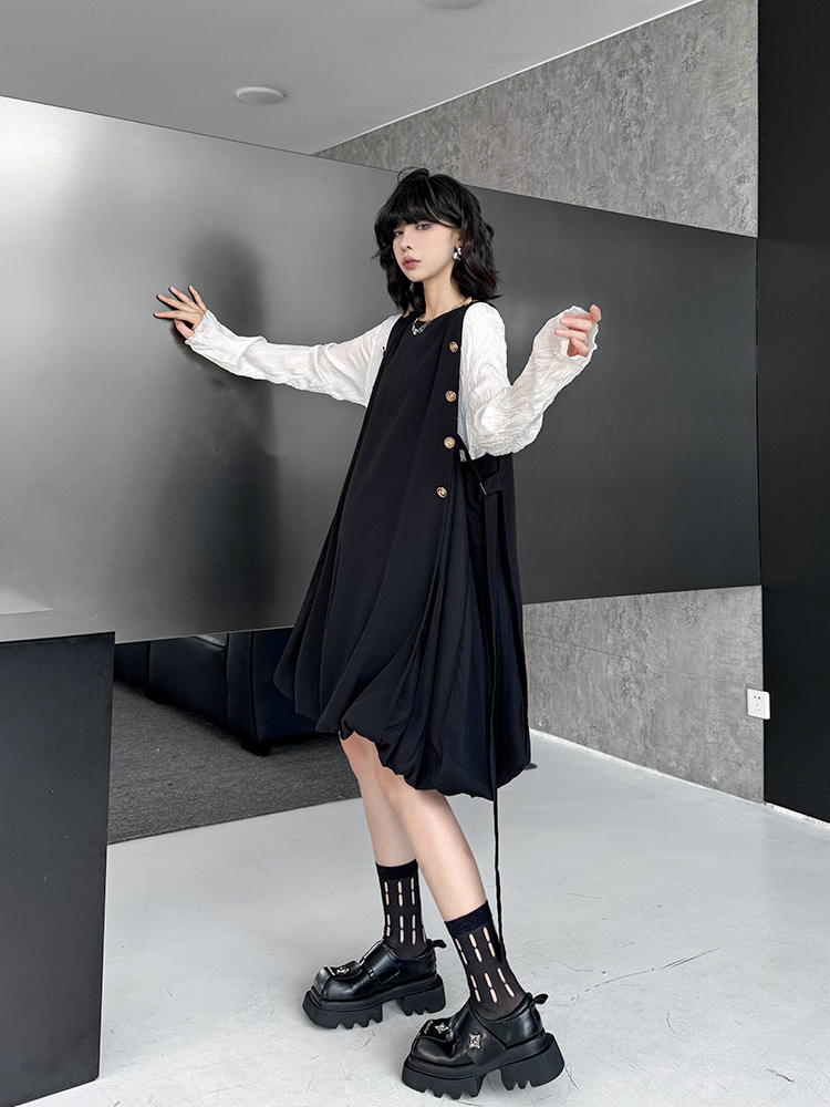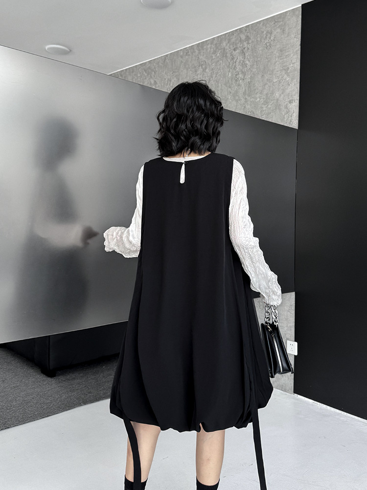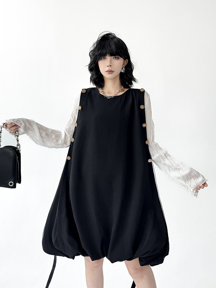 個性的なバルーンシルエットが魅力的なベスト風シャツワンピース。