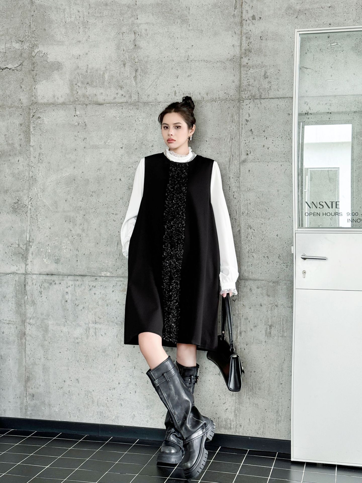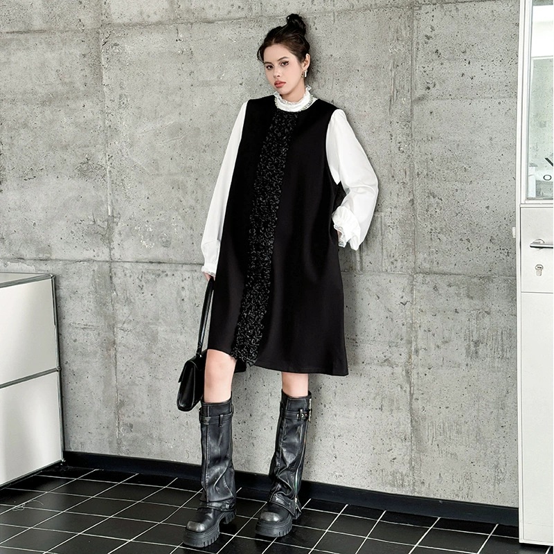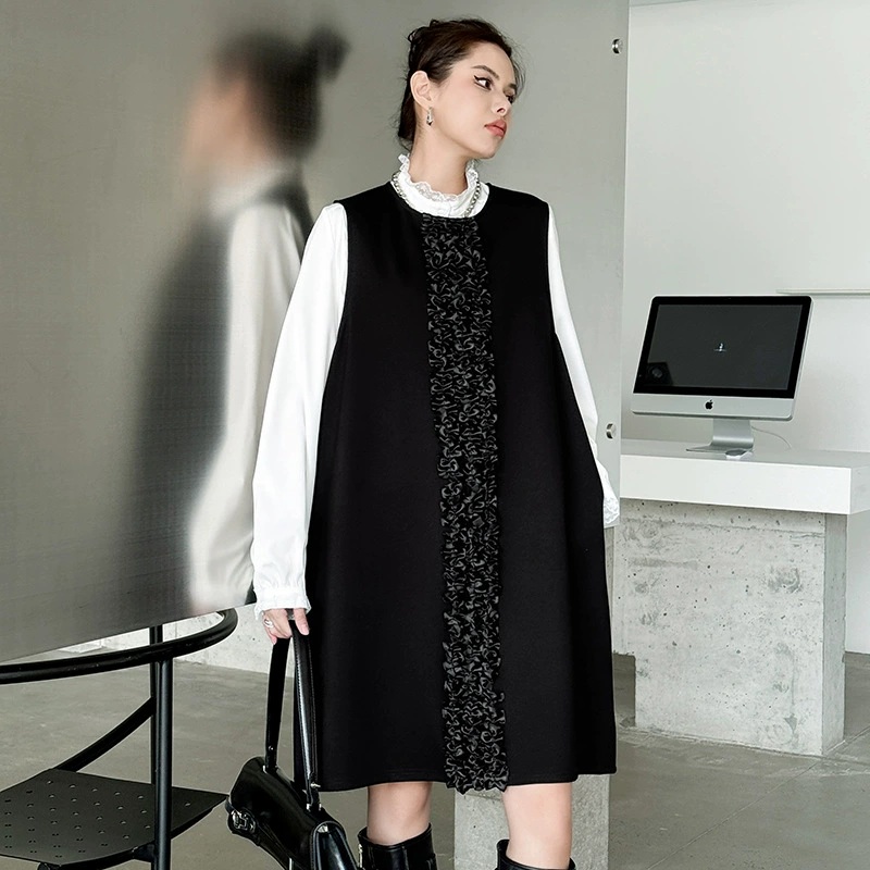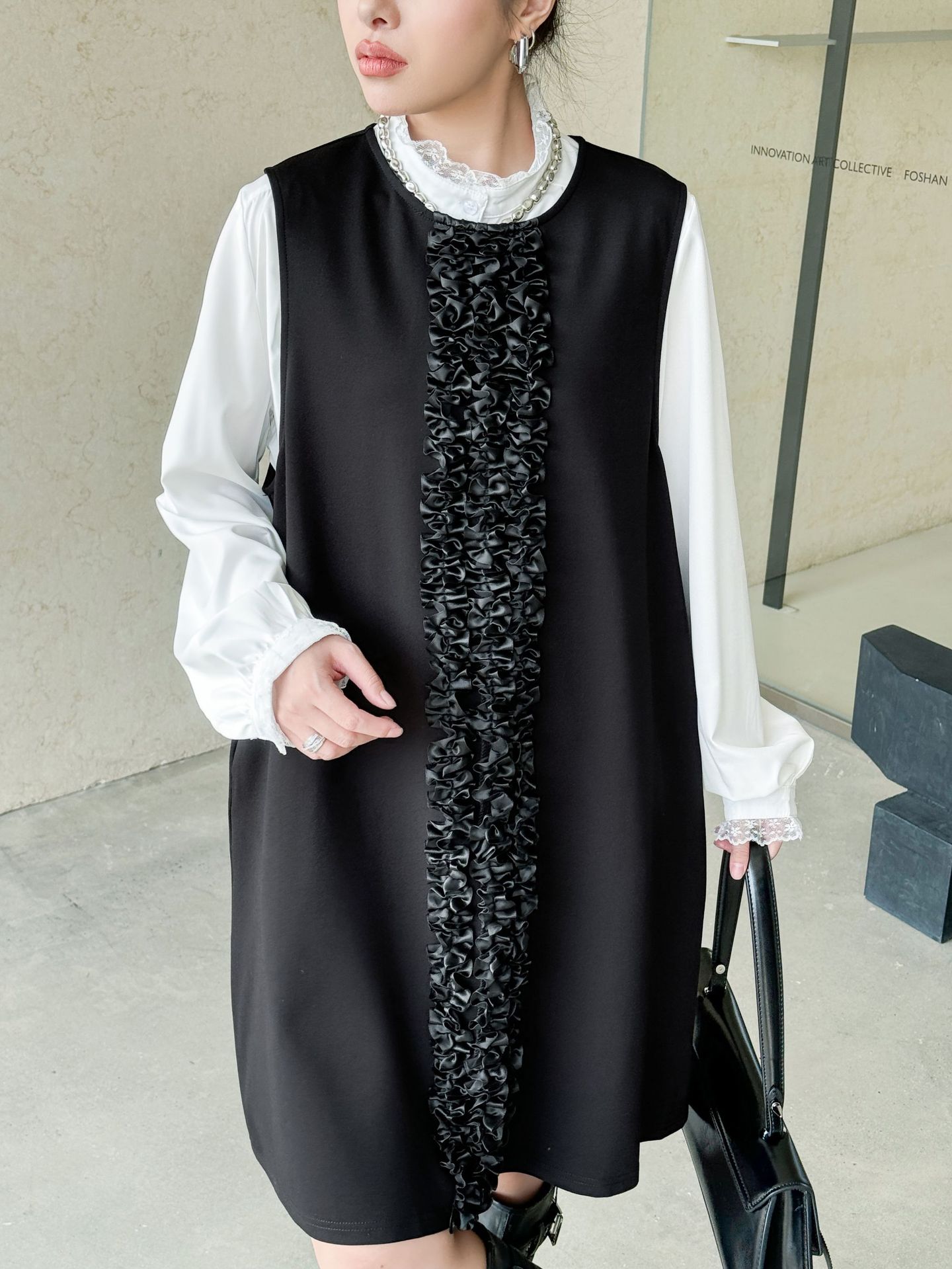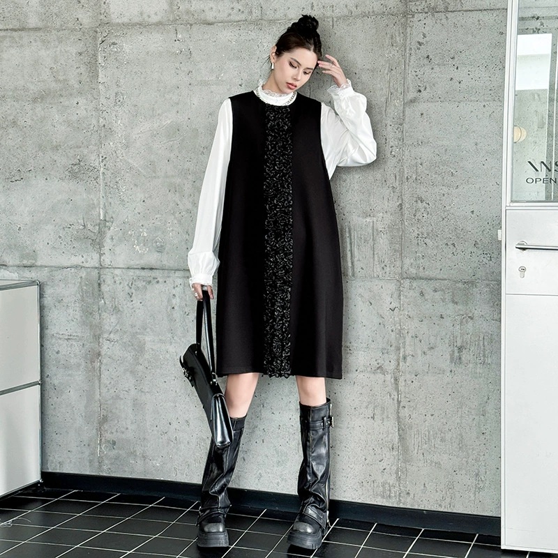 白シャツとベストが一体になった個性的なロングワンピース。