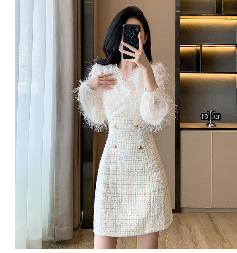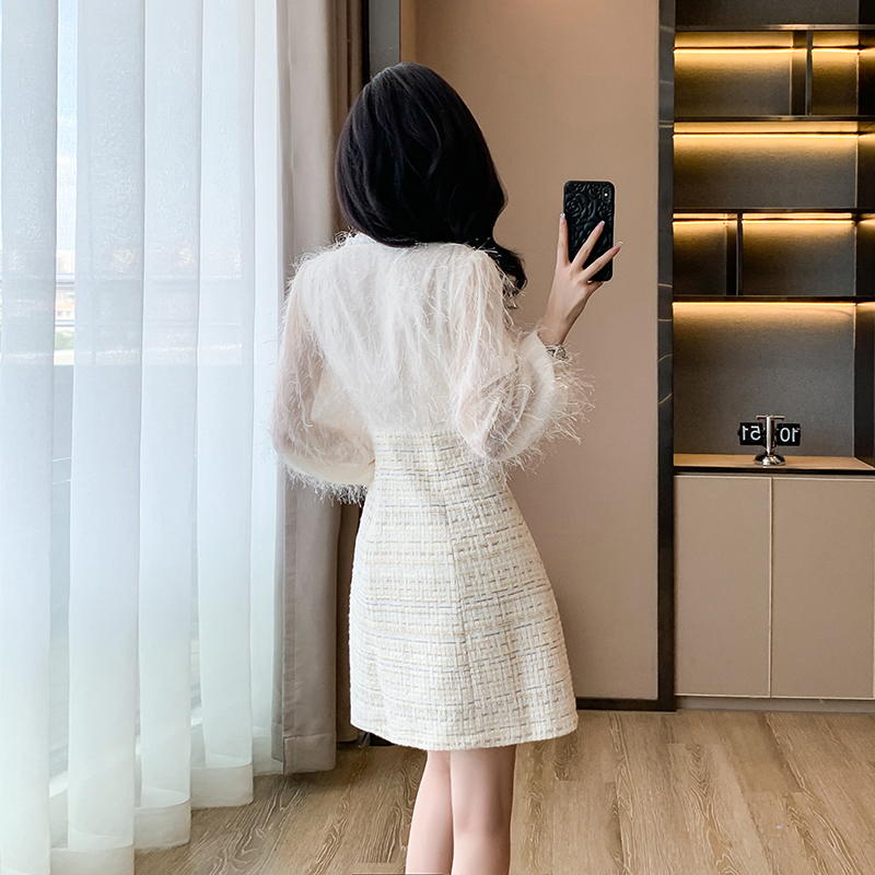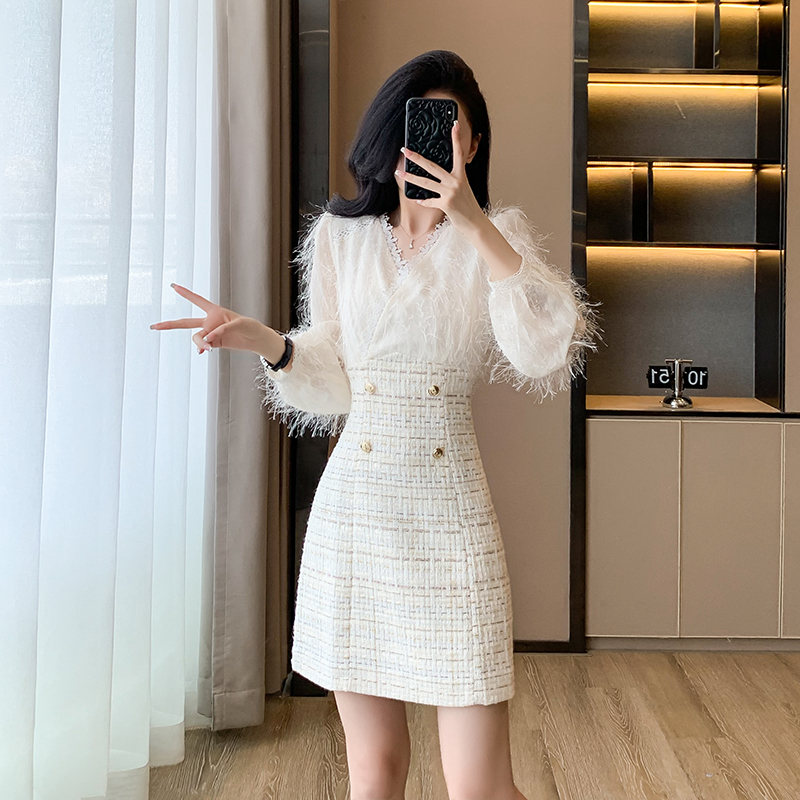 ふわふわニット素材とツイード調スカートが美しく切り替わったロングワンピース。