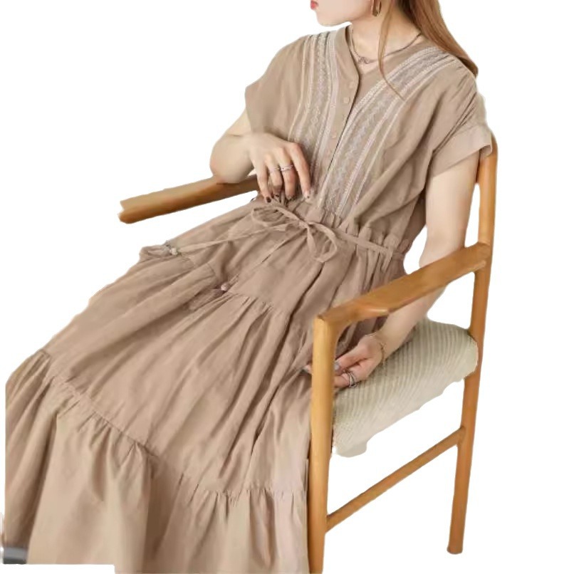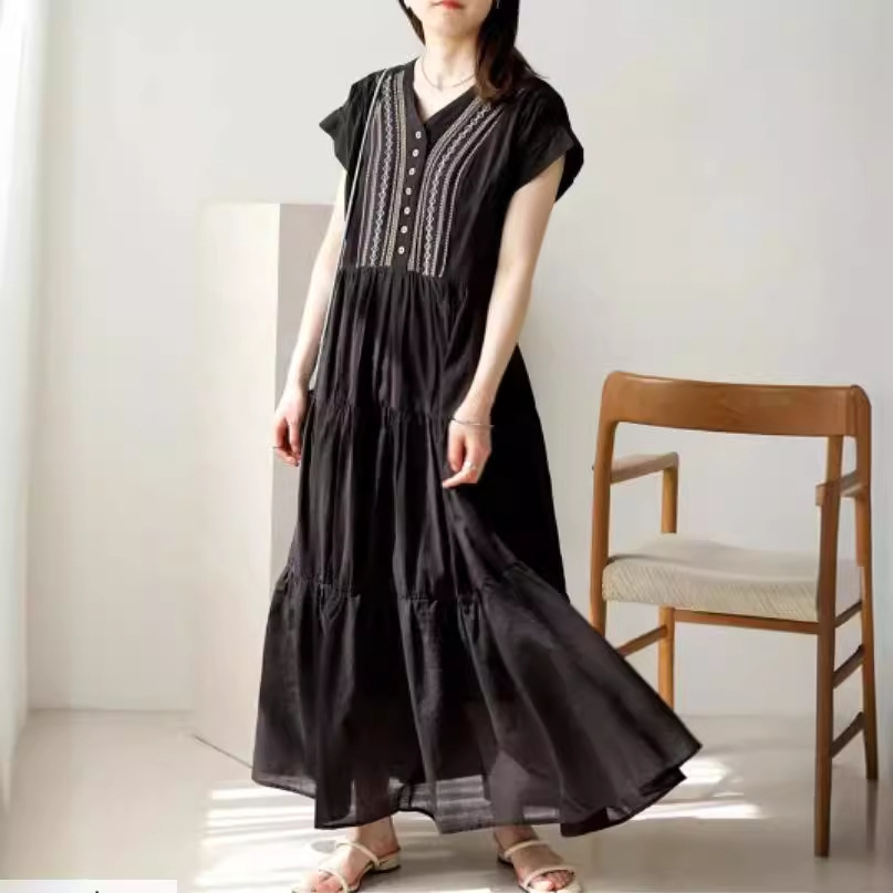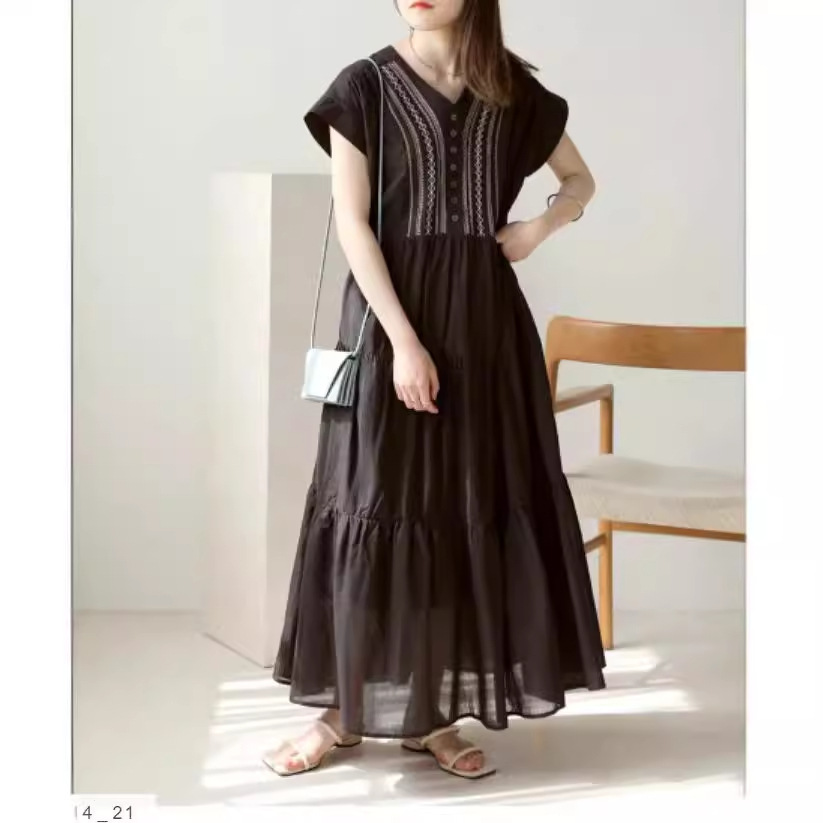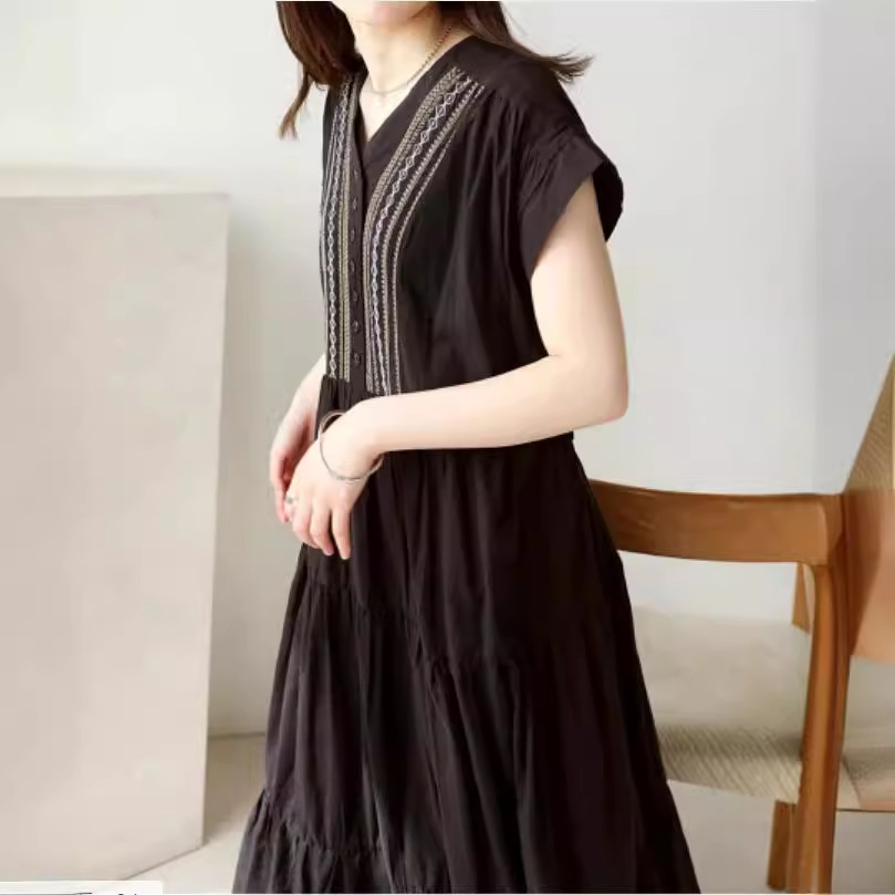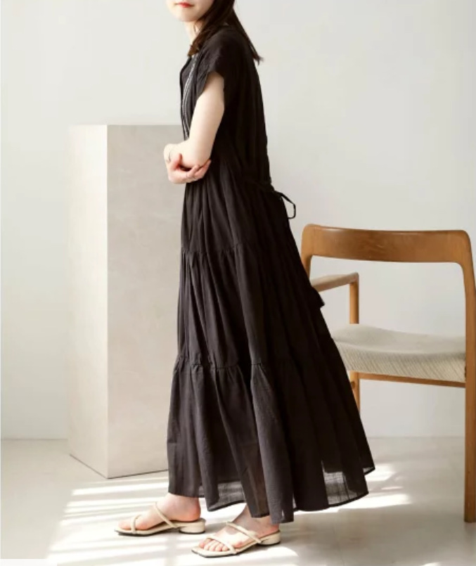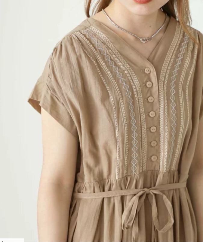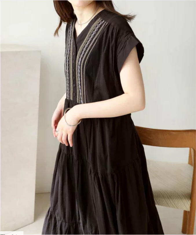 胸元の繊細な刺繍とティアードスカートが上品な印象を演出します。