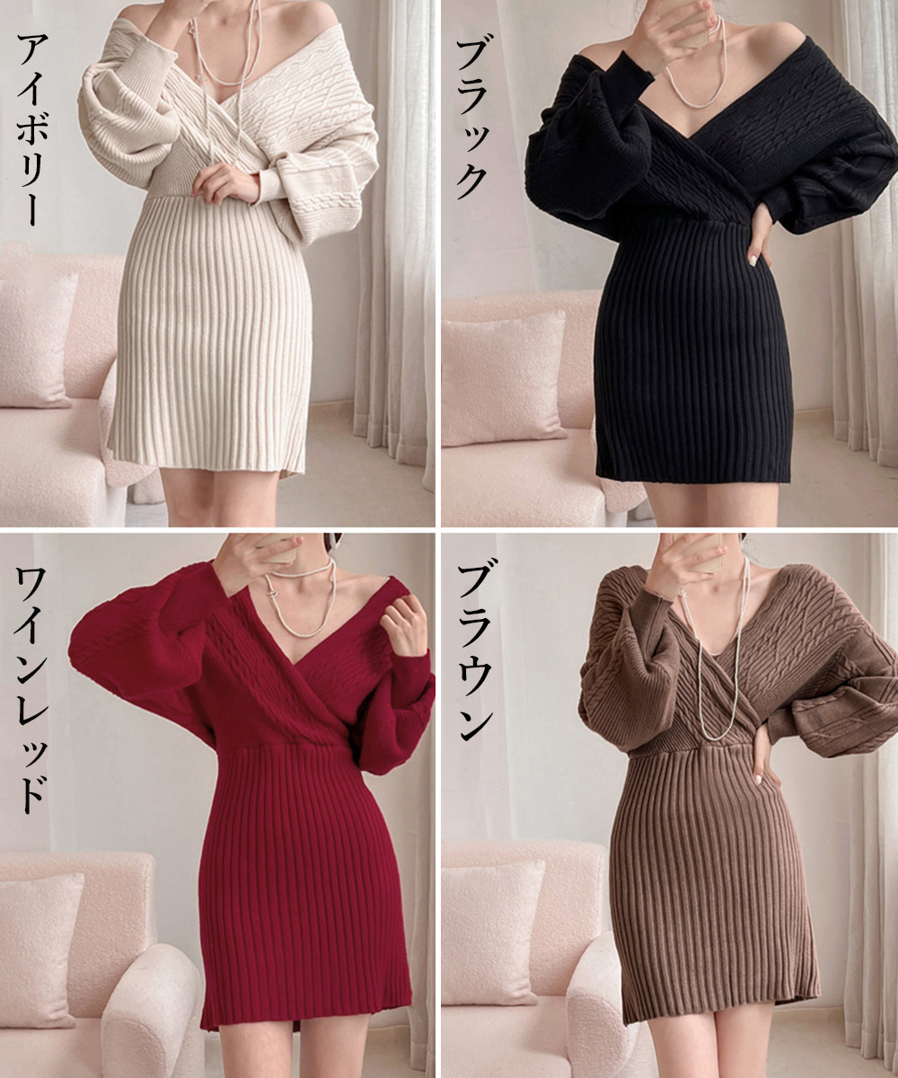 深めのブイネックとカシュクール風のデザインが女性らしいデコルテラインを演出します。