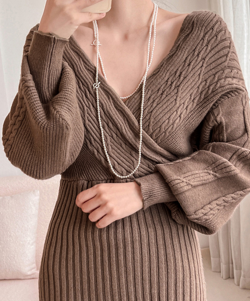 立体的なケーブル編みと縦リブ編みを組み合わせた上品なニットのロングワンピースです。