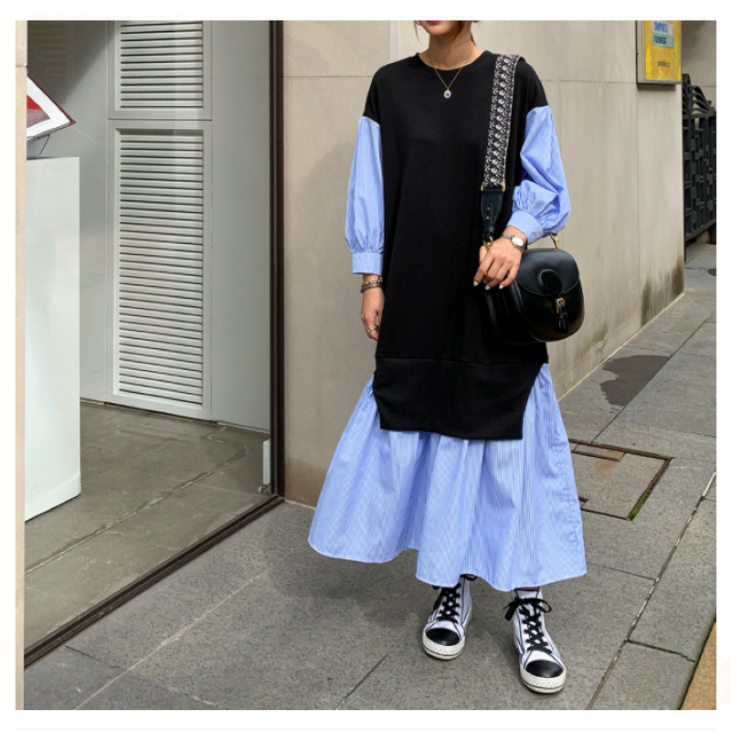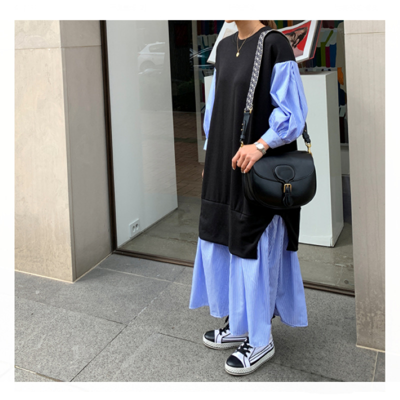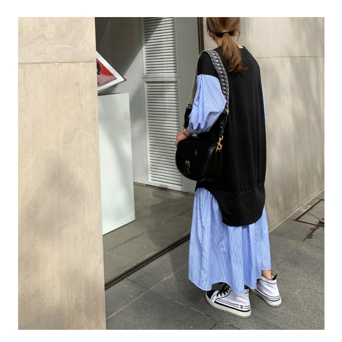 一枚でおしゃれが決まる重ね着風デザインのロングワンピース。 黒のベストと青ストライプシャツが組み合わさった、まるで二枚重ねているかのような上品なスタイル。 秋冬シーズンにぴったりの韓国風デザインで、大きいサイズもご用意。 カジュアルからきれいめまで幅広いシーンで活躍します。