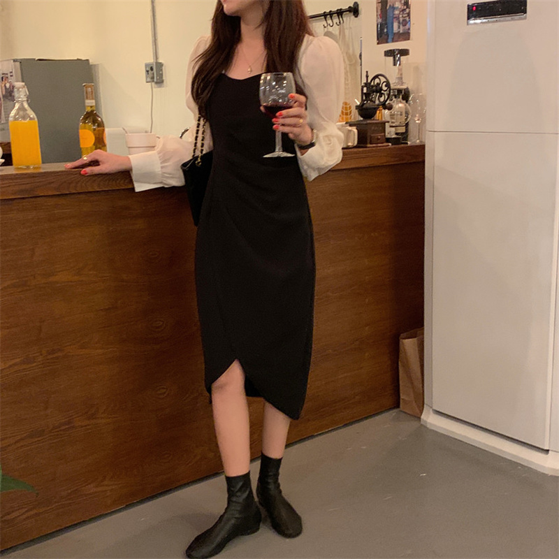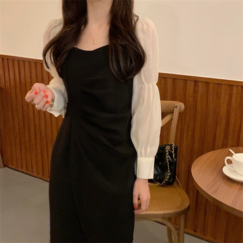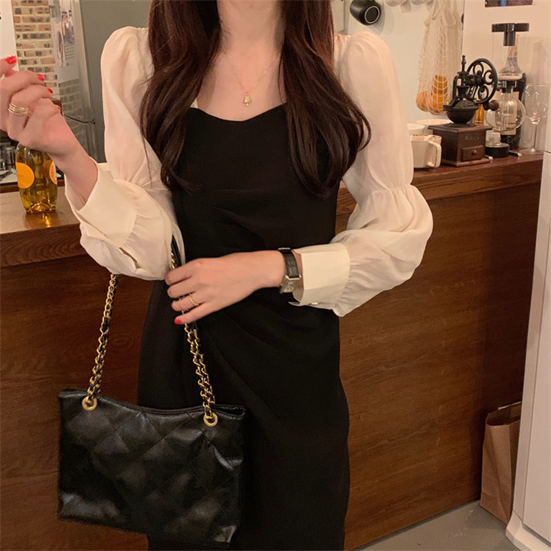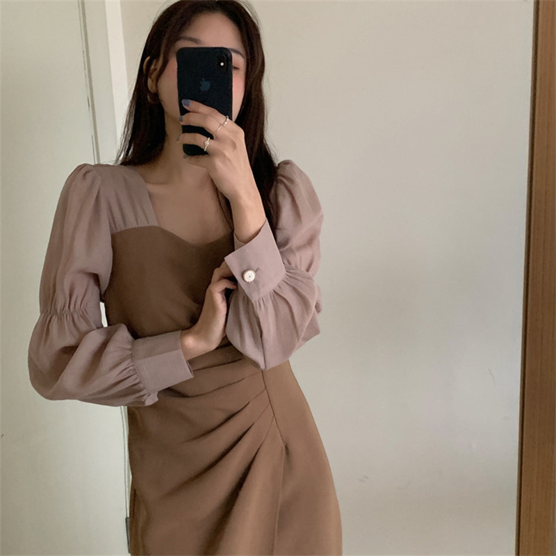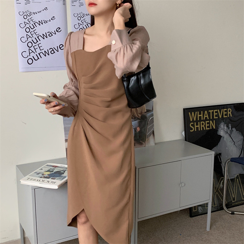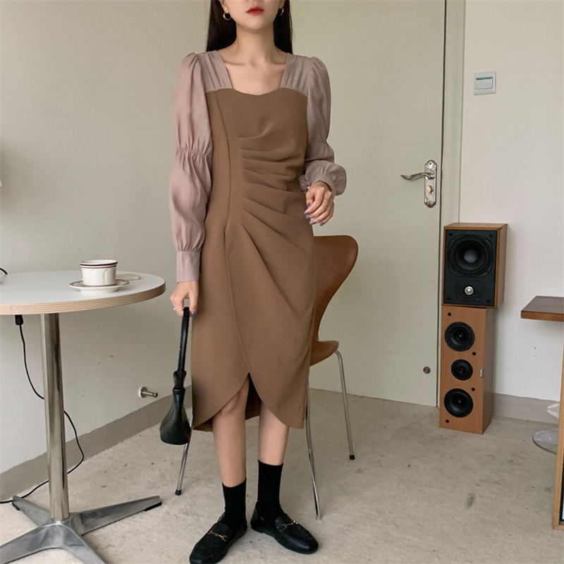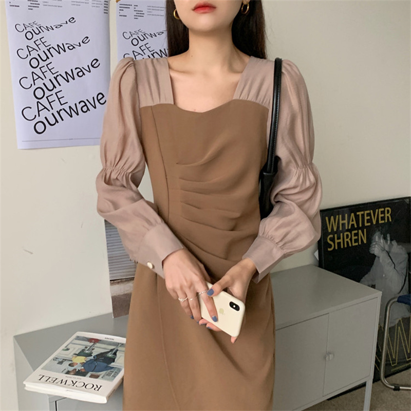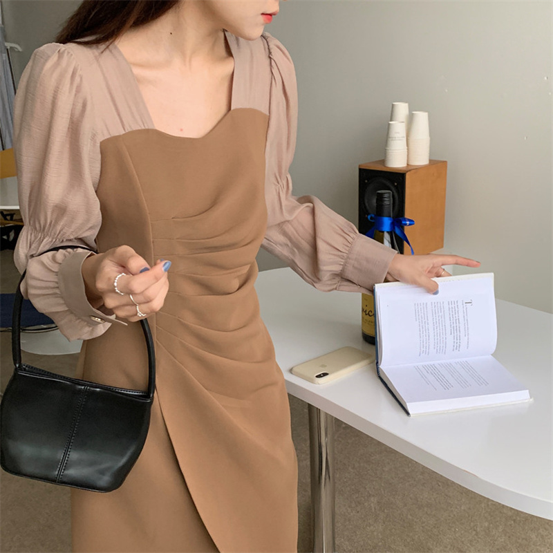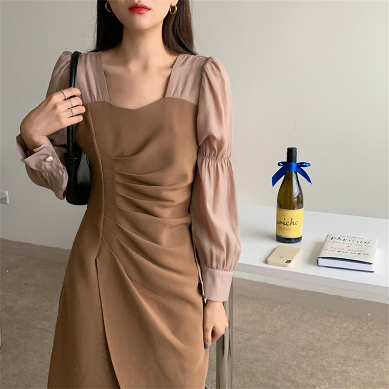 エレガントなスクエアネックと袖がシャツライクなパフスリーブが特徴的なロングワンピース。