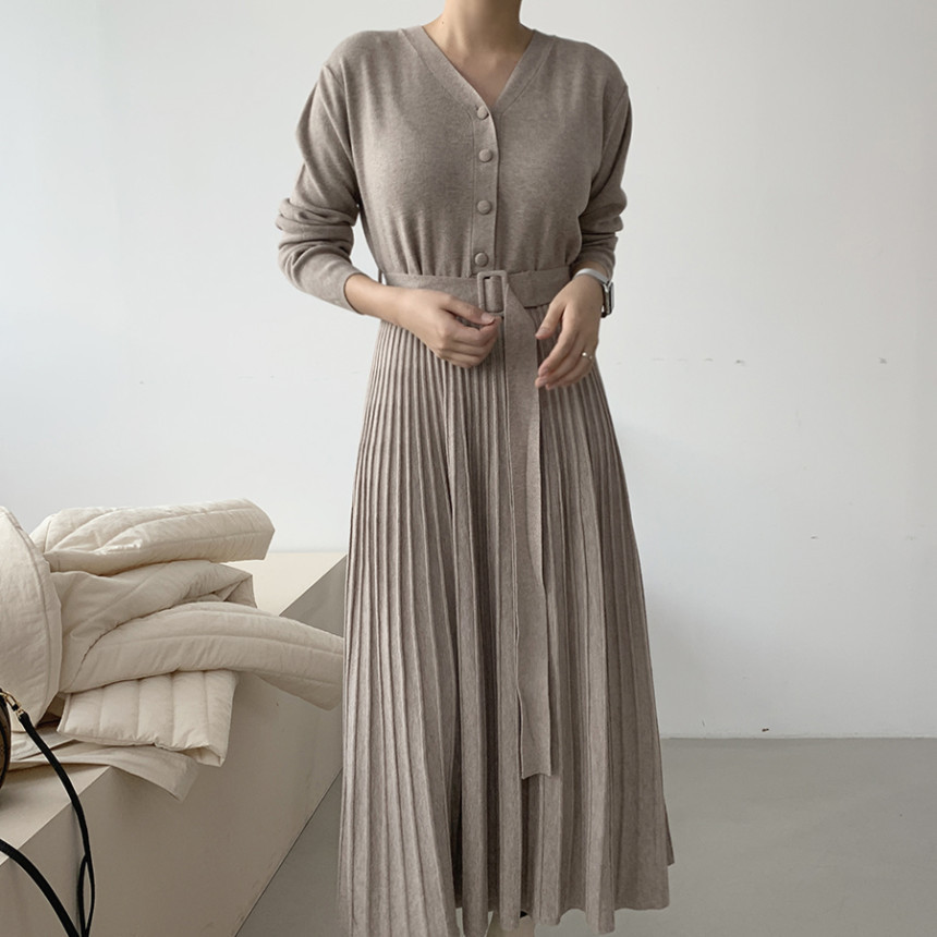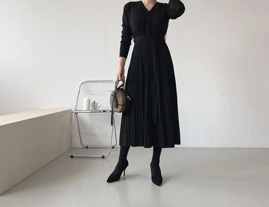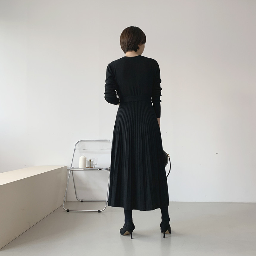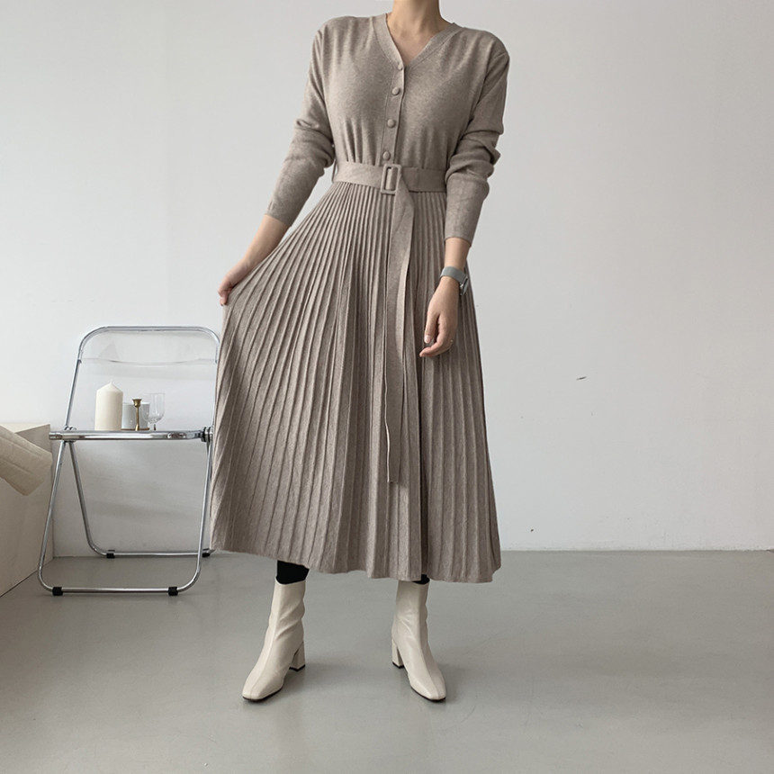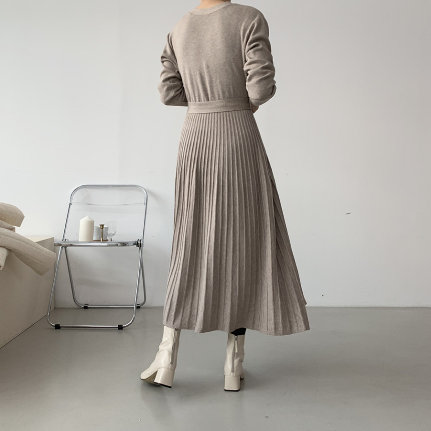 前開きボタンとウエストベルトでスタイルアップを実現し、美しいプリーツスカートが上品な印象を演出します。