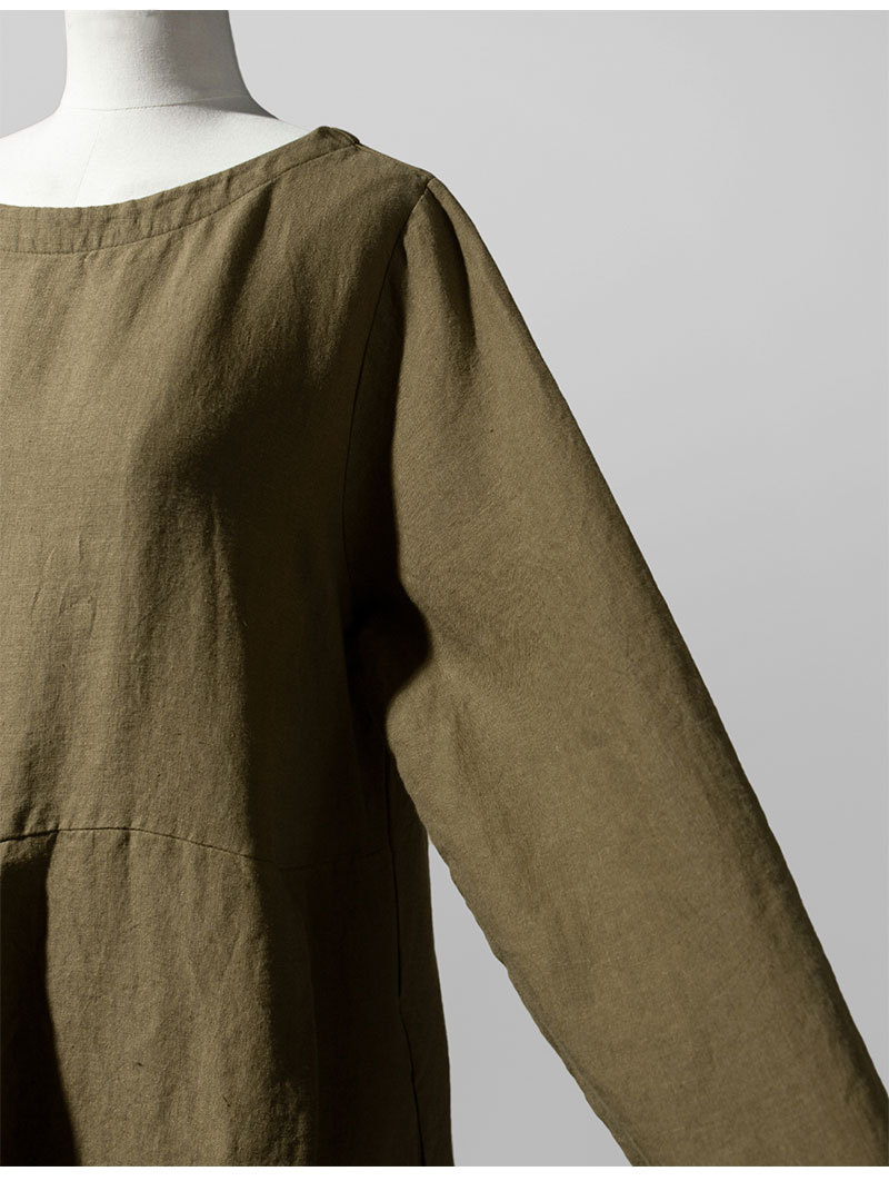上品な気質を演出するシンプルな長袖シャツデザインのロングワンピース。