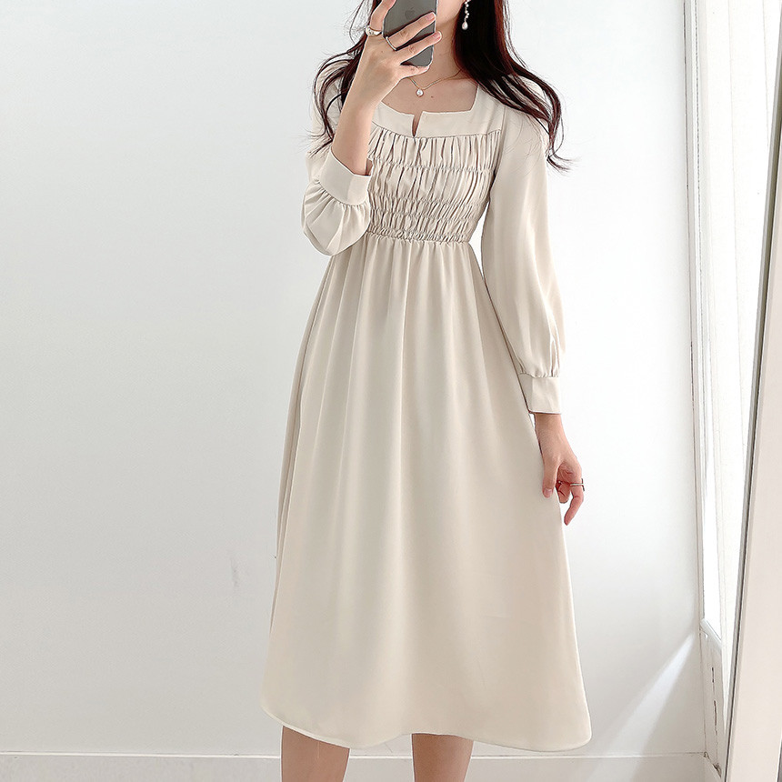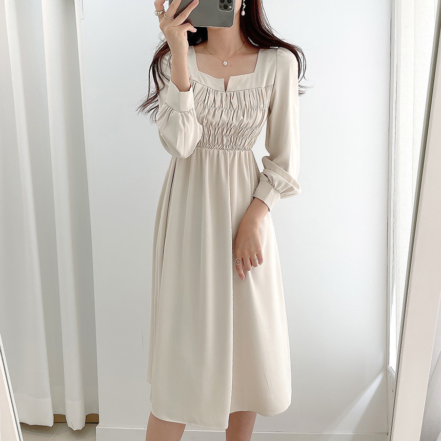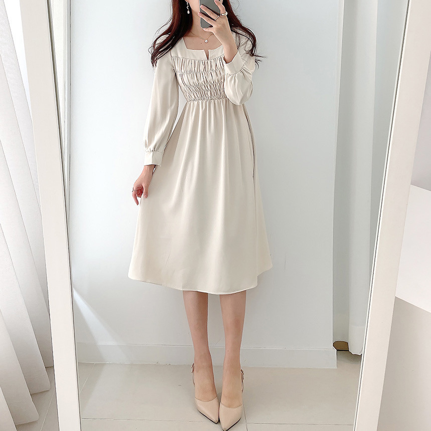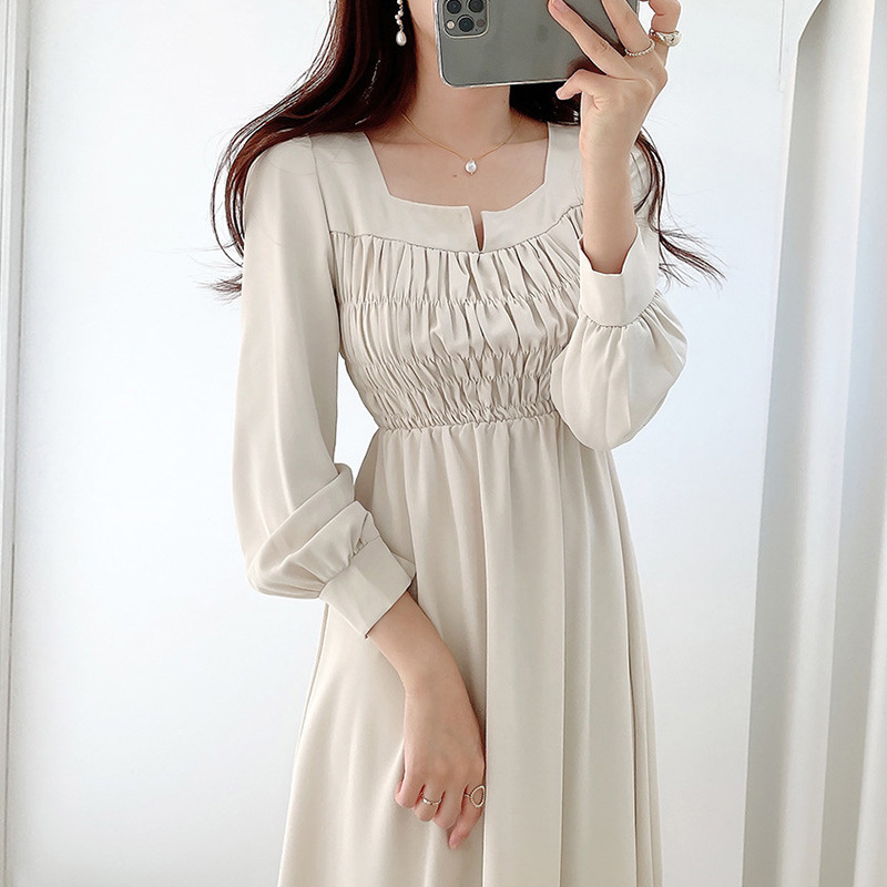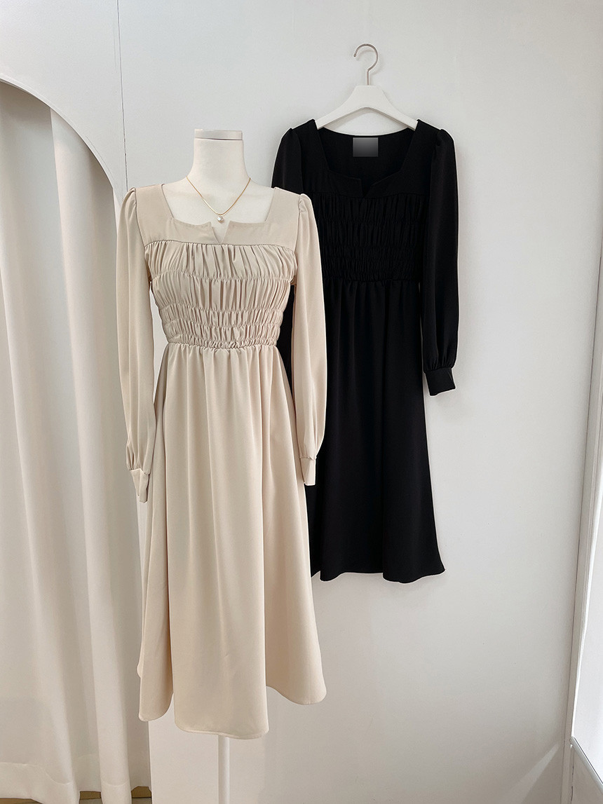 上品なスクエアネックとギャザーデザインが魅力的な韓国風シャツワンピース。