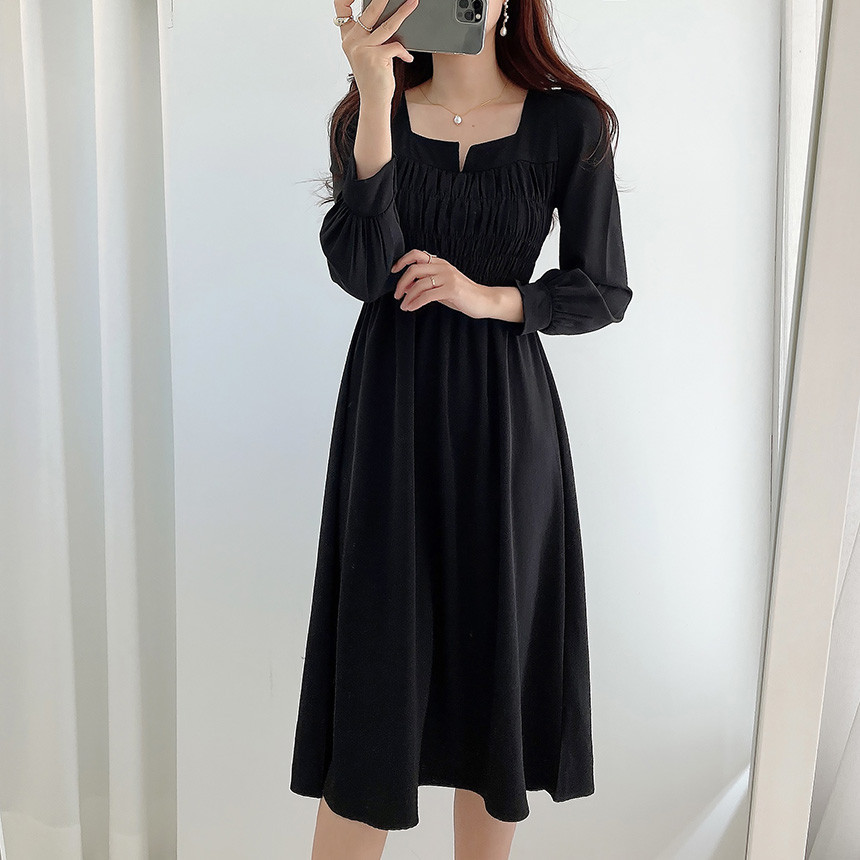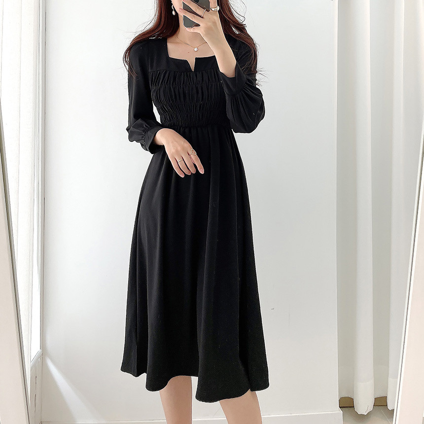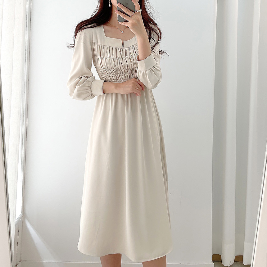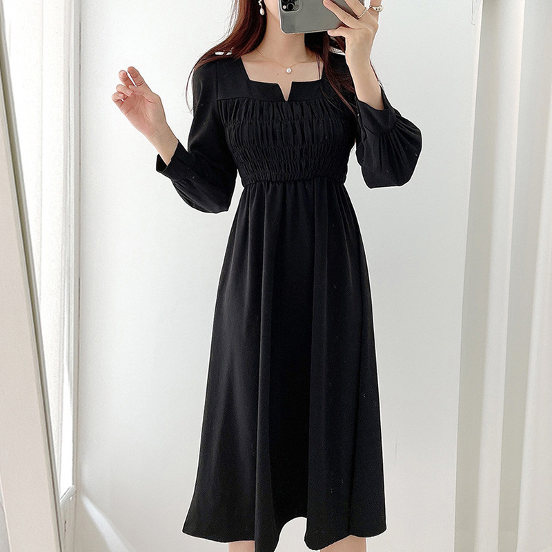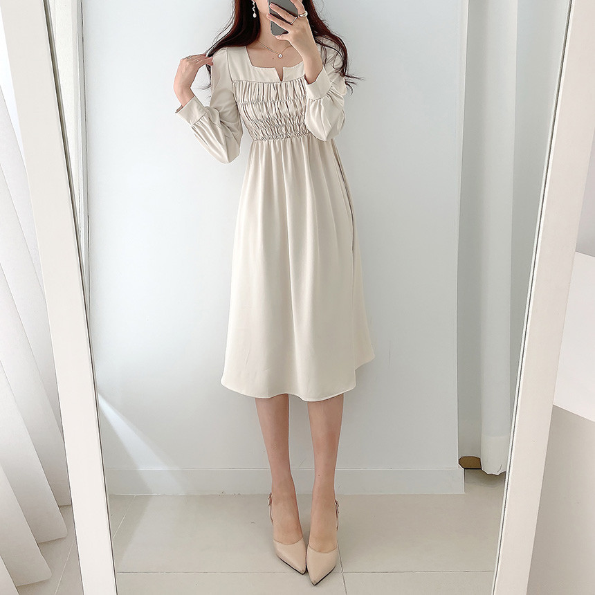 上品なスクエアネックとギャザーデザインが魅力的な韓国風シャツワンピース。