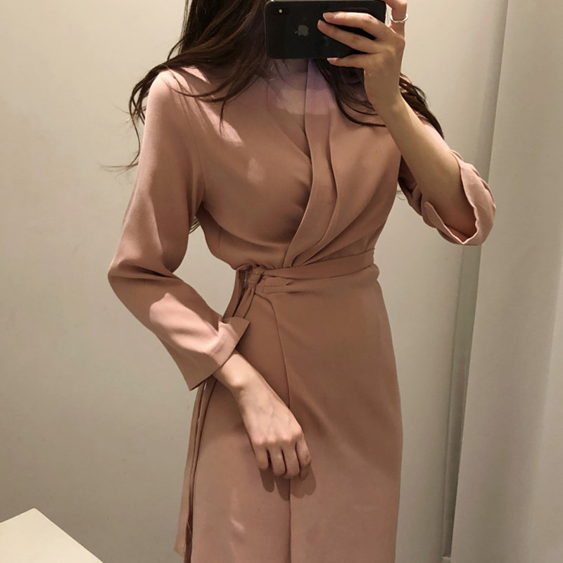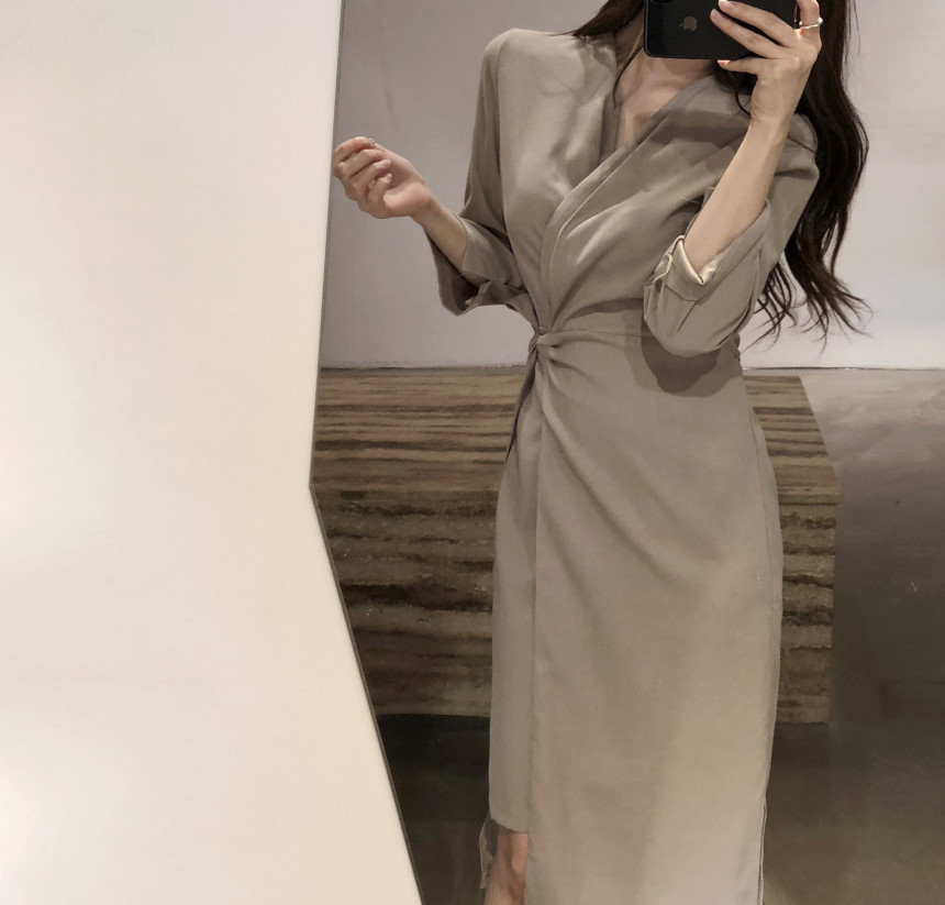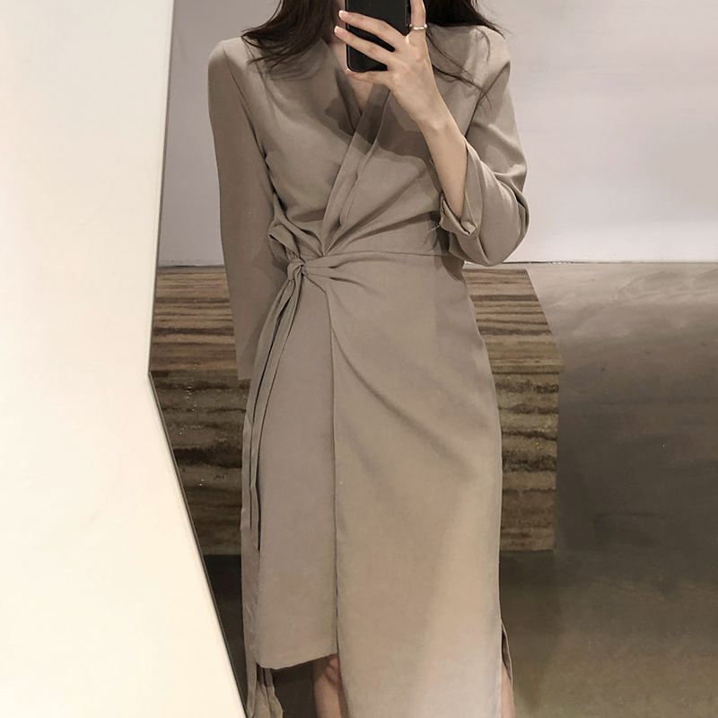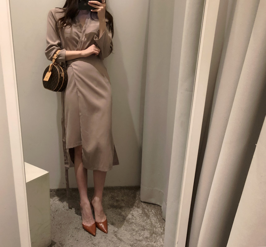 エレガントで個性的なデザインが魅力の長袖シャツワンピース。