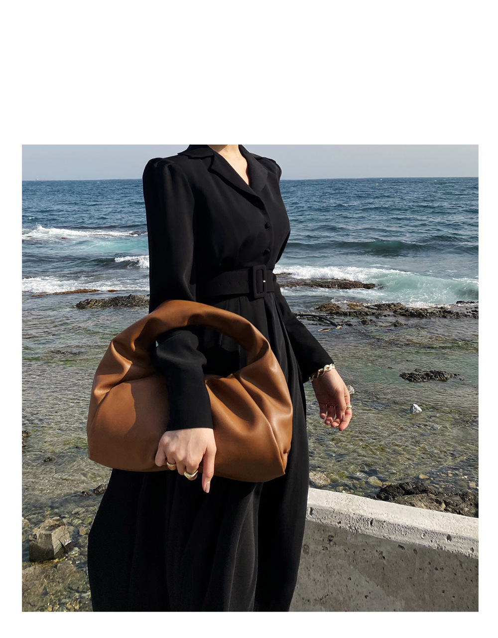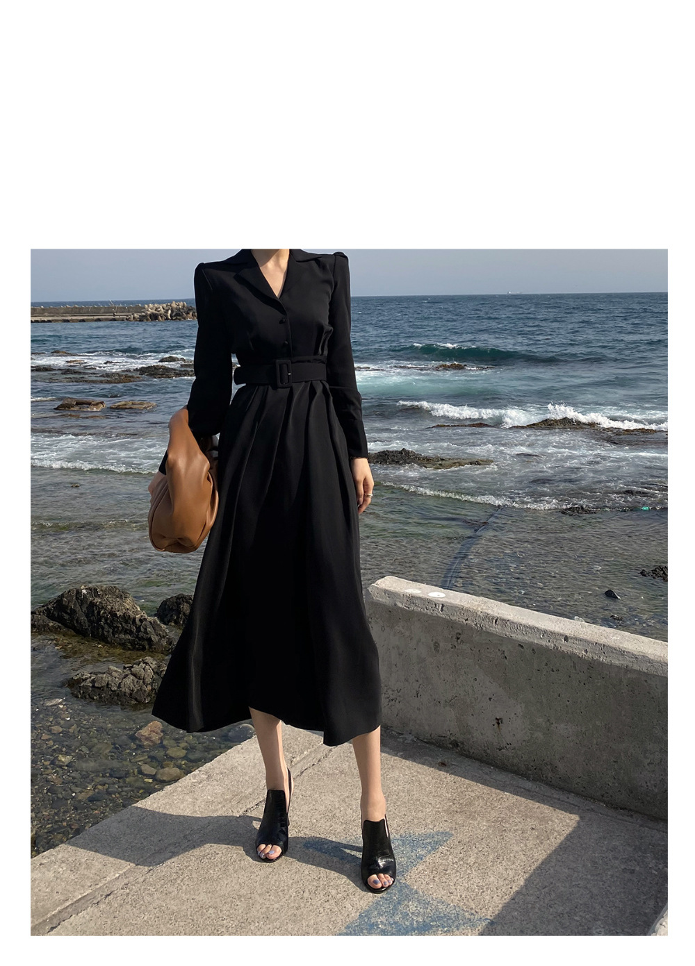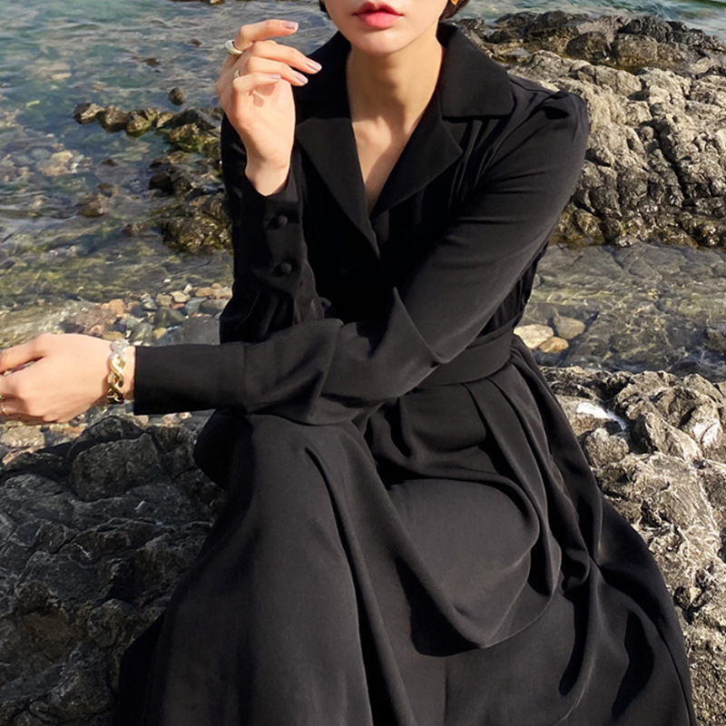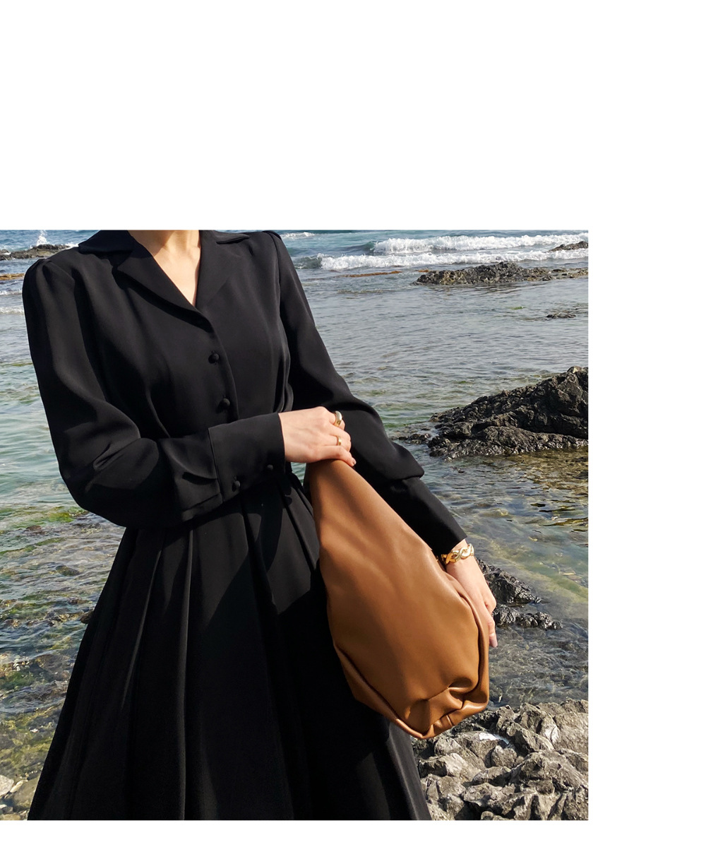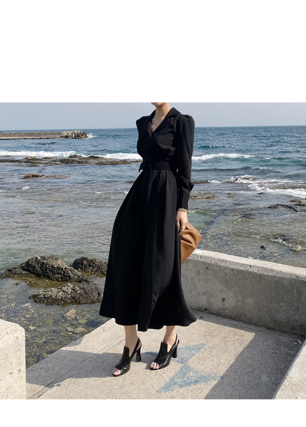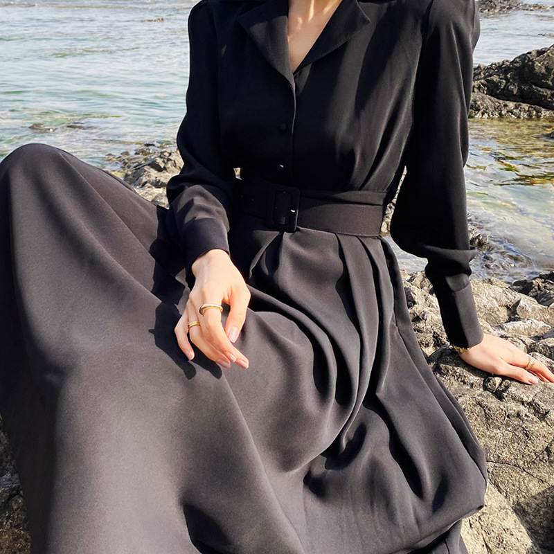 洗練された大人の女性を演出する黒色のシャツ型ロングワンピース。