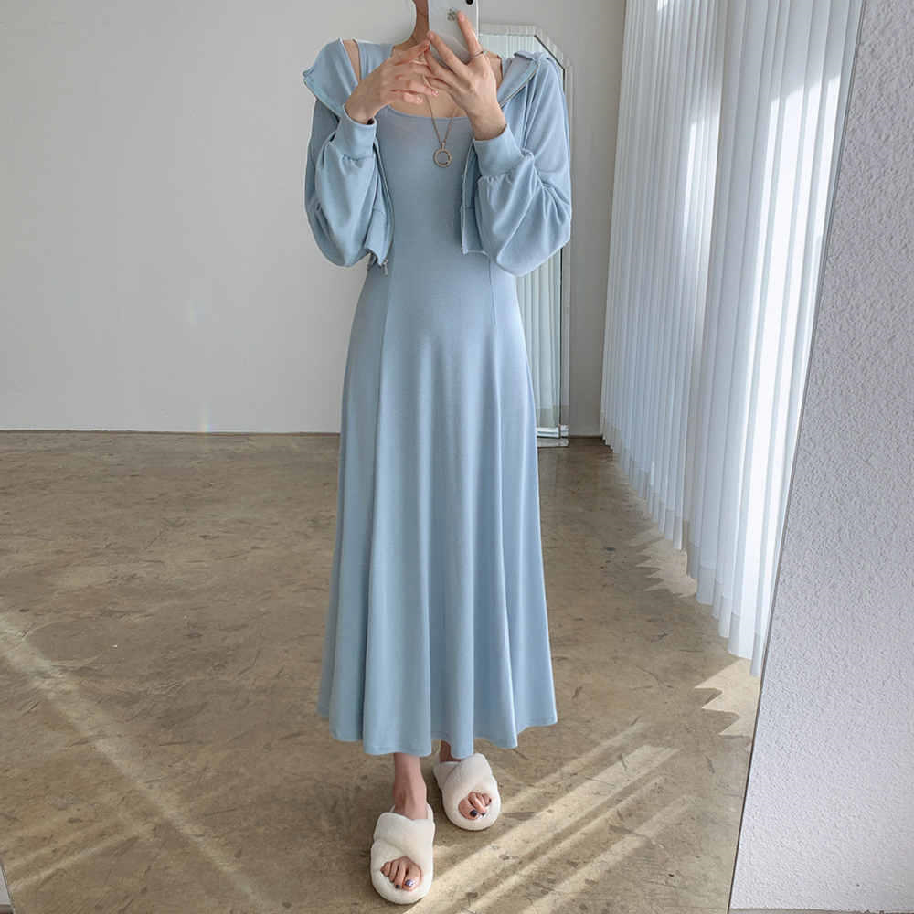 優しい印象を与える無地のニット素材を使用したロングワンピースです。