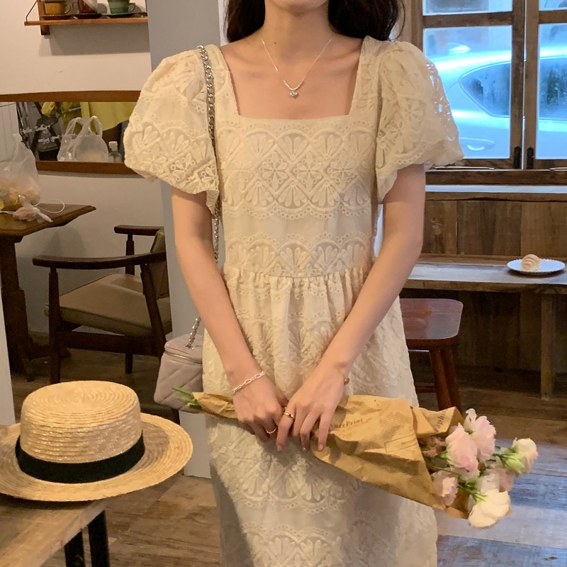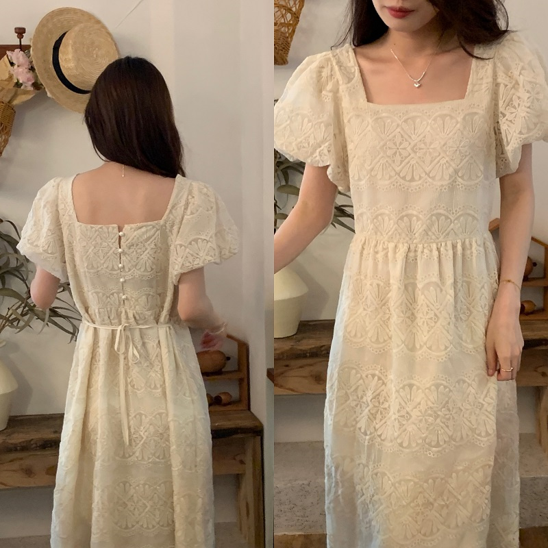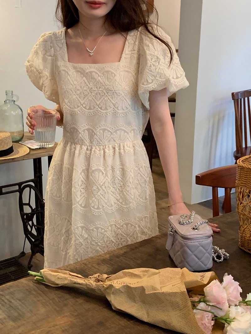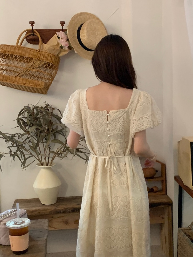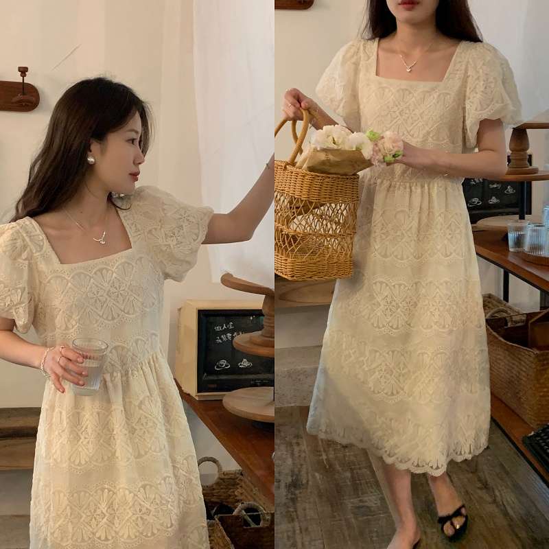 ふんわりとしたパフスリーブとスクエアネックラインが女性らしさを演出し、若々しい印象を与えます。