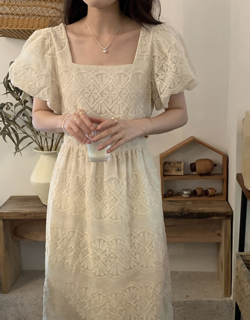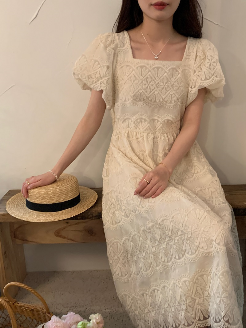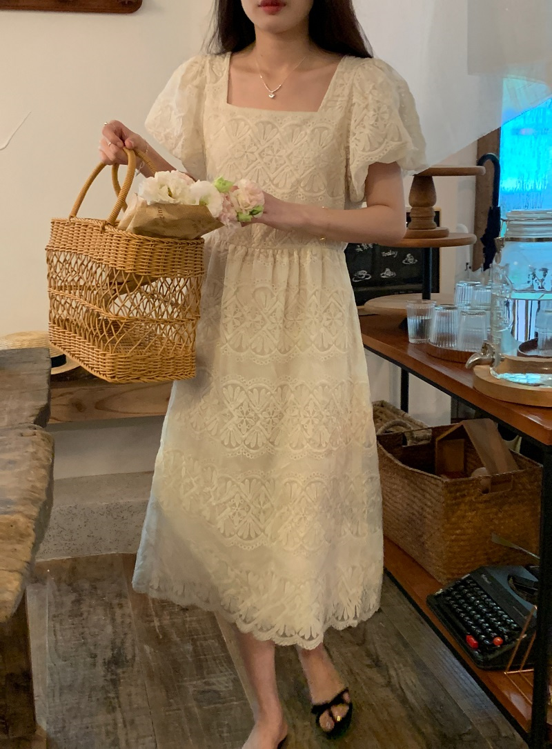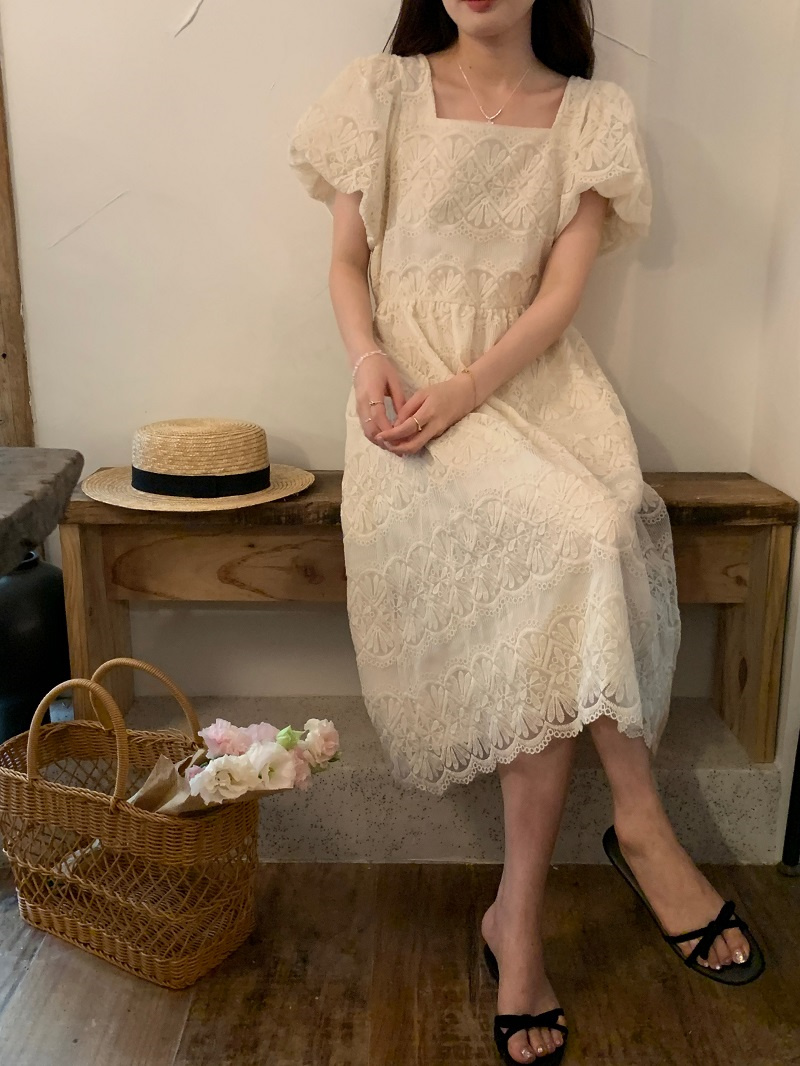 繊細なレース刺繍が美しい上品なロングワンピース。