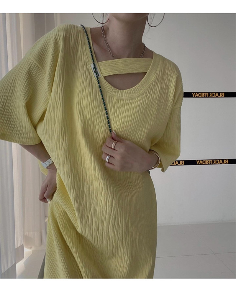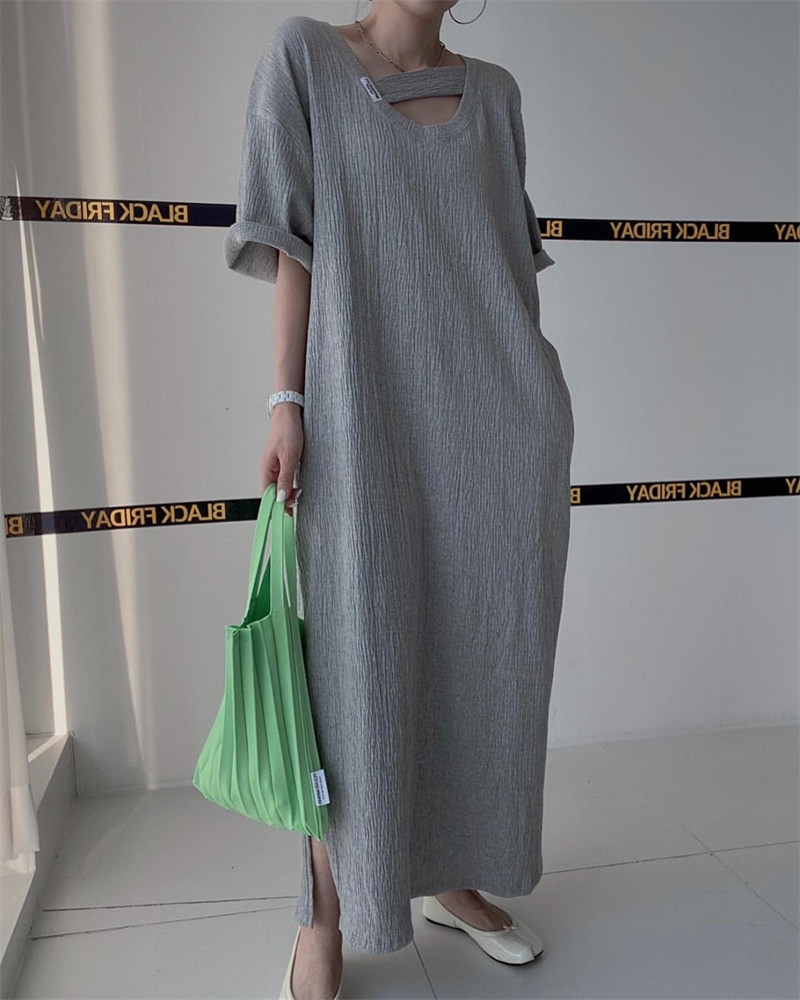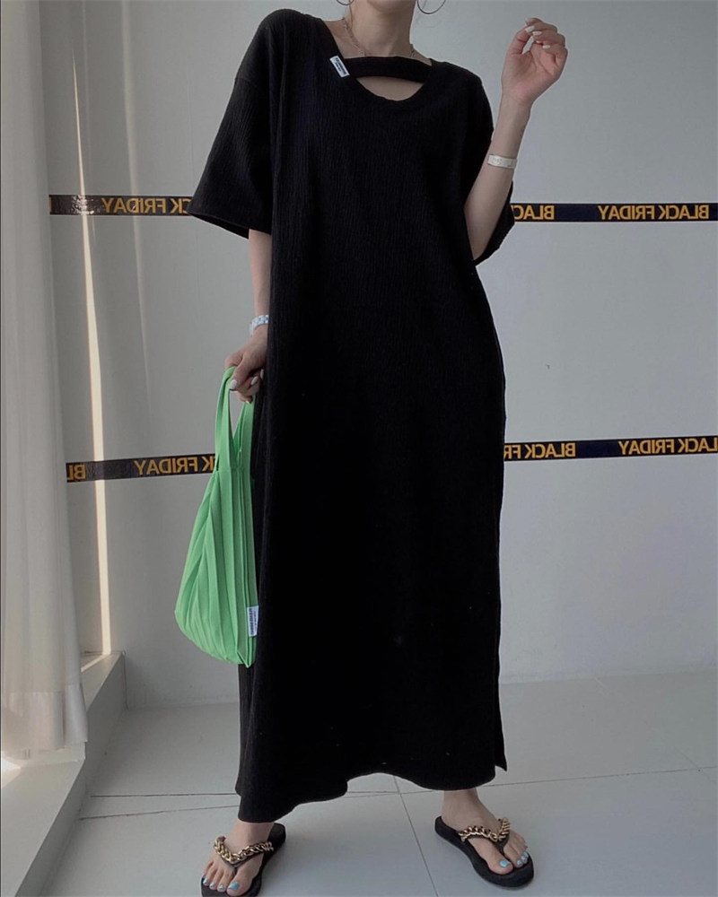 おしゃれな胸元カットアウトデザインが特徴的なスウェット素材のロングワンピース。