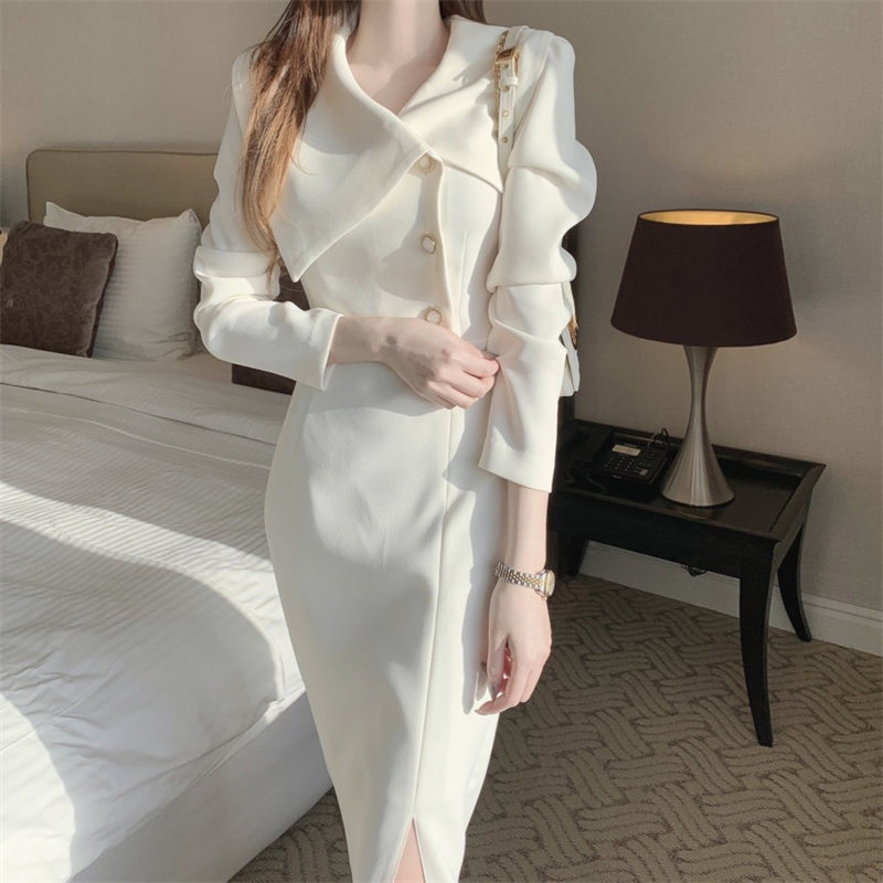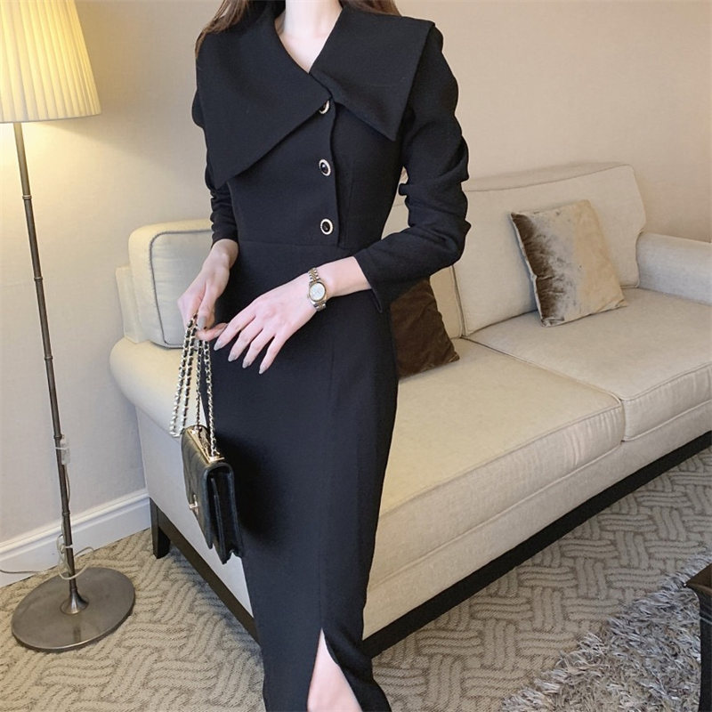 大きな襟とボタンデザインが特徴的なロングワンピースで、エレガントな印象を演出。