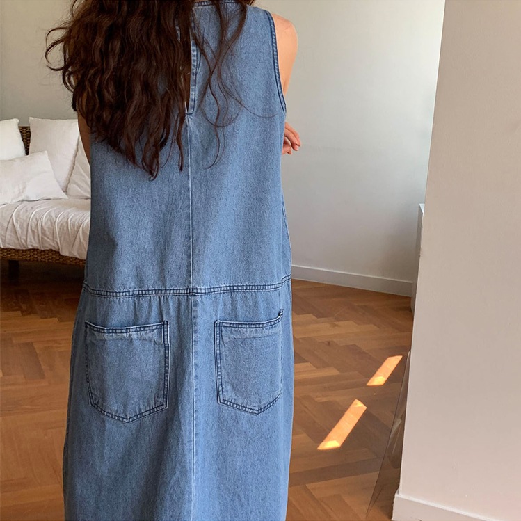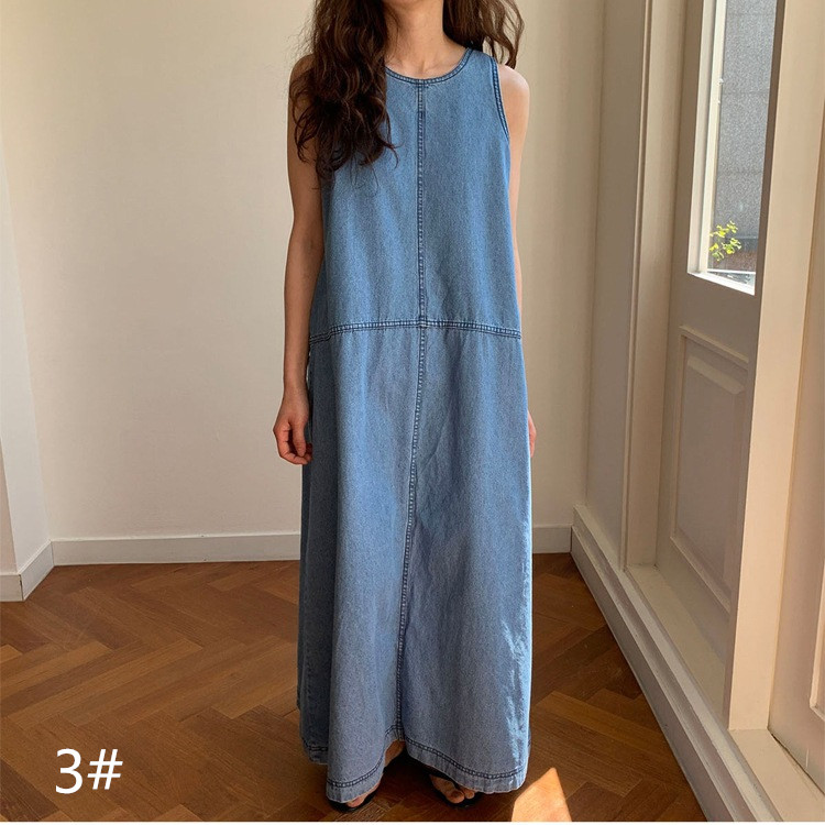 一枚でお洒落を楽しめる大人女子にぴったりの袖なしデニム風ワンピース。
