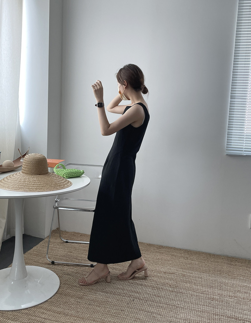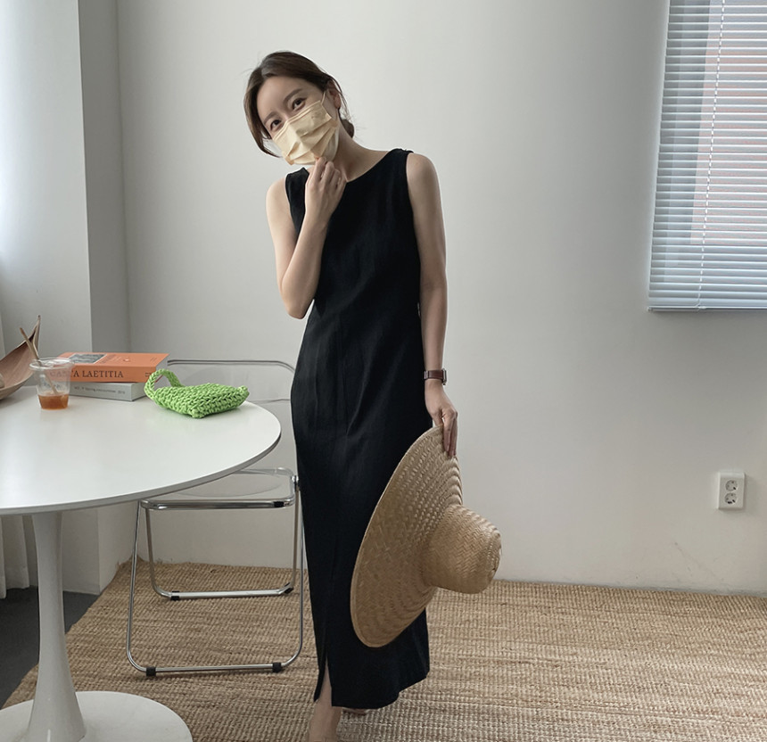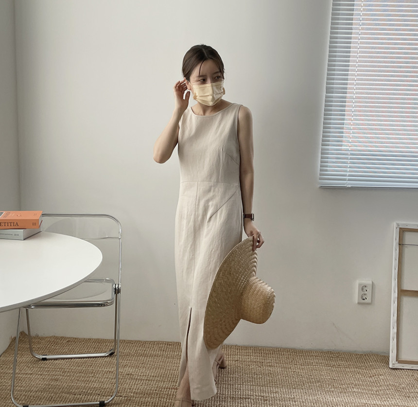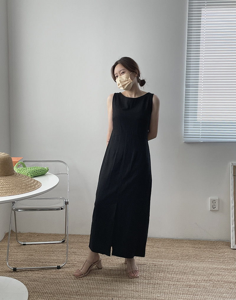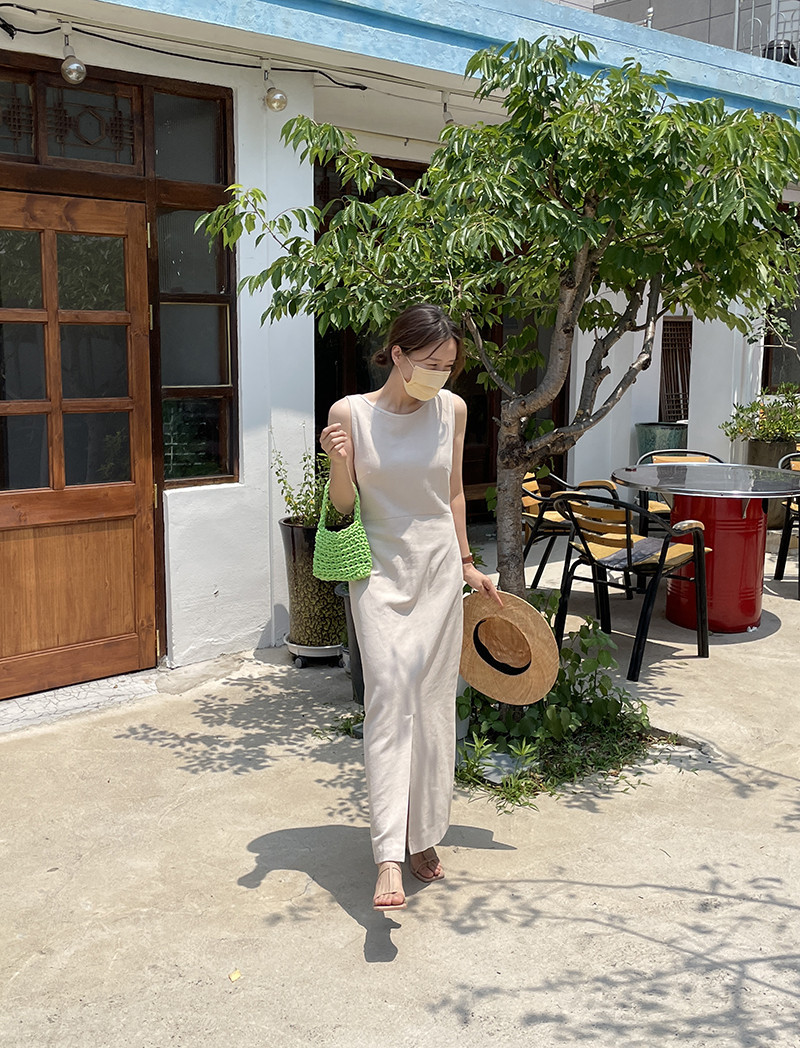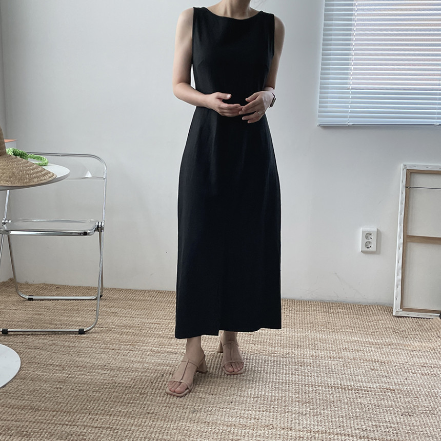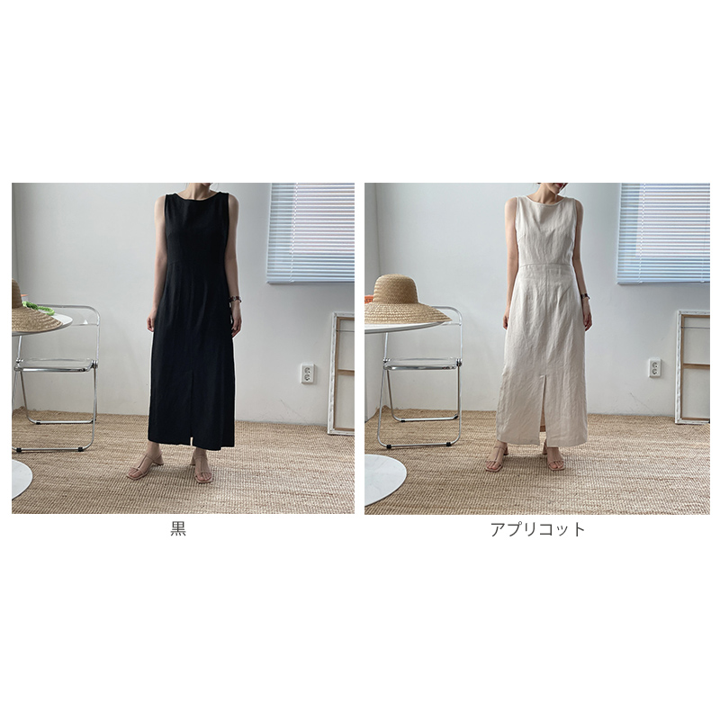 ノースリーブのすっきりとしたデザインで、ロングワンピースならではの上品なシルエットを演出。