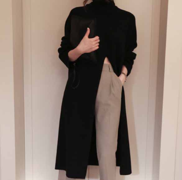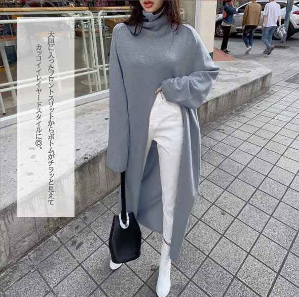 ■コメント ・一見ロングワンピースのように見えるセーター。 ・大胆に入ったフロントスリットからボトムがチラッと見えてカッコイイレイヤードスタイルに◎。 ・タートルネックで首元あったか。 ・パンツやロングスカートなどとの相性が抜群です。 ■サイズ(単位:約cm) フリーサイズ 総丈120cm バスト110cm 袖丈58cm(OK) ※平置き採寸の為、1-3cmの誤差がある場合があります。予めご了承下さいませ。 ■カラー 画像に記載 ■裏地 なし ■生地の厚さ 普通 ■透け感 なし ■伸縮性 あり ■素材 アクリル80%、ポリエステル20% ■重量 400g