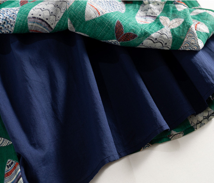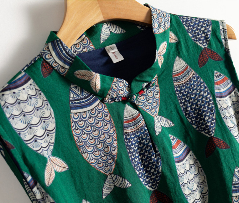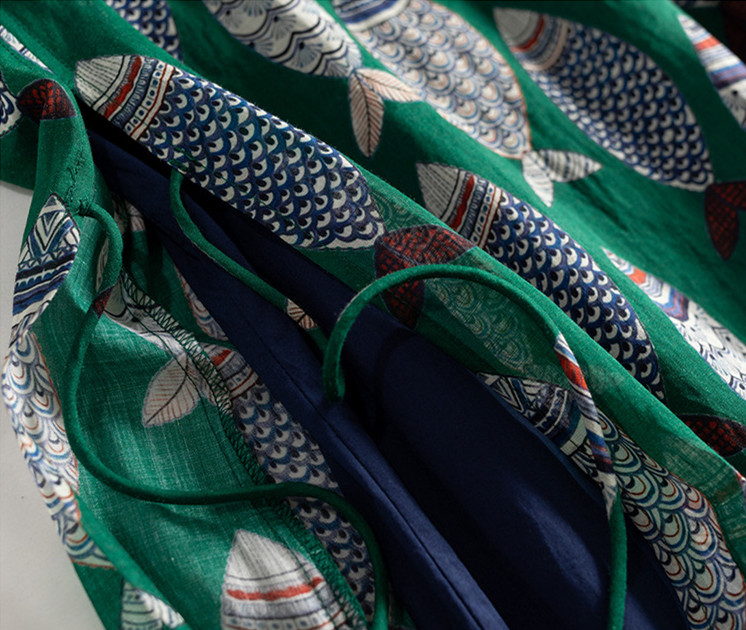 鮮やかなグリーンベースに個性的な魚柄が映える、こなれ感のあるロングワンピースです。