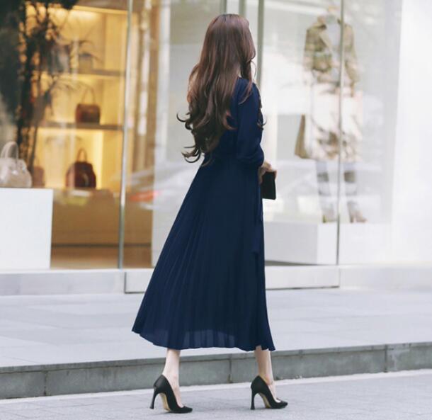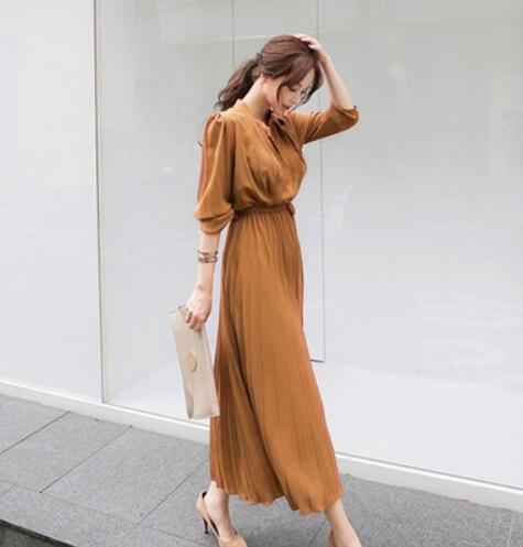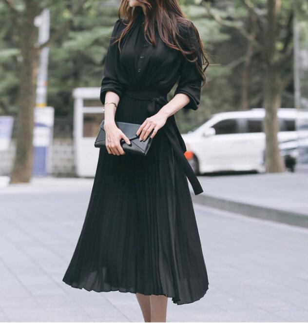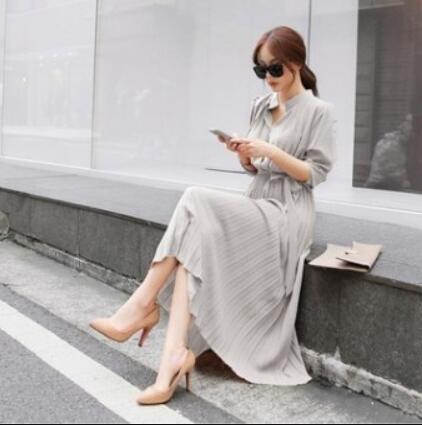 上品なシャツデザインとエレガントなプリーツが魅力的なロングワンピース。