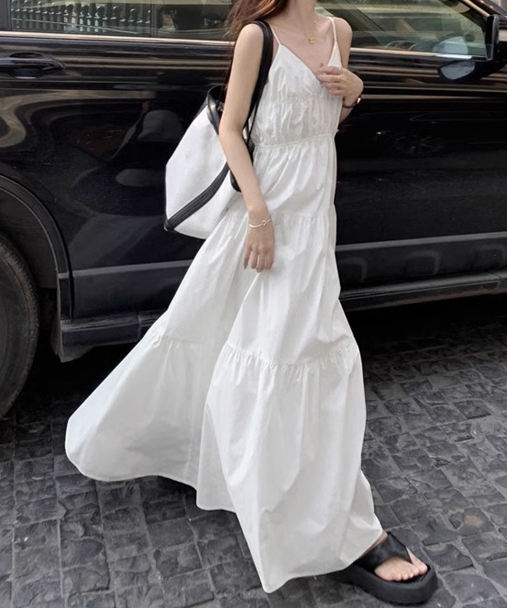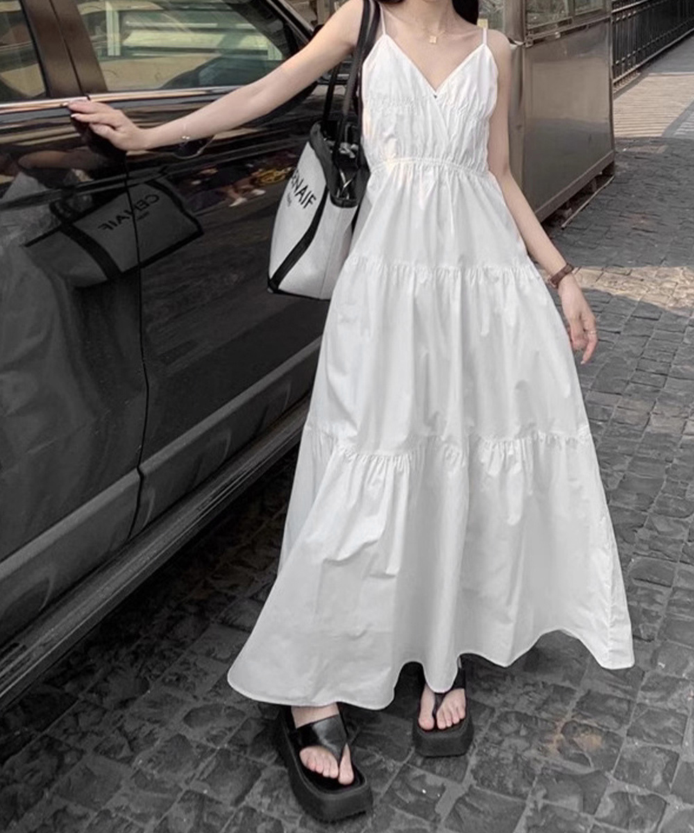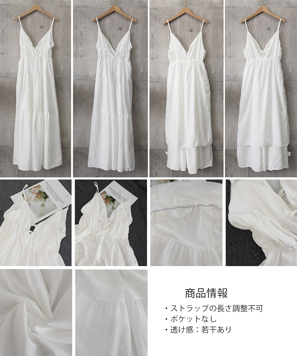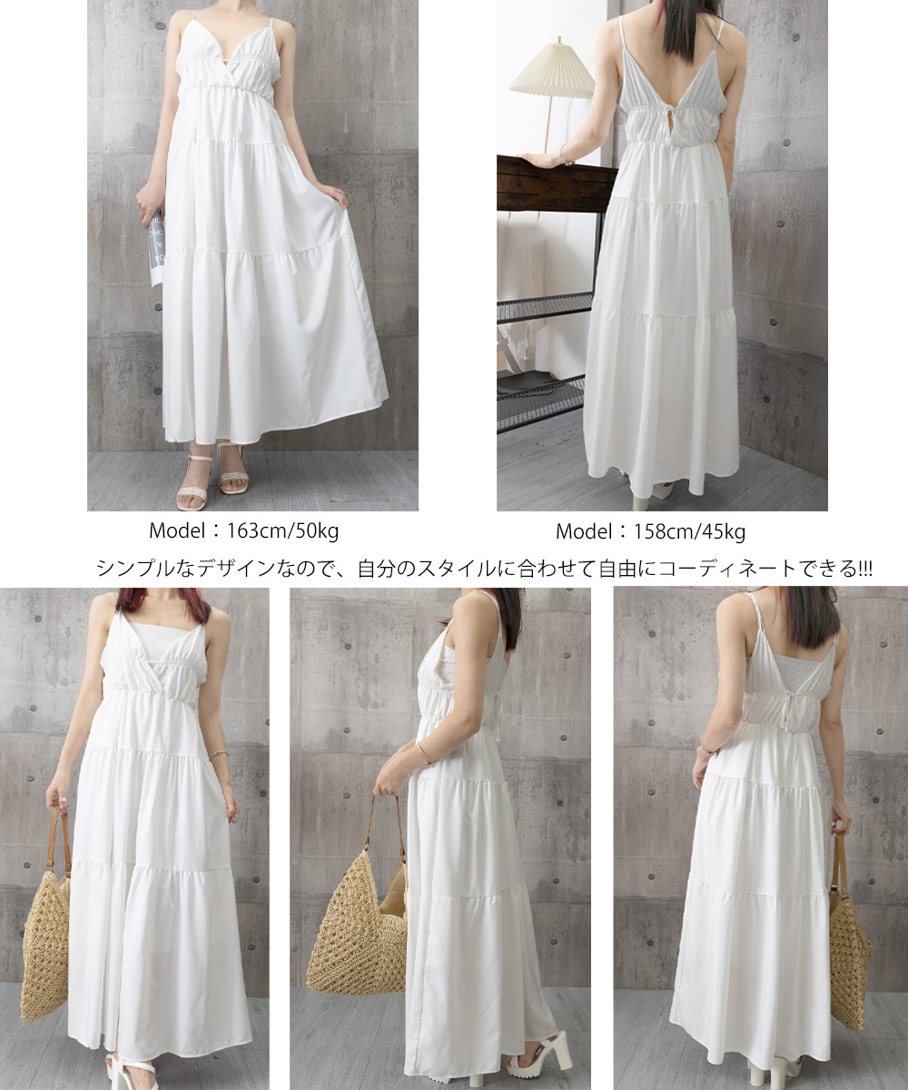 軽やかな素材とティアードシルエットが魅力的な、リゾート感あふれるキャミ型ロングワンピース。