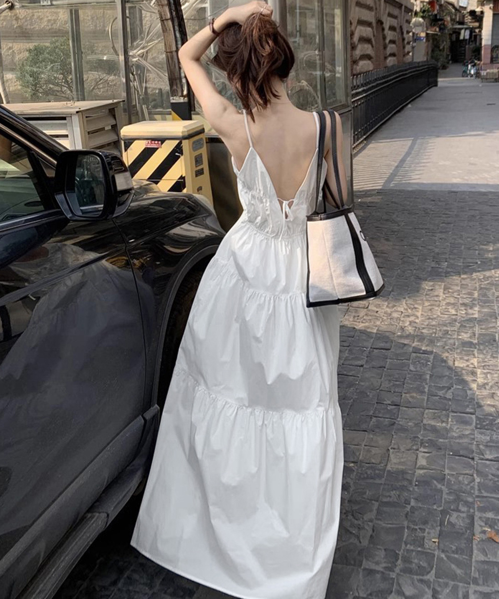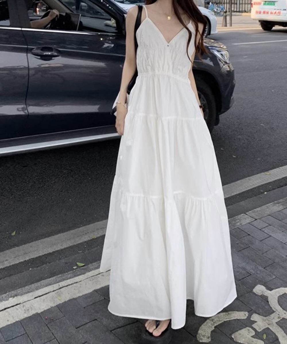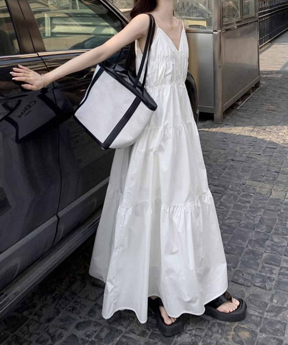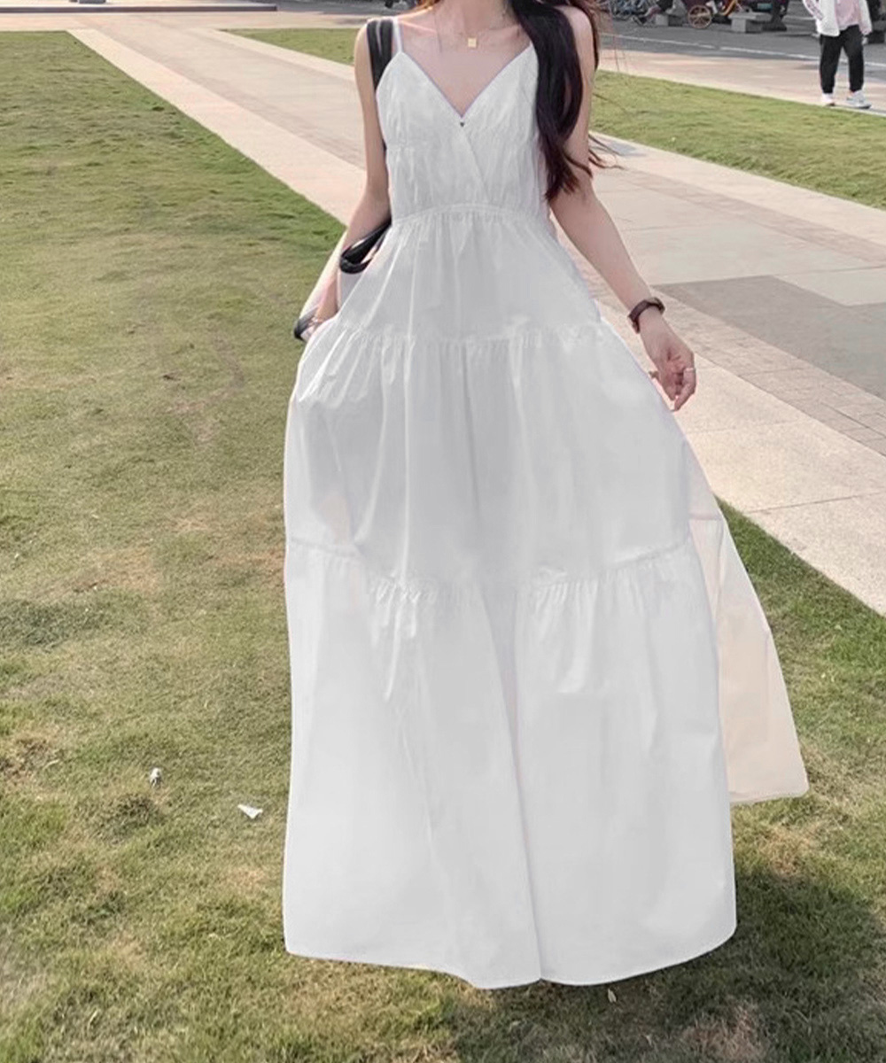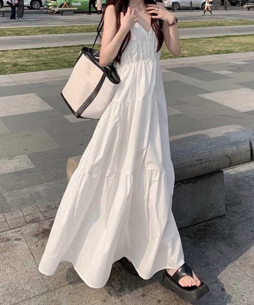 軽やかな素材とティアードシルエットが魅力的な、リゾート感あふれるキャミ型ロングワンピース。