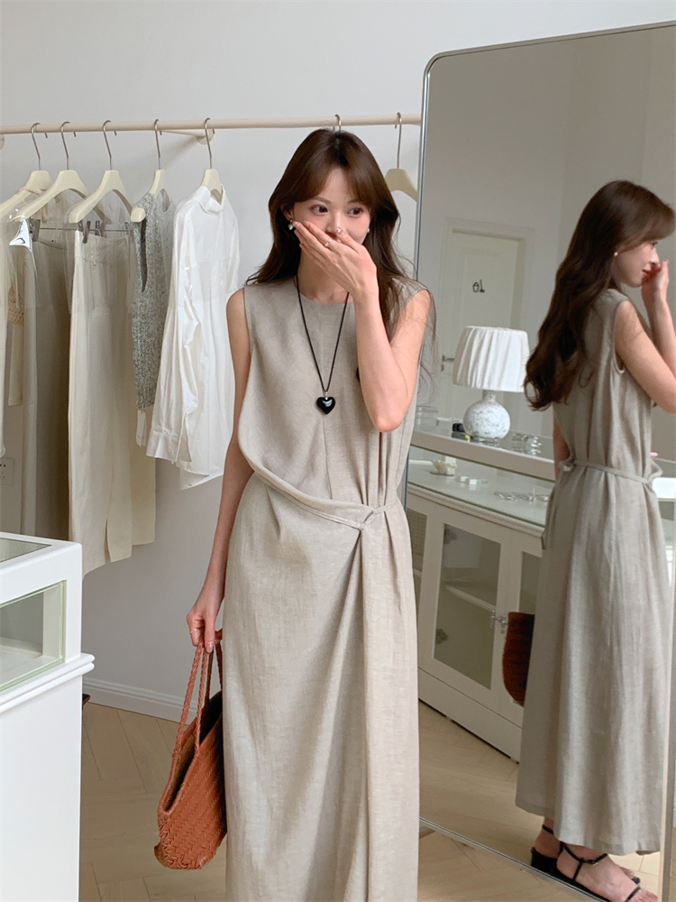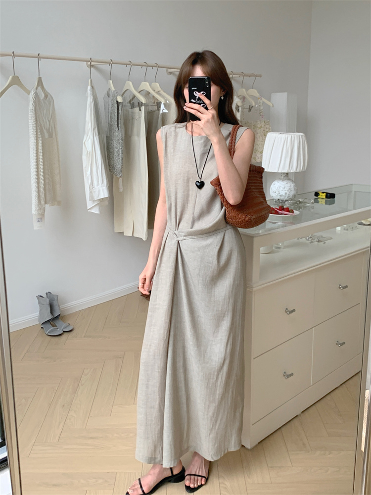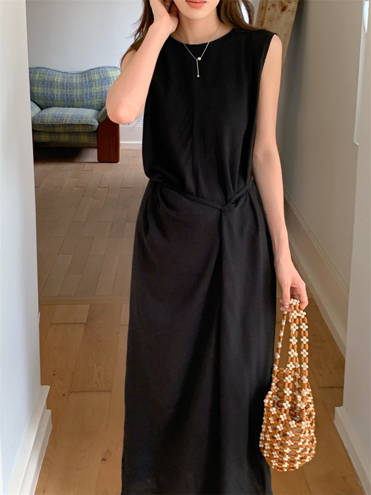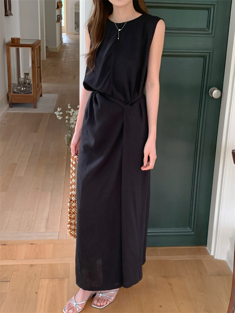 腰ひも付きでウエストラインを美しく演出するロングワンピース