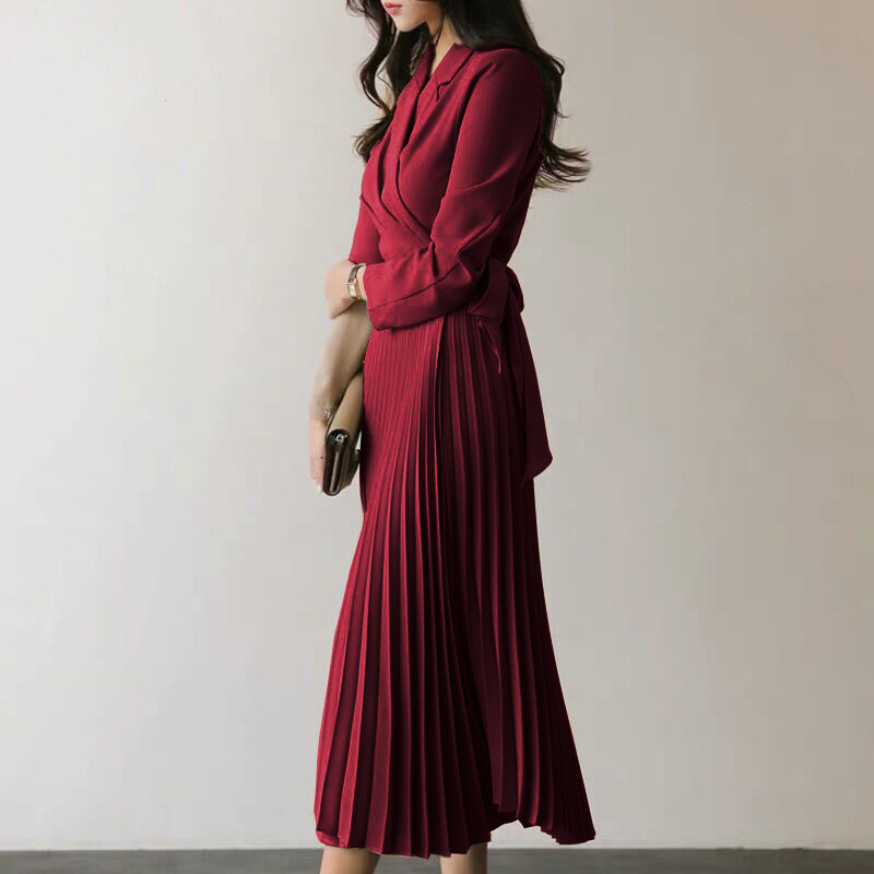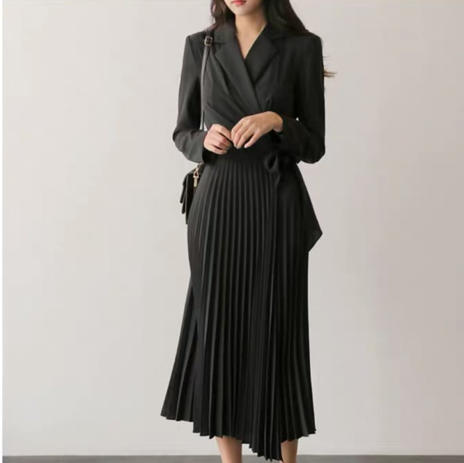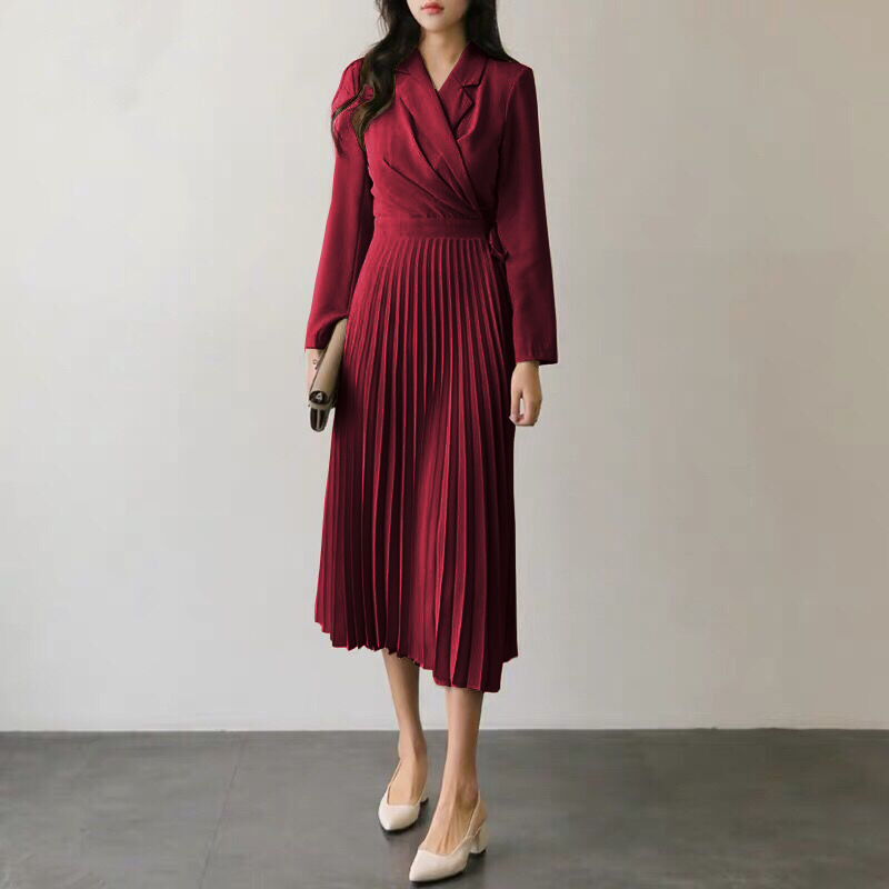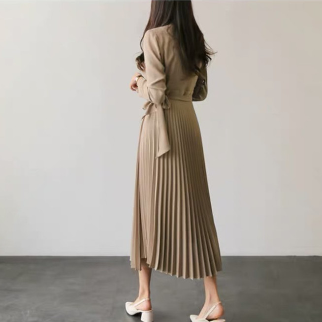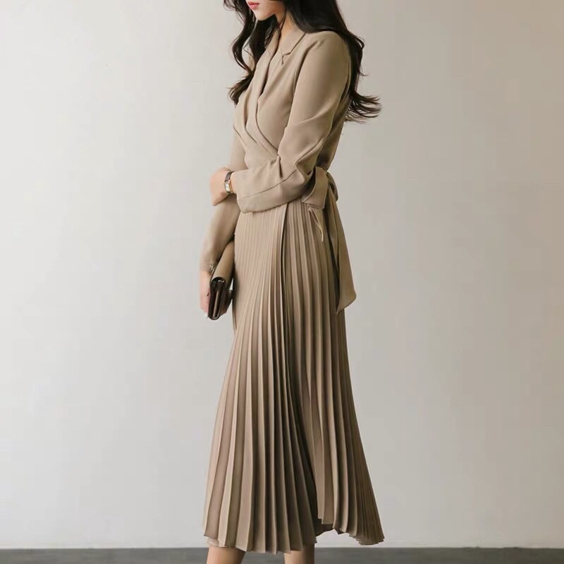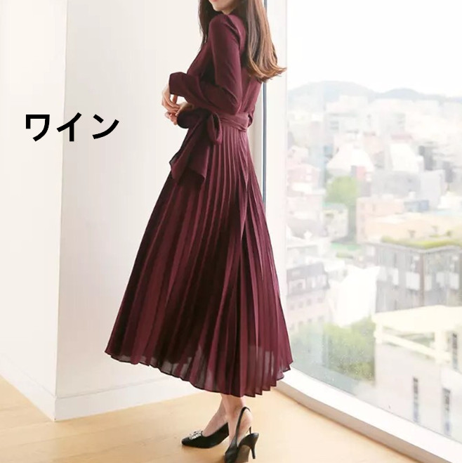 美しいプリーツスカートが歩くたびに優雅に揺れ、オフィスからお出かけまで幅広いシーンで活躍する一枚です。