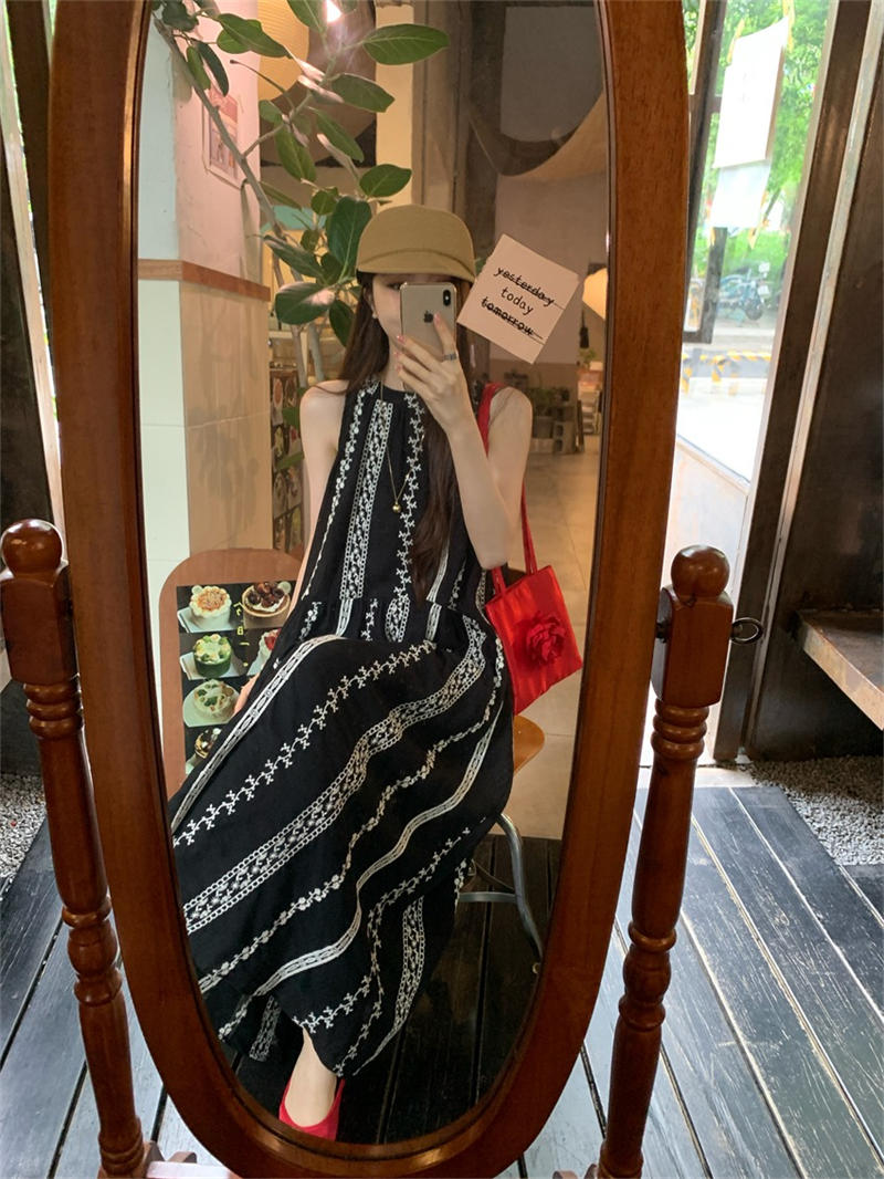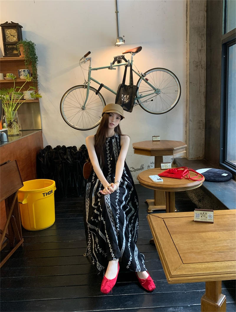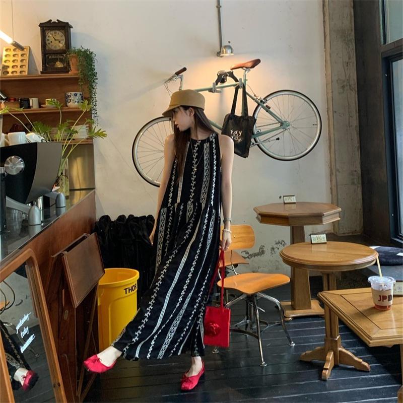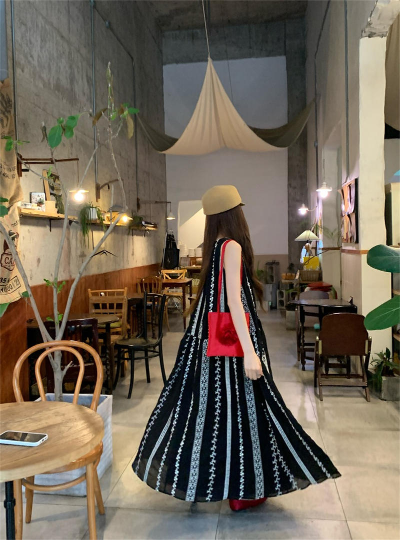 エレガントな縦縞模様が美しいノースリーブのロングワンピース。