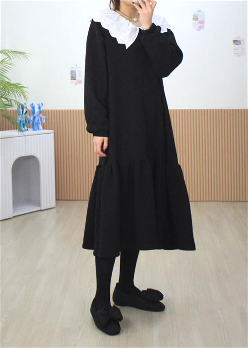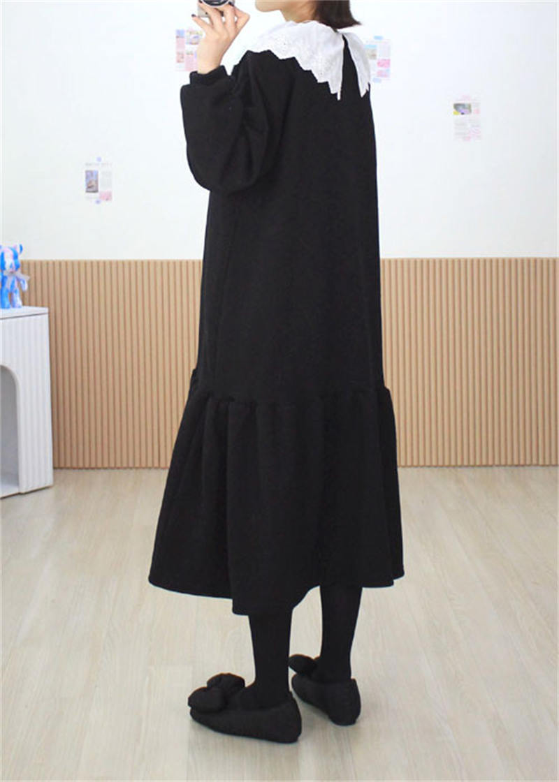 上品な白フリル襟がアクセントの黒ロングワンピース。