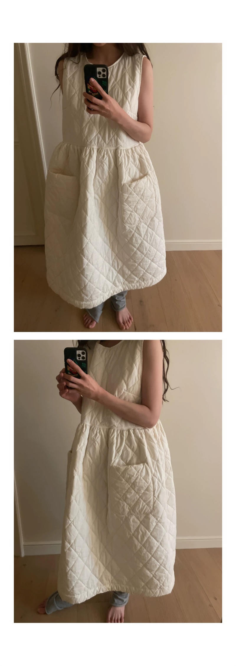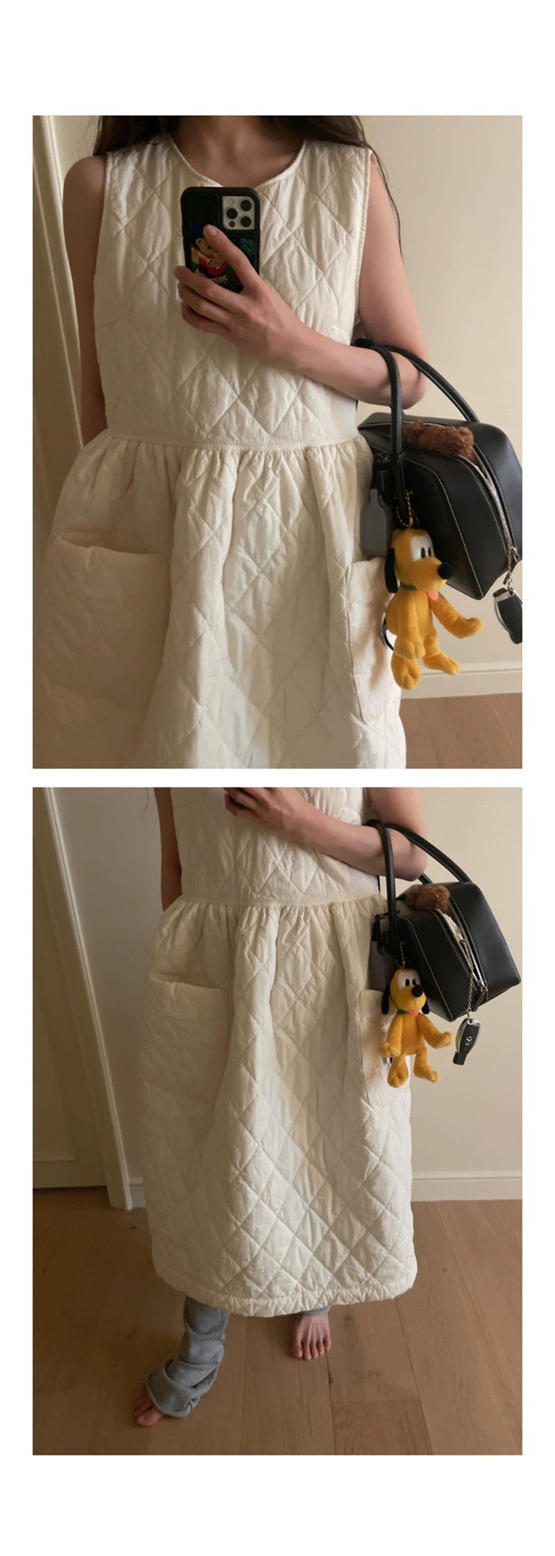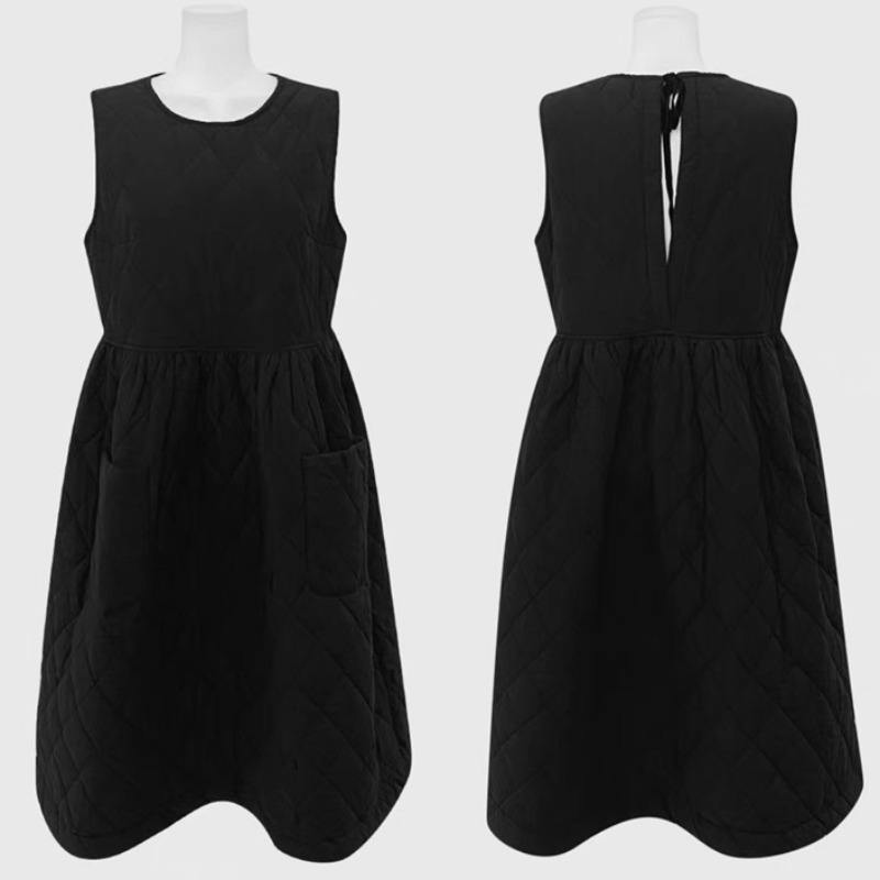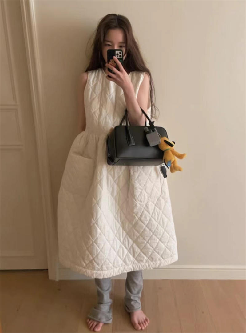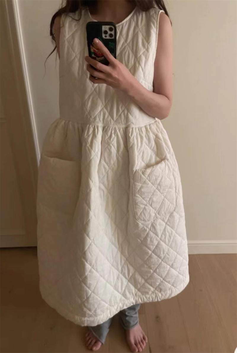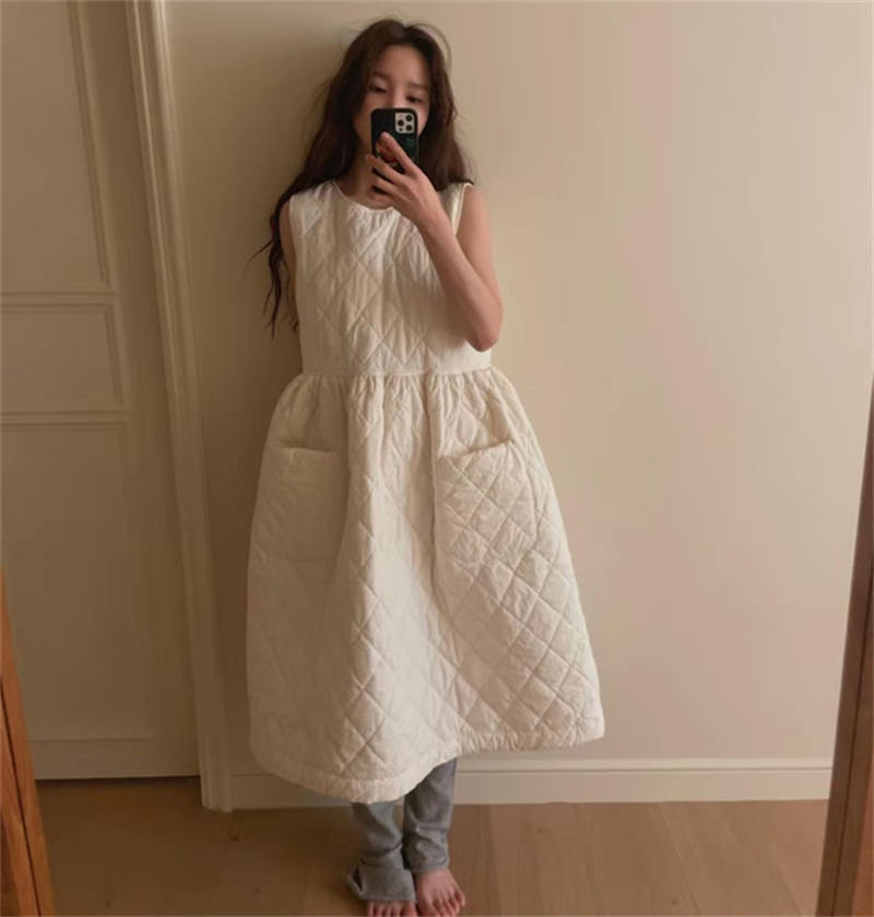 上品なキルティング素材を使用したノースリーブのロングワンピース。