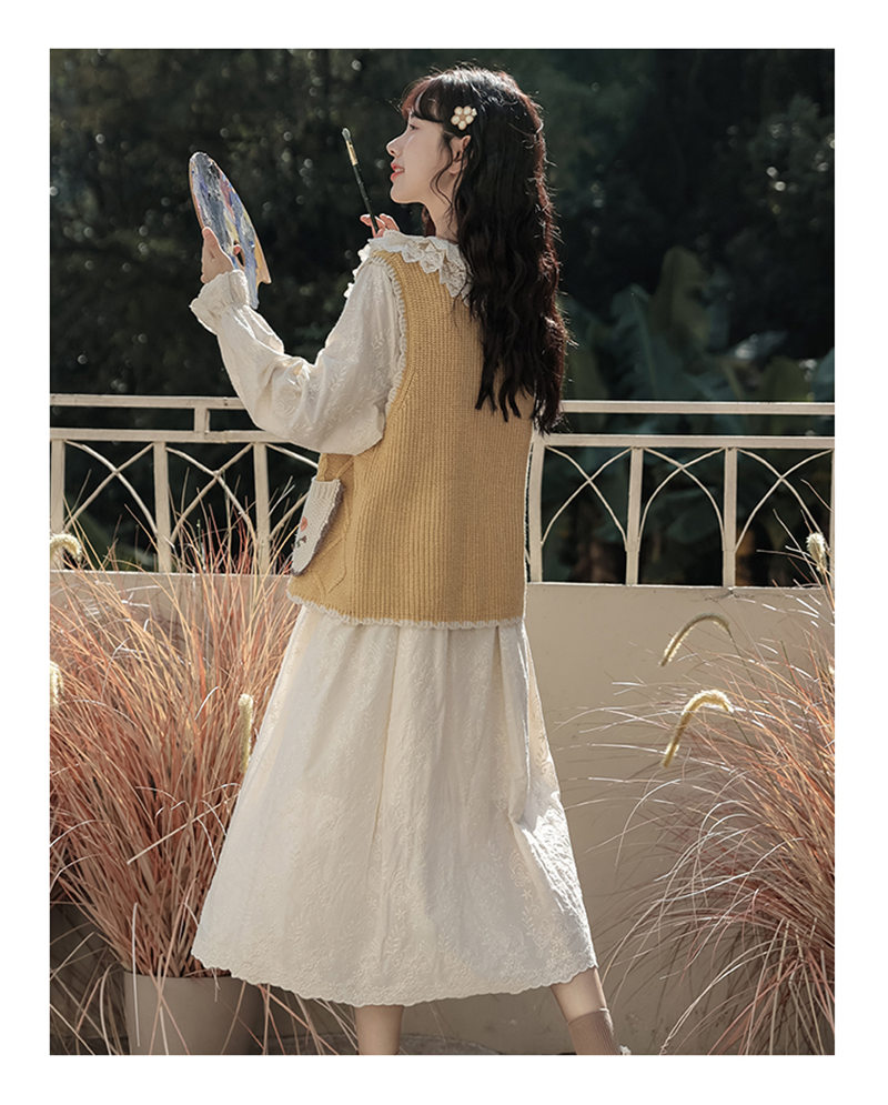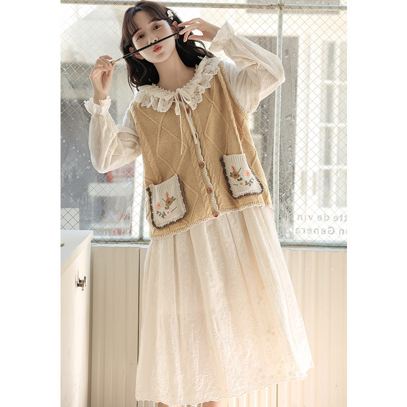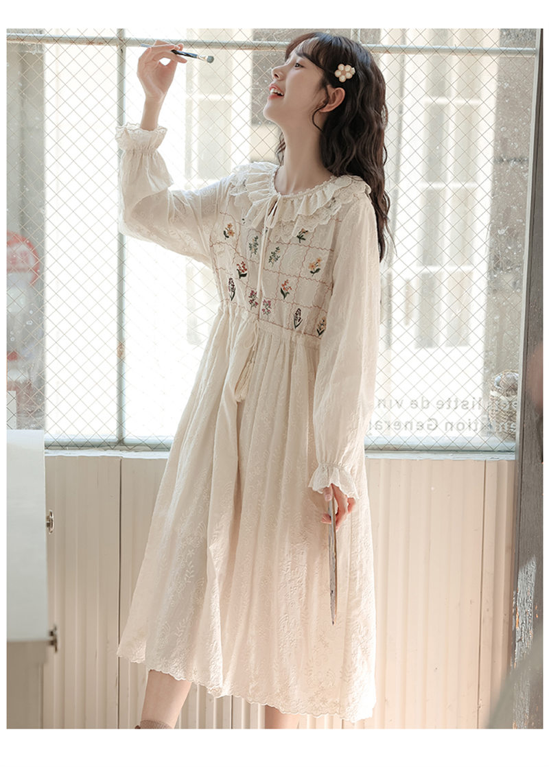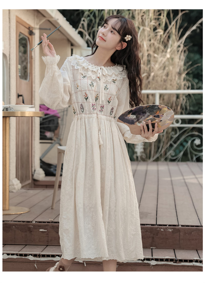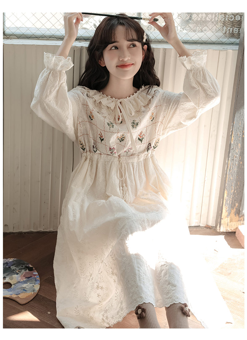 繊細な花刺繍とフリル襟が魅力的なロングワンピースです。