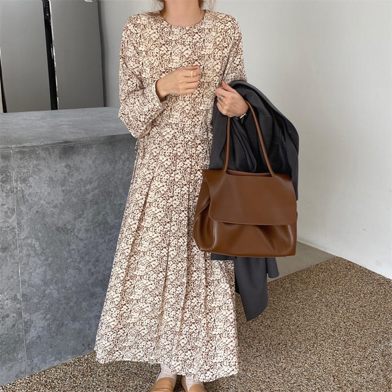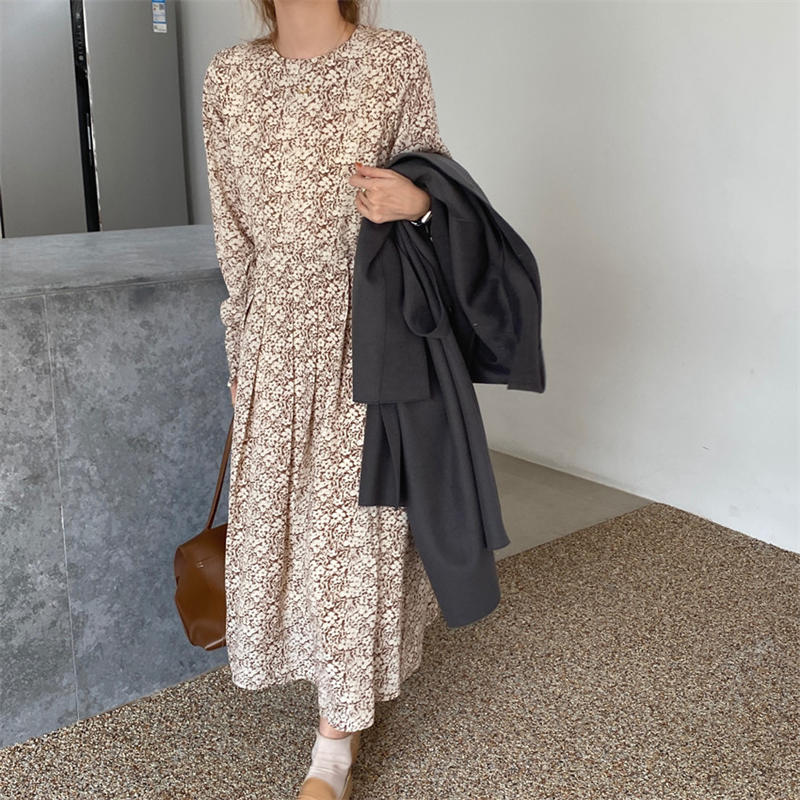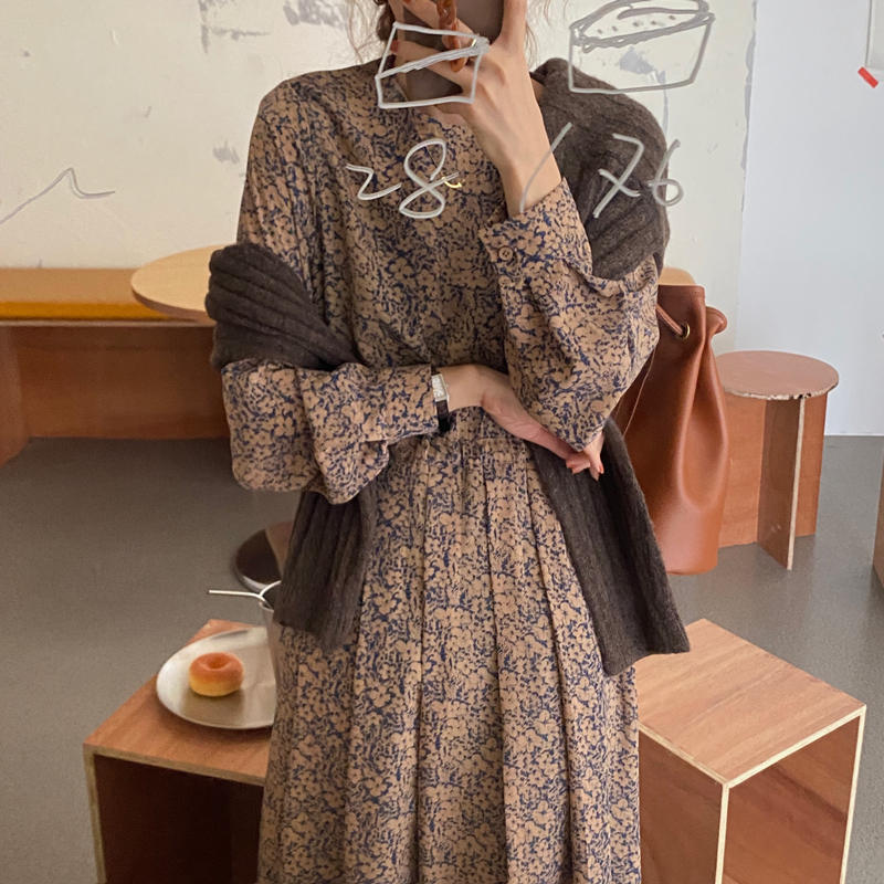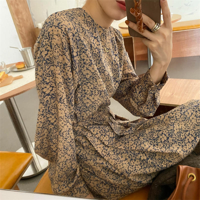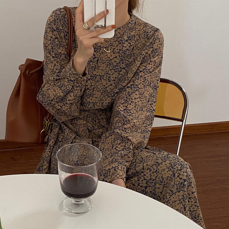 エレガントな小花柄が魅力的なシャツタイプのロングワンピース。