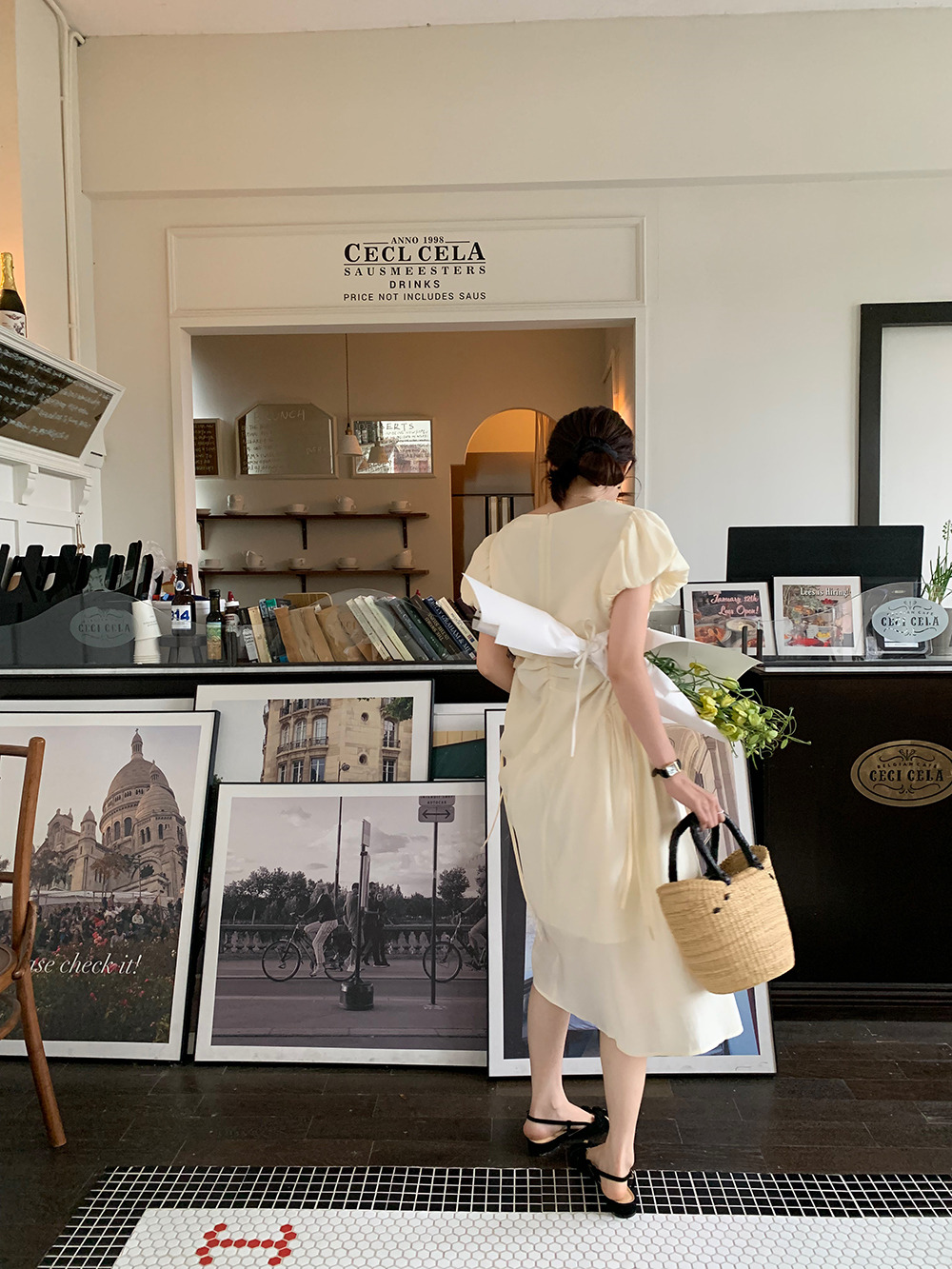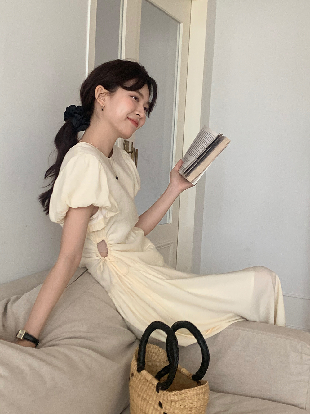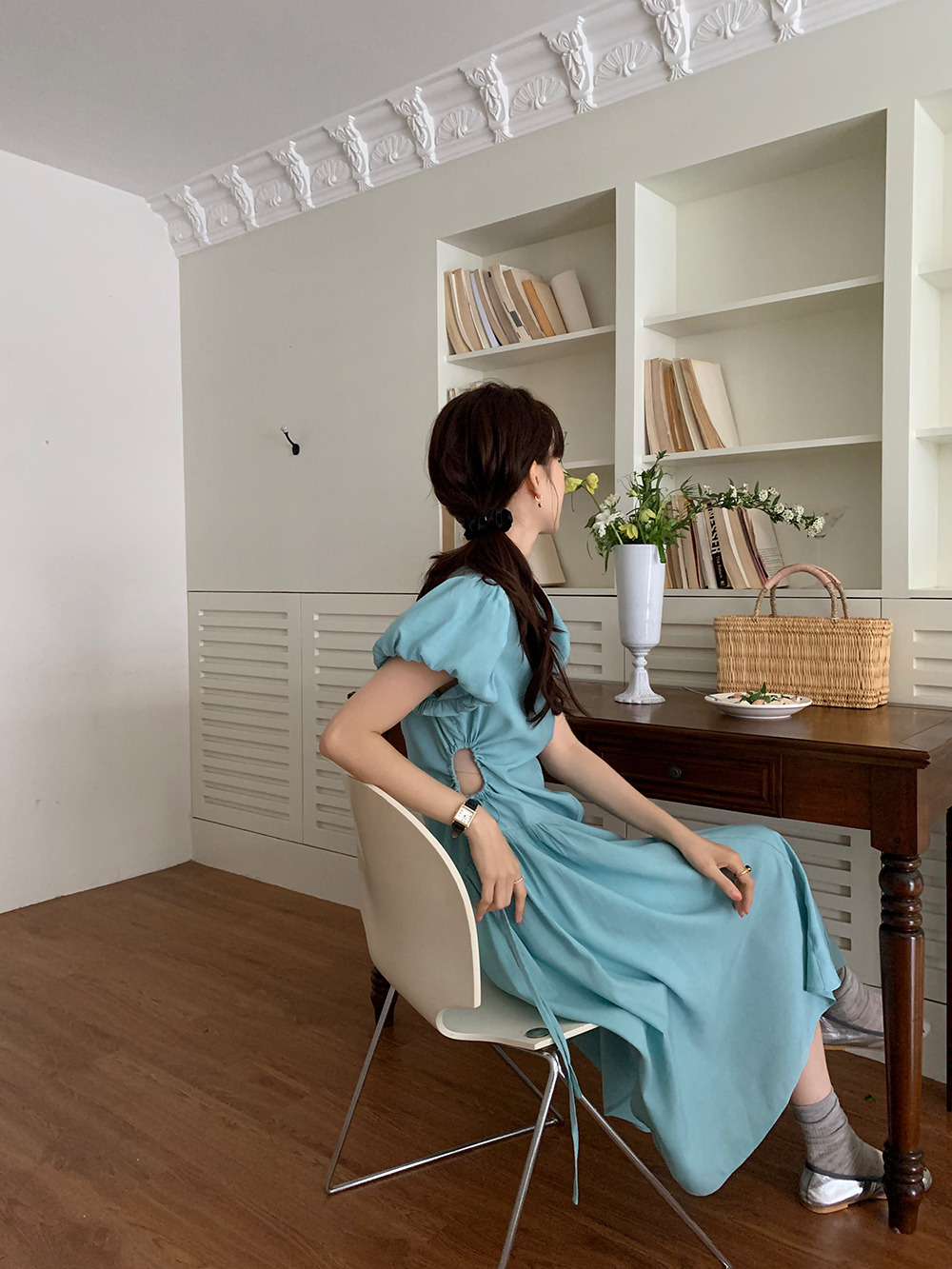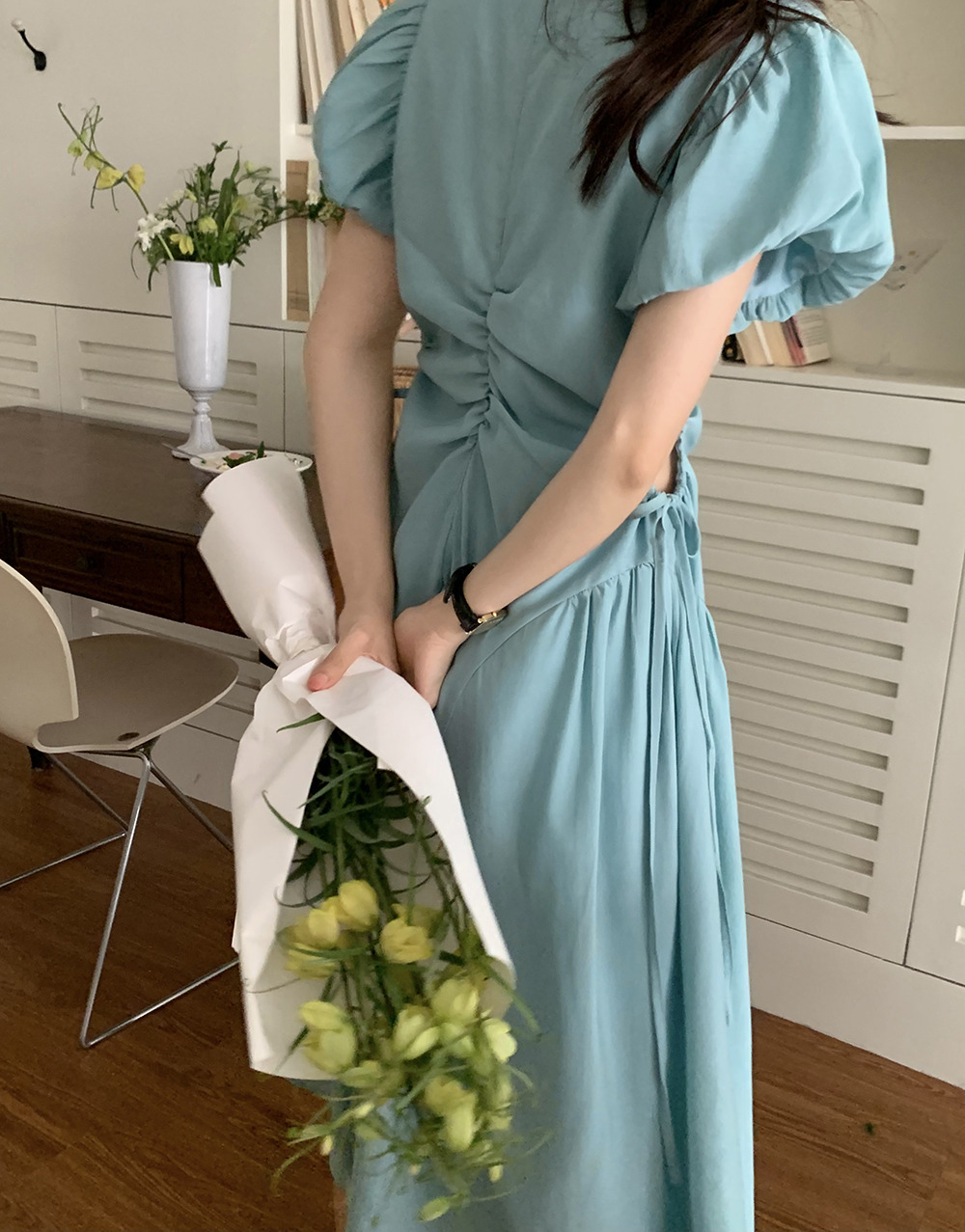 可愛らしいパフスリーブと美しいフレアシルエットが女性らしさを演出。