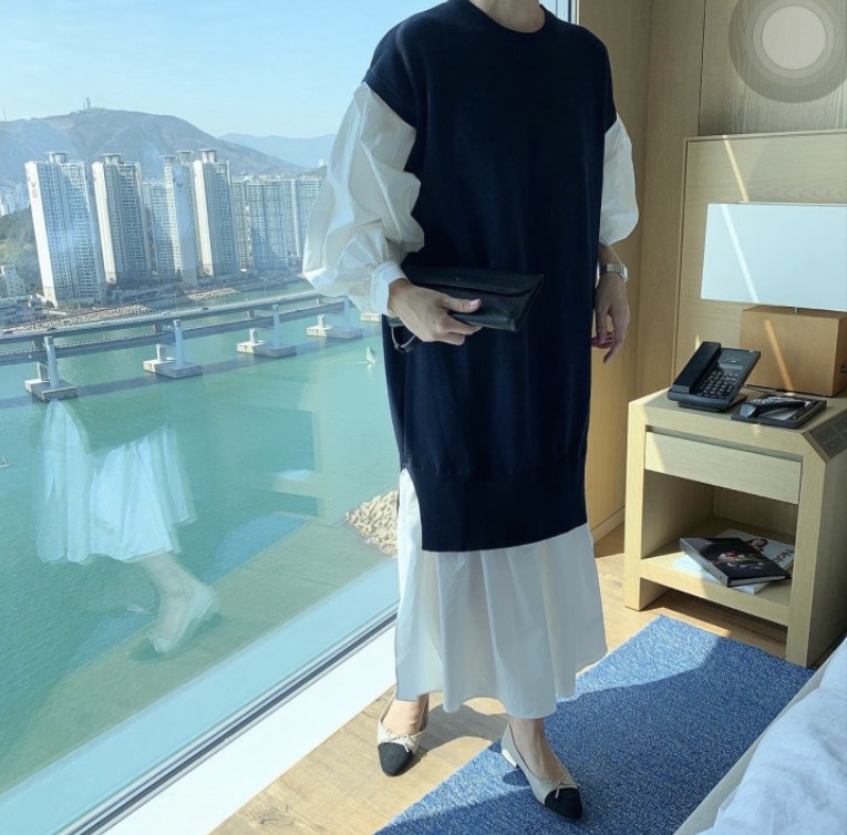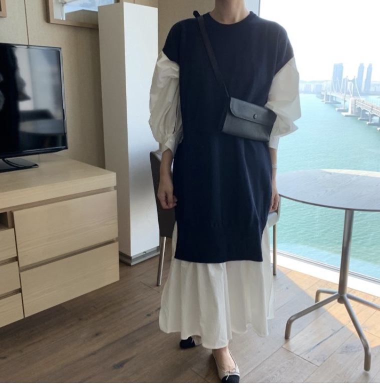 今季注目の重ね着風デザインが魅力的なフレアロングワンピース。