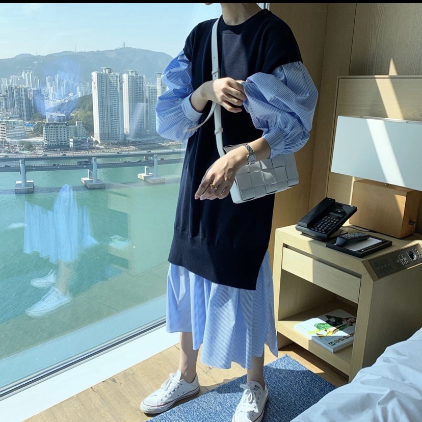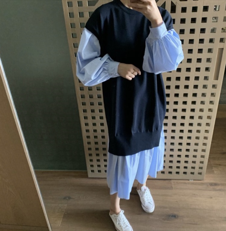 上品なネイビーとホワイトの配色で、一枚でこなれ感のある着こなしが完成。