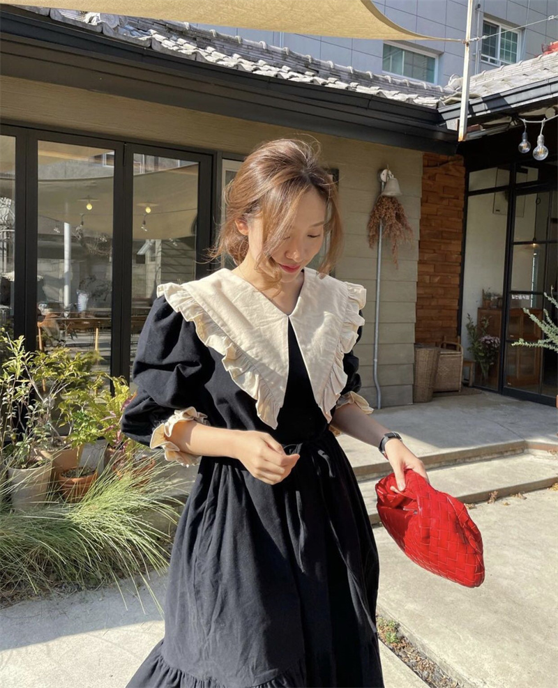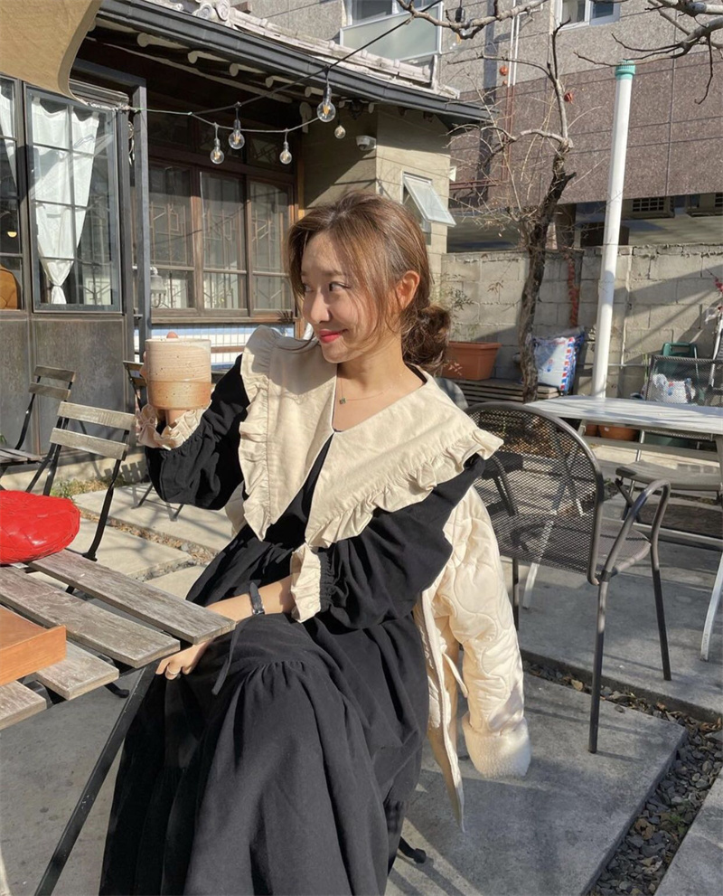 大きなフリル襟とウエストリボンが女性らしさを演出し、若々しい印象に。